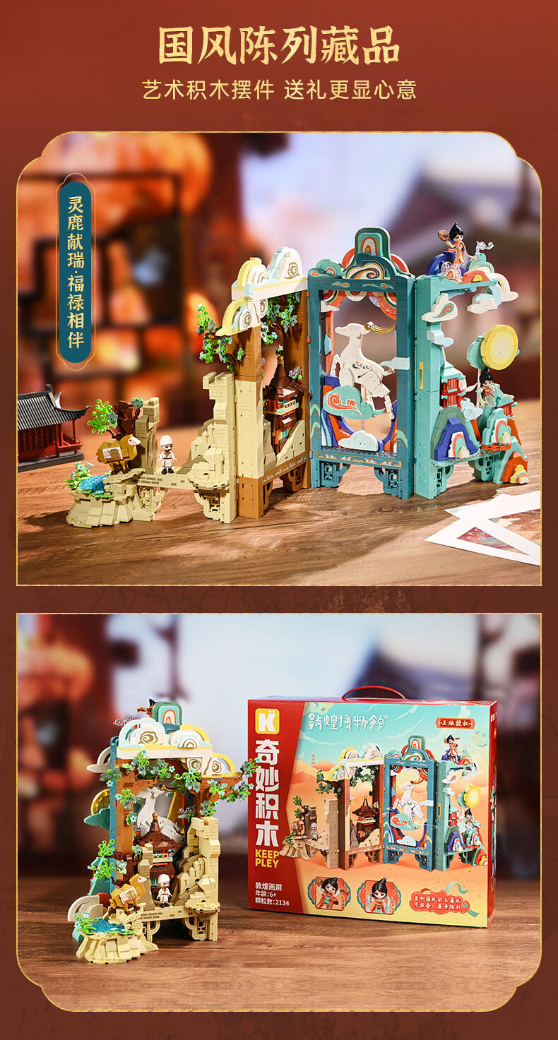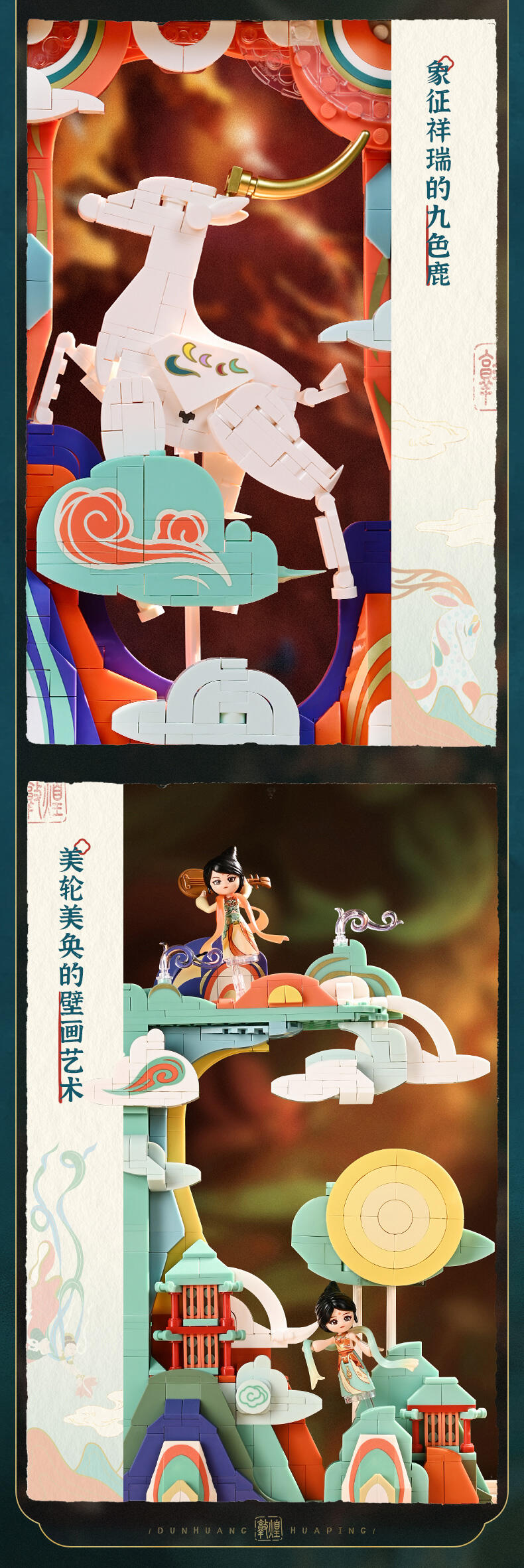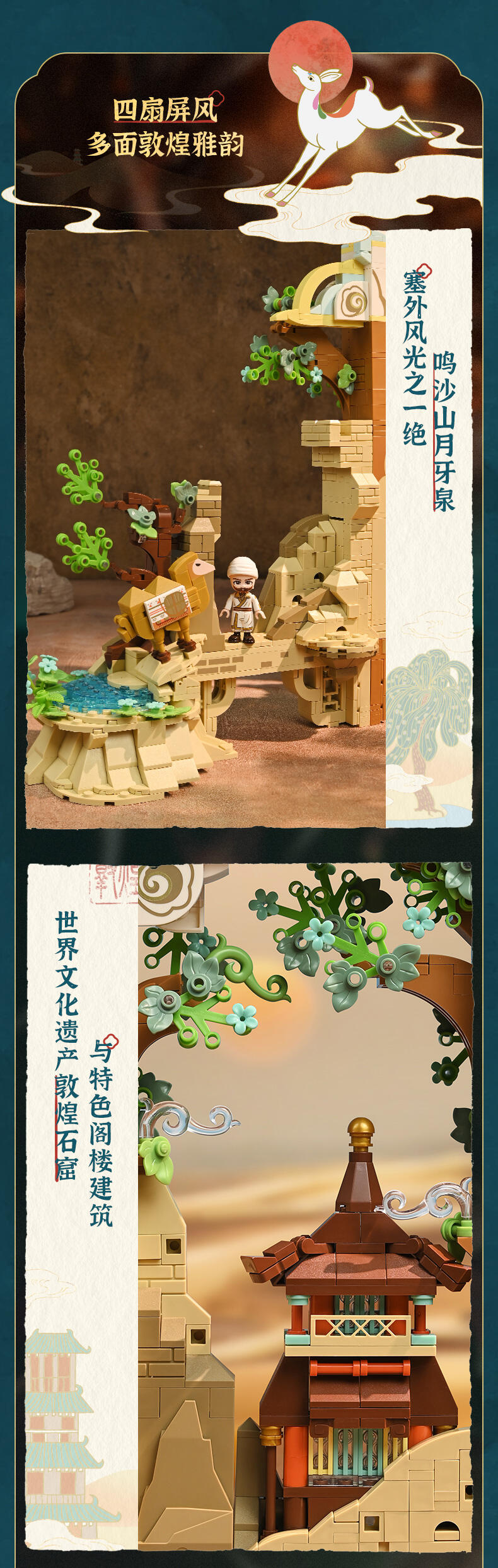 1. The Dunhuang Museum is exclusively authorized to create traditional Chinese style building block screen ornaments, which possess historical and cultural significance as well as Eastern artistic beauty; 2. The four screen theme transitions from Dunhuang's realistic scenery to Dunhuang's classic murals, which can be folded and unfolded for display. After folding, different themes are presented on both sides. On one hand, there is the Dunhuang style (Silk Road), and on the other hand, there is Dunhuang art (Nine Colored Deer Flying Apsaras). 3. Through the projection of lighting, the irregular hollow patterns on the screen will present a unique Dunhuang silhouette.