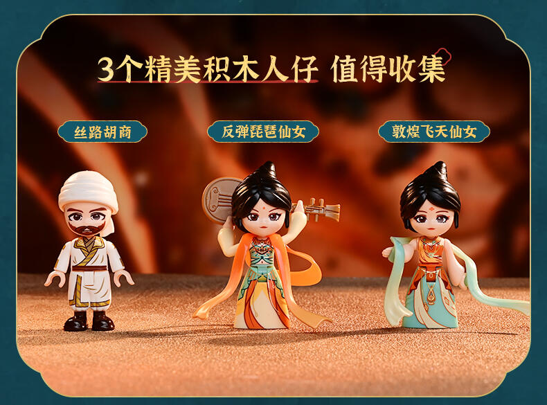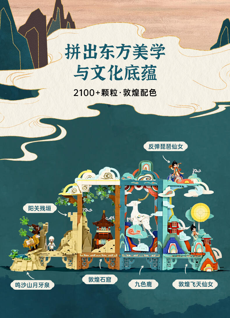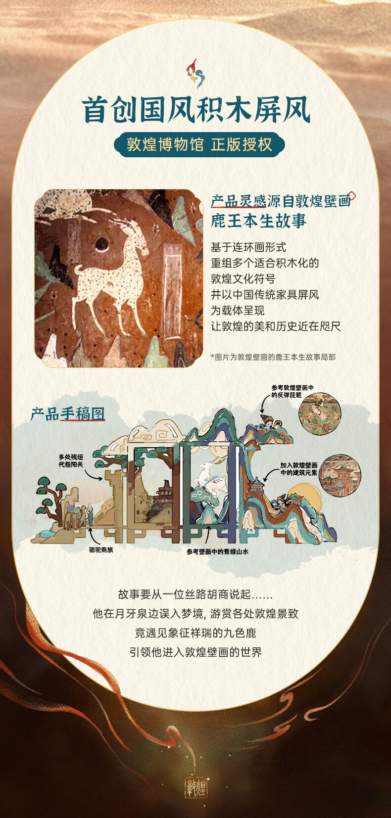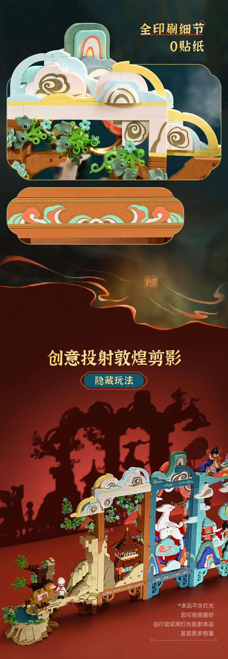 1. The Dunhuang Museum is exclusively authorized to create traditional Chinese style building block screen ornaments, which possess historical and cultural significance as well as Eastern artistic beauty; 2. The four screen theme transitions from Dunhuang's realistic scenery to Dunhuang's classic murals, which can be folded and unfolded for display. After folding, different themes are presented on both sides. On one hand, there is the Dunhuang style (Silk Road), and on the other hand, there is Dunhuang art (Nine Colored Deer Flying Apsaras). 3. Through the projection of lighting, the irregular hollow patterns on the screen will present a unique Dunhuang silhouette.