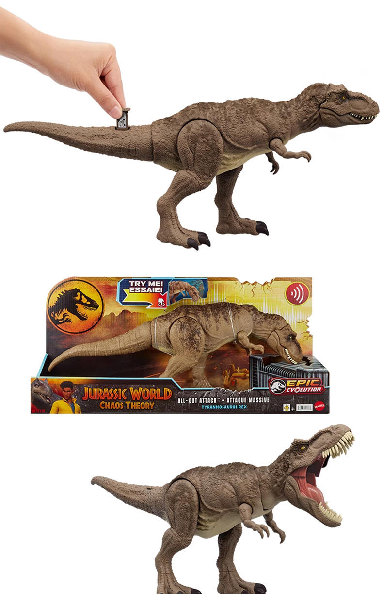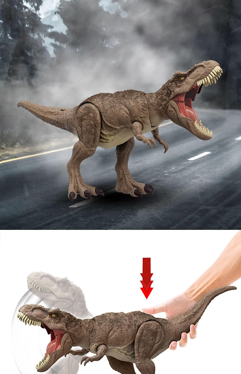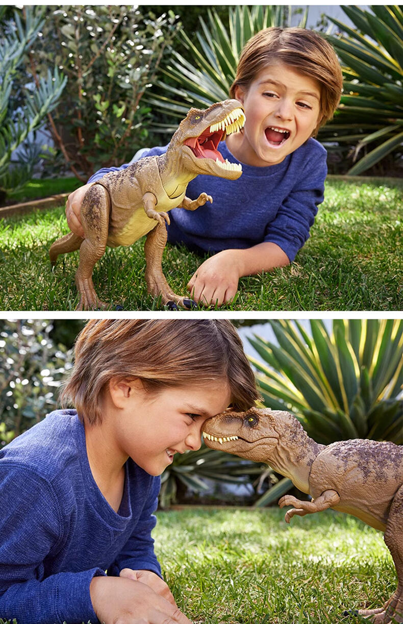 最经典的物种——霸王龙来了! 可变速地上下摇摆头部,并发出不同程度的怒吼声 牙齿更长,更加锋利,助力霸王龙进行全力攻击 DNA芯片:拉出恐龙背部芯片, 使用Jurassic World Facts app 扫描二维码,即可了解恐龙知识,大玩AR游戏