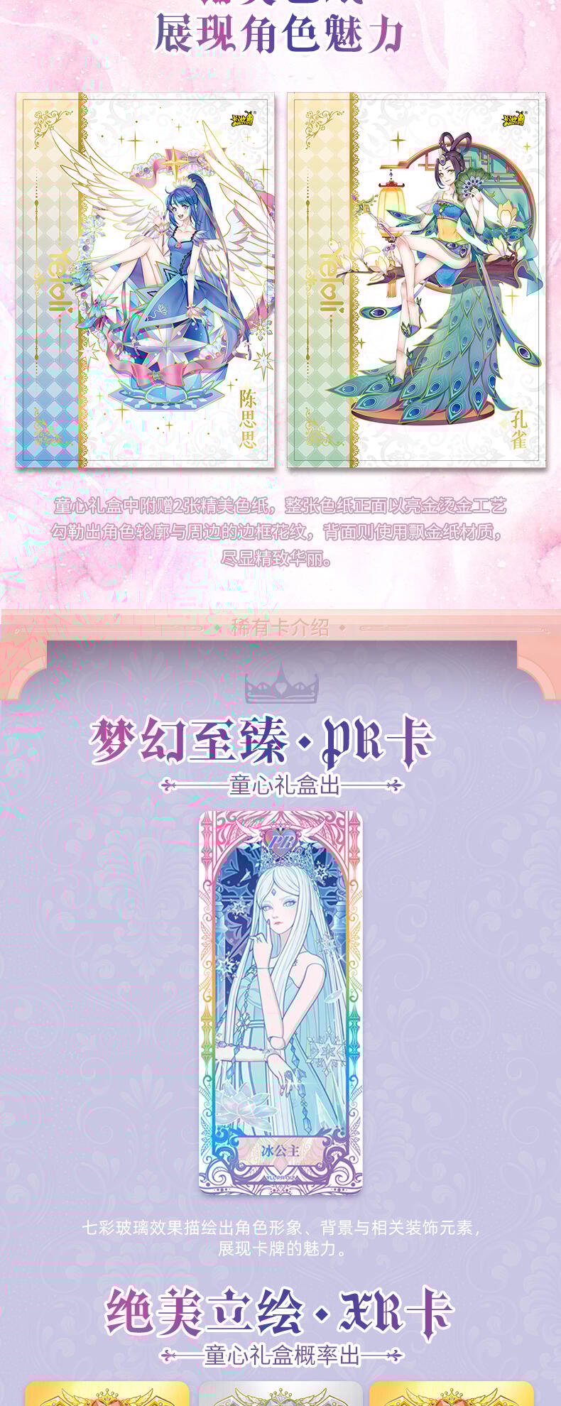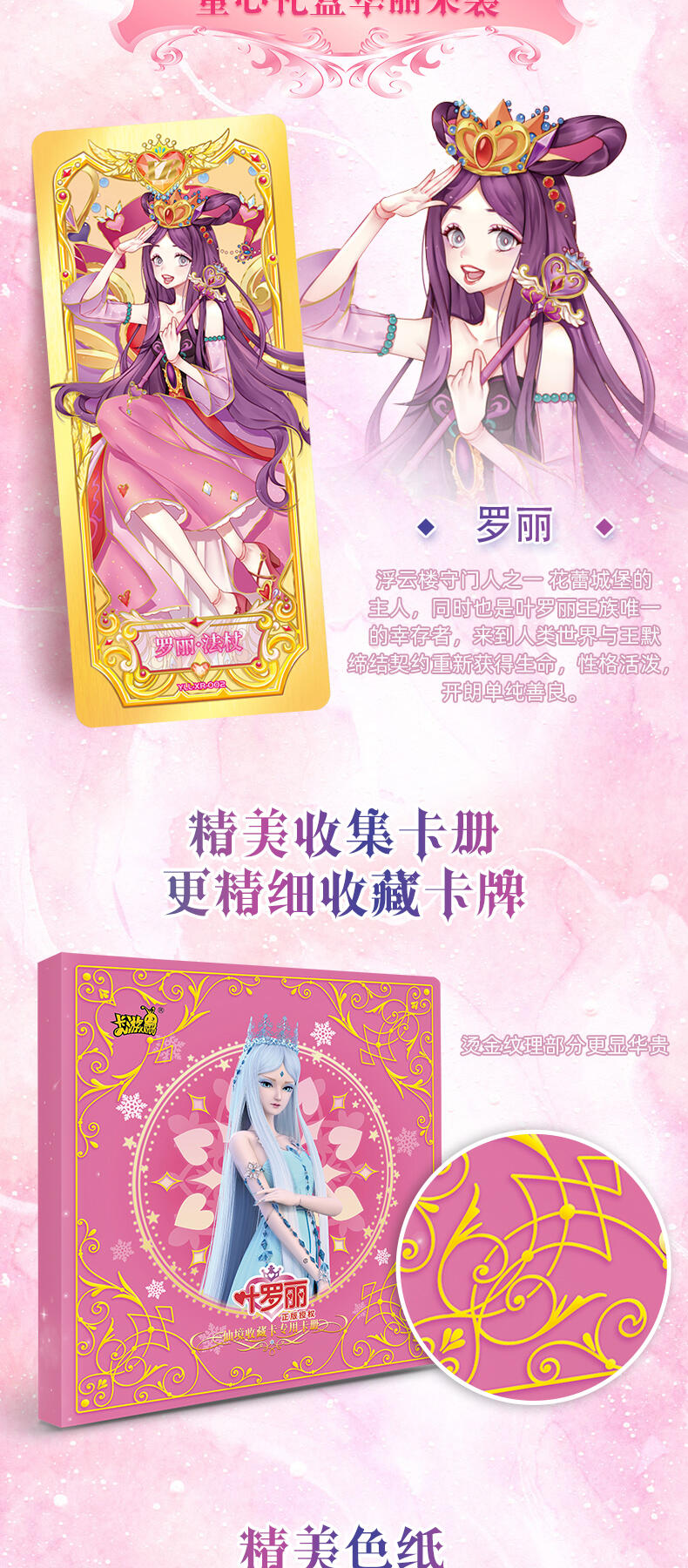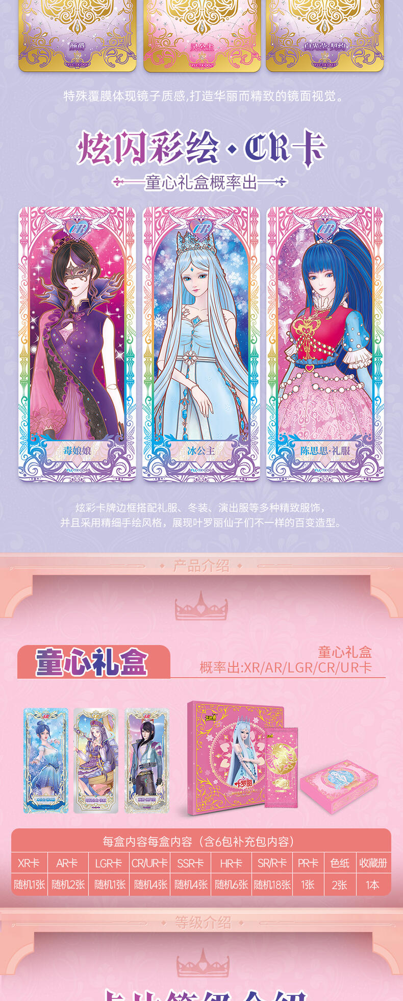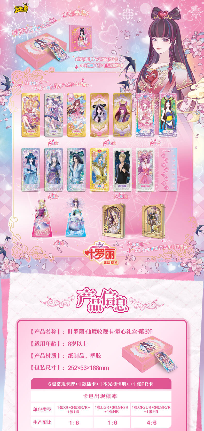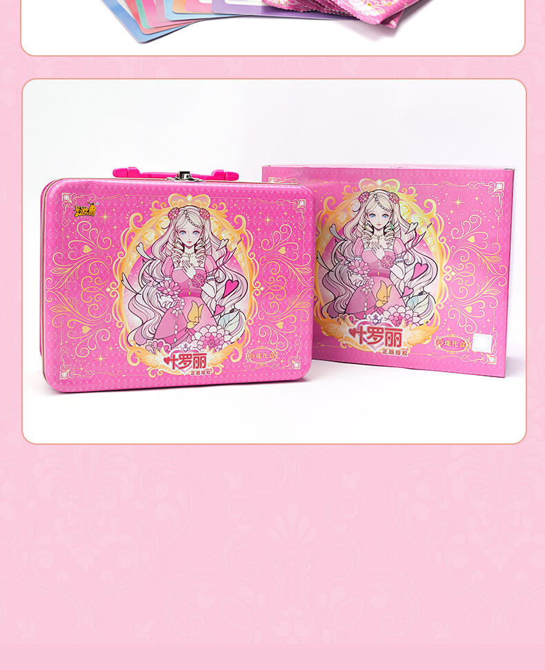 叶罗丽-仙境收藏卡-童心礼盒梦幻来袭。粉嫩配色外盒搭配精细烫金工艺勾勒出华美花纹与叶罗丽logo,尽显精致华丽。礼盒包含卡包、卡册、色纸、赠送卡等丰富内容,更有概率获得绝美立绘XR卡与彩晶冰霜AR卡这两种全新面市的高稀有度卡牌。童心礼盒每盒包含6包卡牌+2张色纸+1本卡册+1张赠送卡