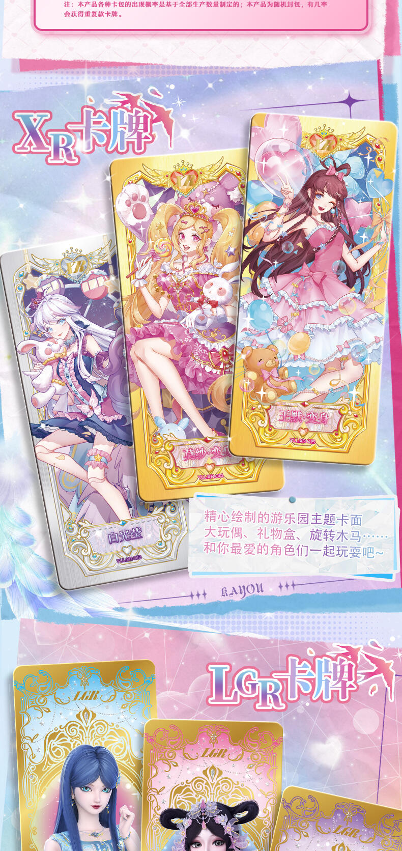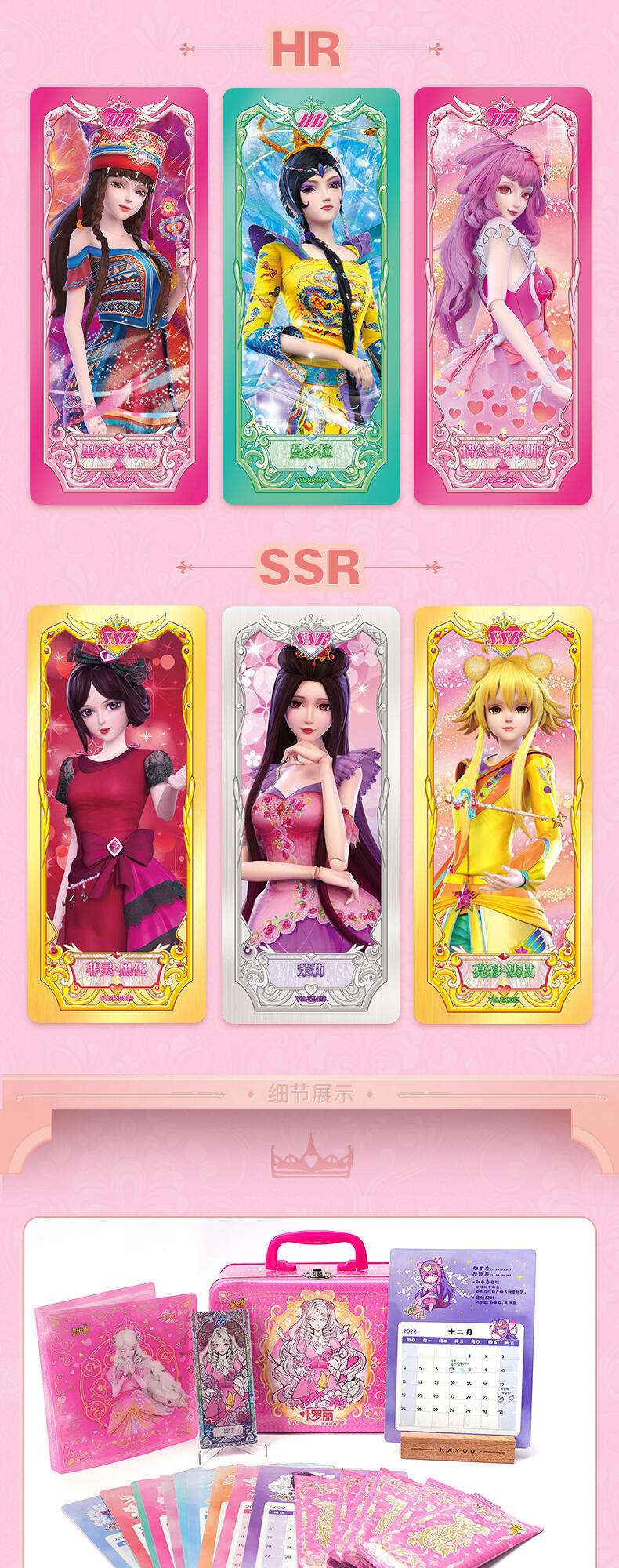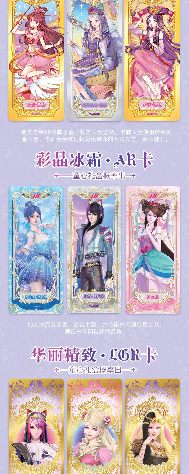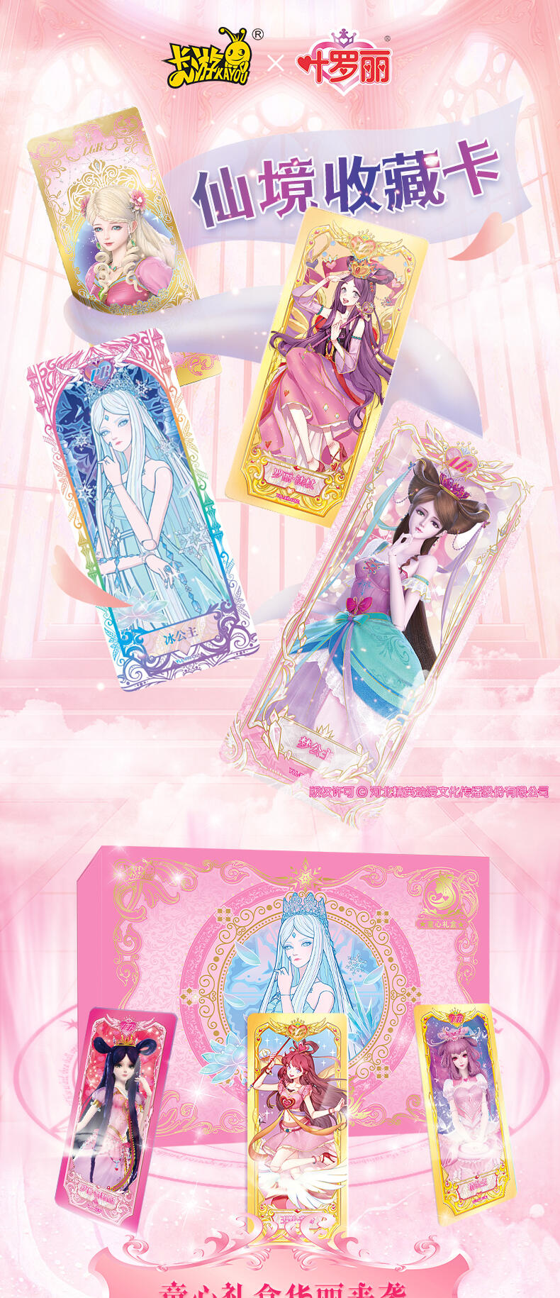 叶罗丽-仙境收藏卡-童心礼盒梦幻来袭。粉嫩配色外盒搭配精细烫金工艺勾勒出华美花纹与叶罗丽logo,尽显精致华丽。礼盒包含卡包、卡册、色纸、赠送卡等丰富内容,更有概率获得绝美立绘XR卡与彩晶冰霜AR卡这两种全新面市的高稀有度卡牌。童心礼盒每盒包含6包卡牌+2张色纸+1本卡册+1张赠送卡