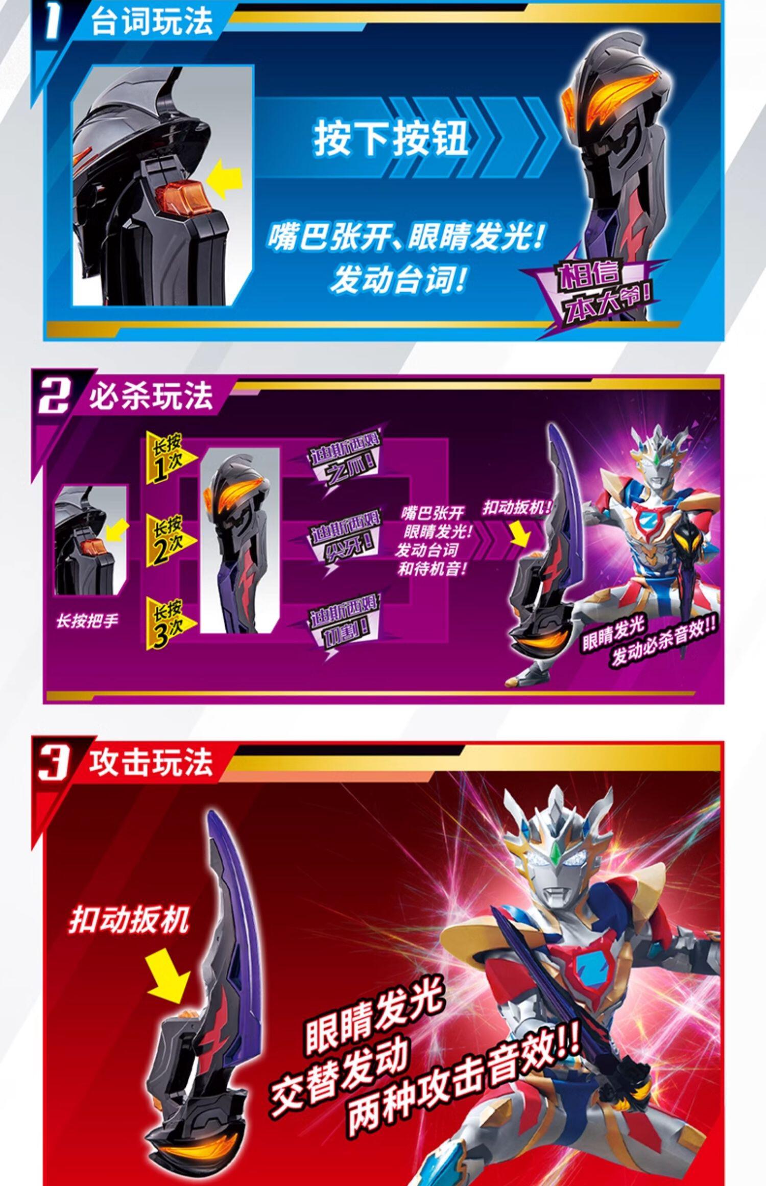 幻界魔剑贝利亚黄昏拥有3种玩法,按下把手,嘴巴张开,眼睛发光,发动台词,长按把手后,可发动必杀技音效,按下把手,交替发动两种攻击音效。手持最强之力,与贝利亚黄昏一起战斗吧!