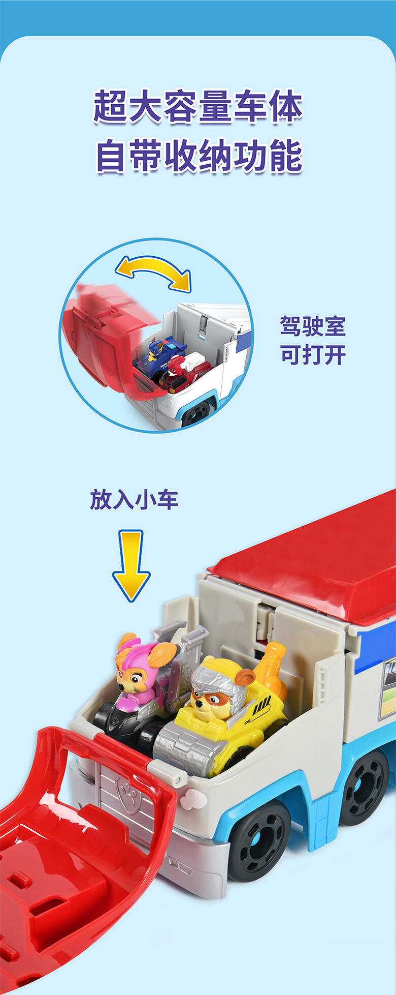 3. 大型救援车具备收纳功能:驾驶室可打开,并放入小车。配上超大容量的车厢,最多可收纳6辆救援小队系列赛车;