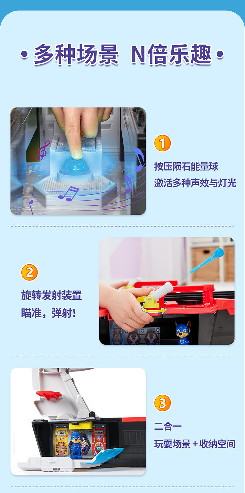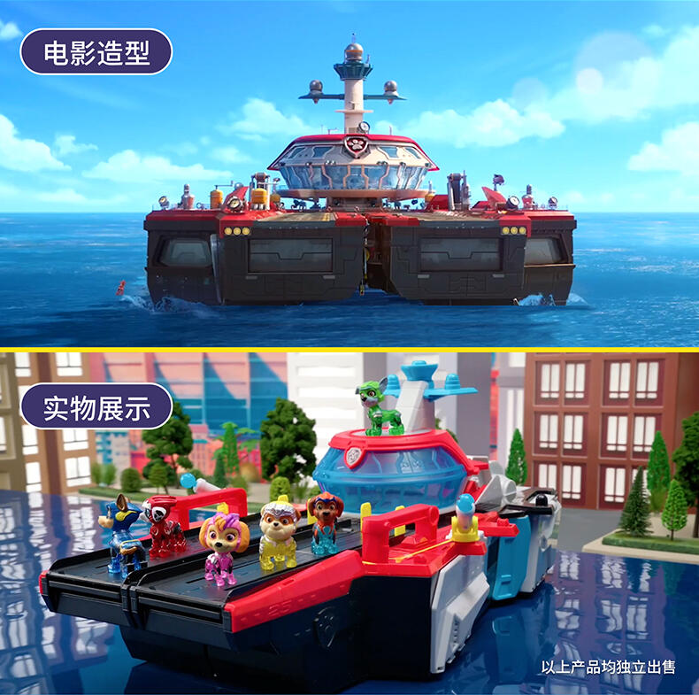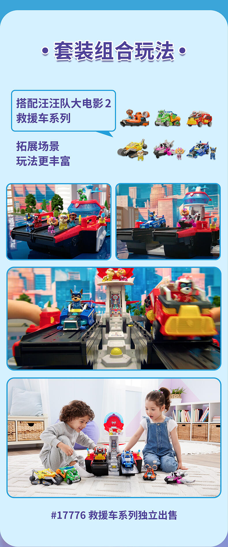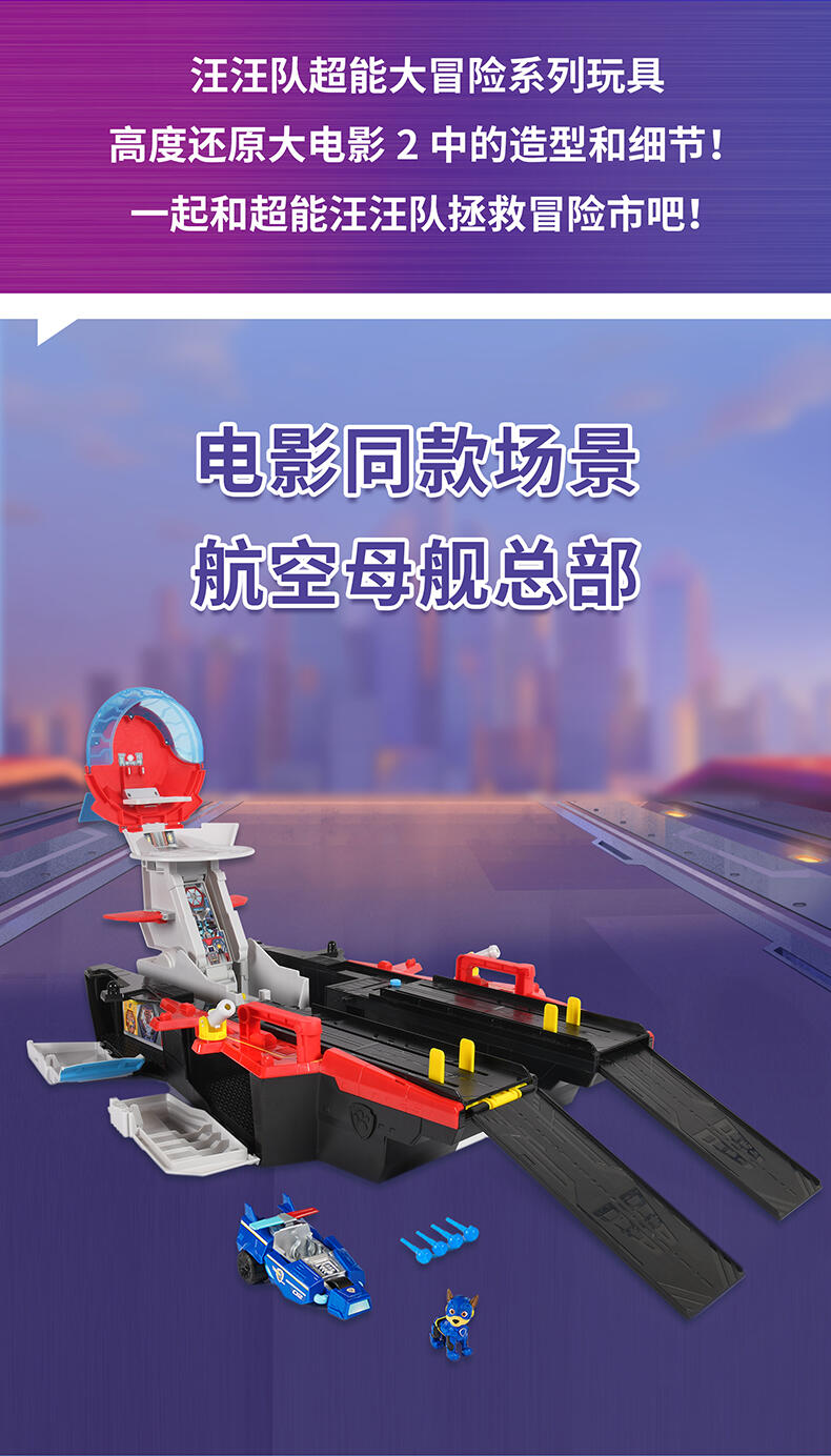 2. 超大型航空母舰总部,高度还原动画电影中的造型和细节,配有一辆阿奇超能救援车(没有声光功能)和一只阿奇玩偶;