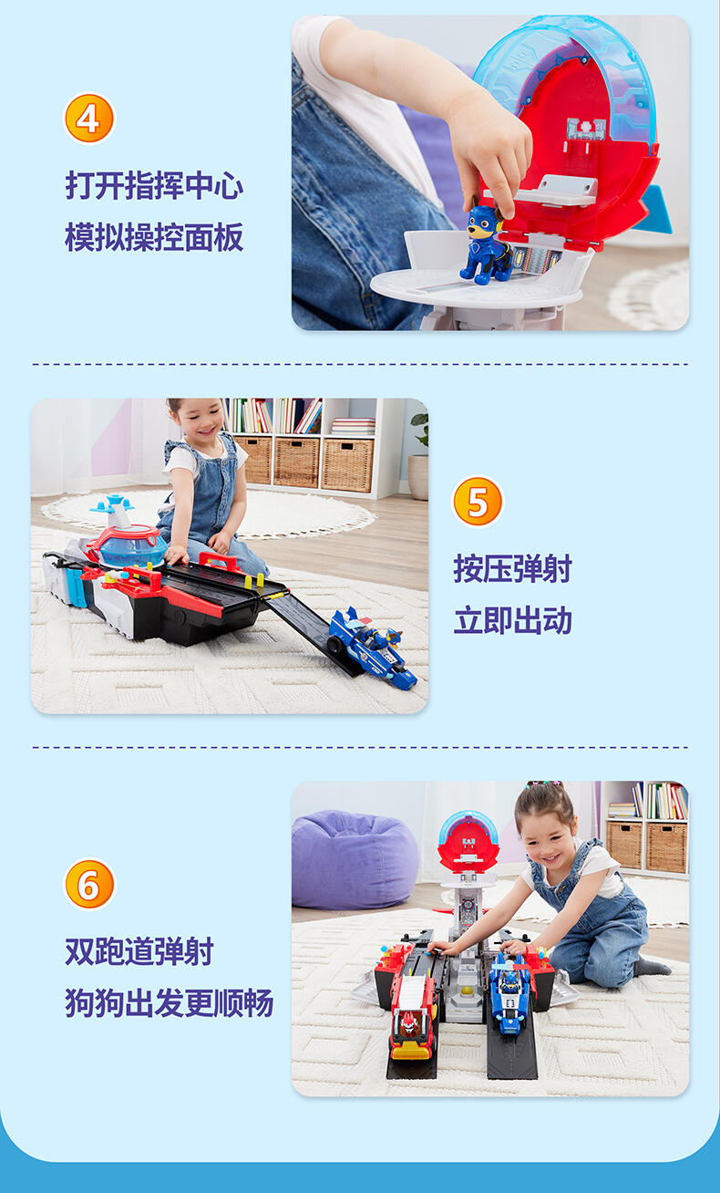6. 将阿奇超能救援车放在跑道上,按下按钮,立即出发救援!两条跑道都能放上救援车并使其弹射出发哦!收起跑道,即可让狗狗们重新出发;