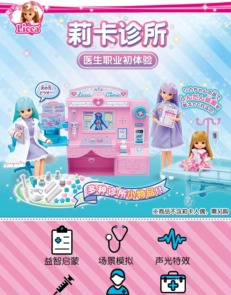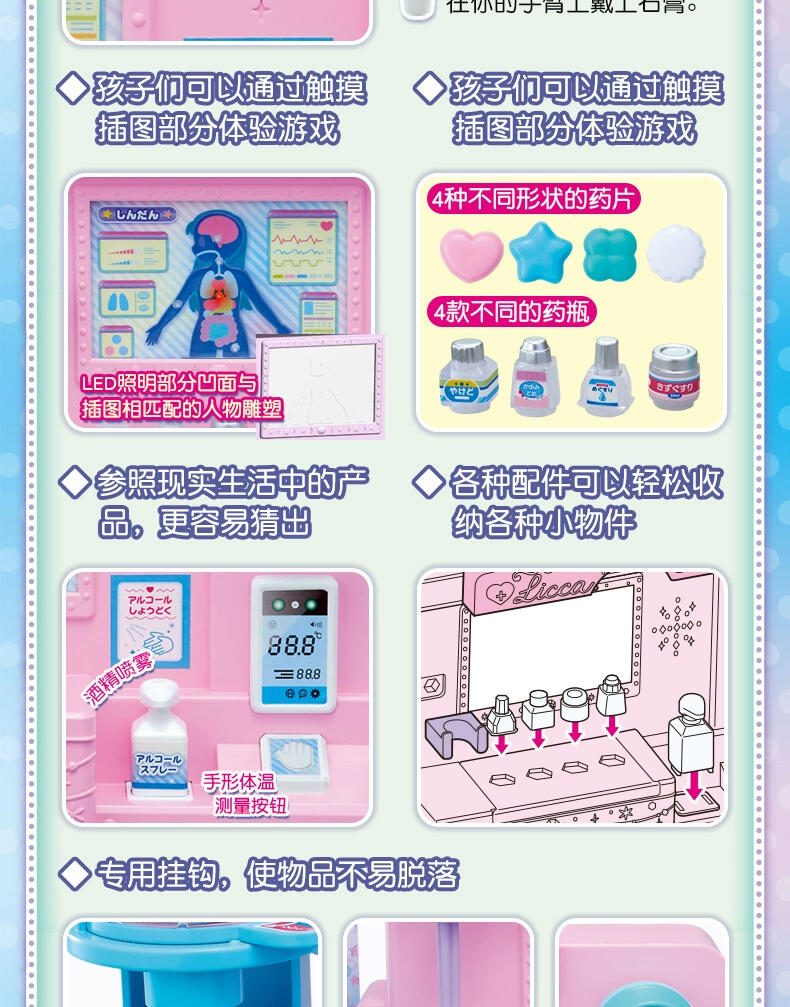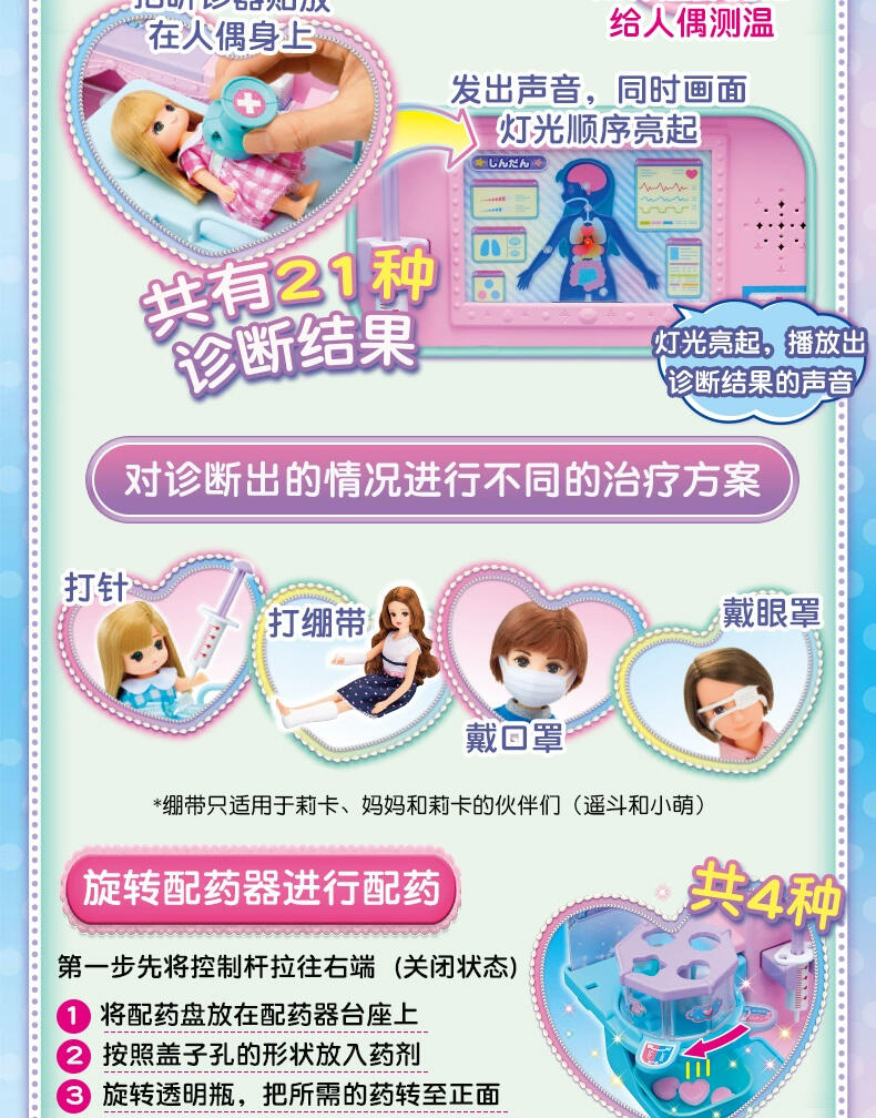 1) 通过莉卡诊所,亲身体验医生的职业,随机出现共21种诊断结果,发光发声功能。