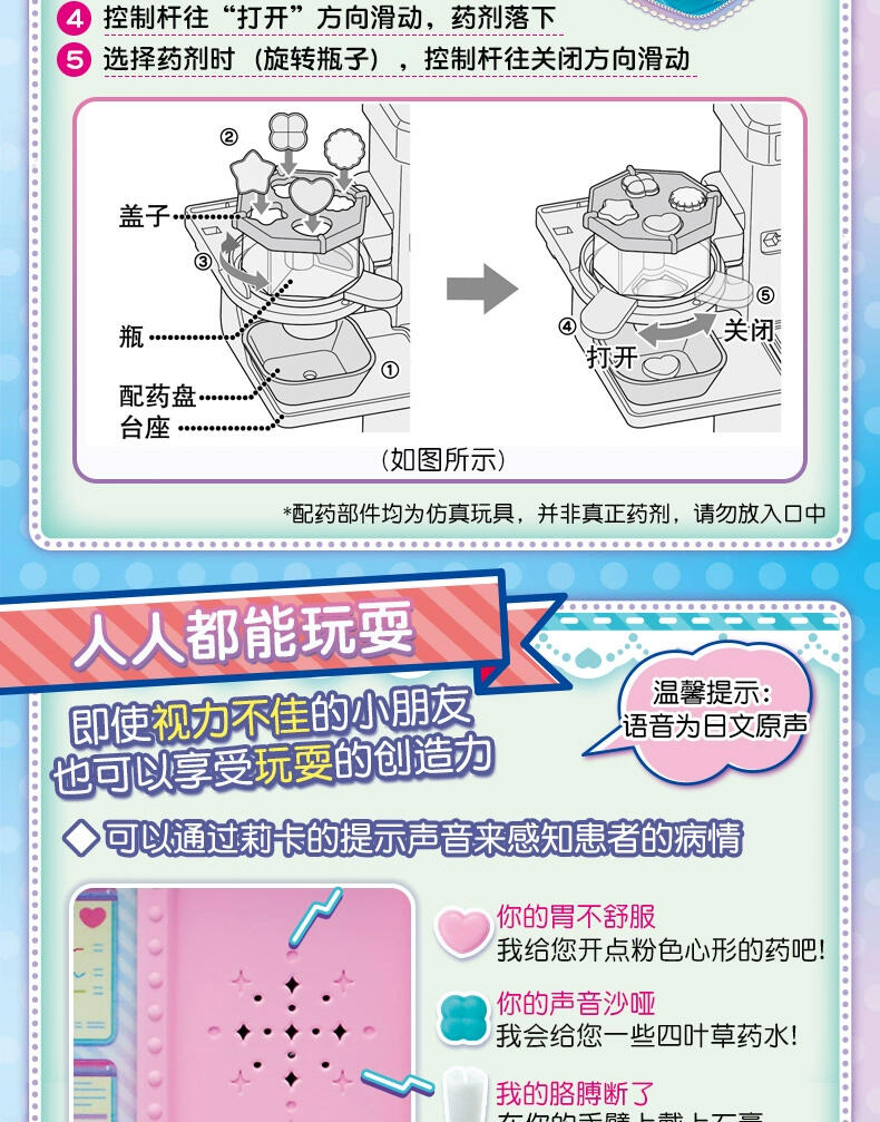 3) 人人都能玩耍,更贴合实际用品的外型,易于区分的药品形状,即使盲人也能玩耍!