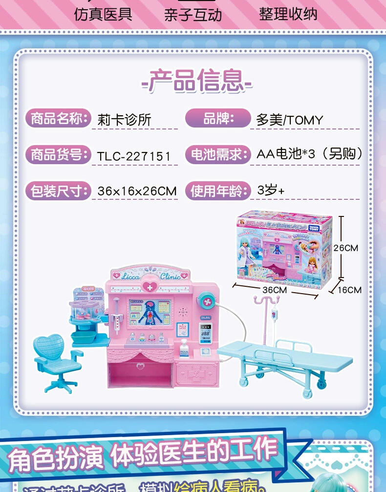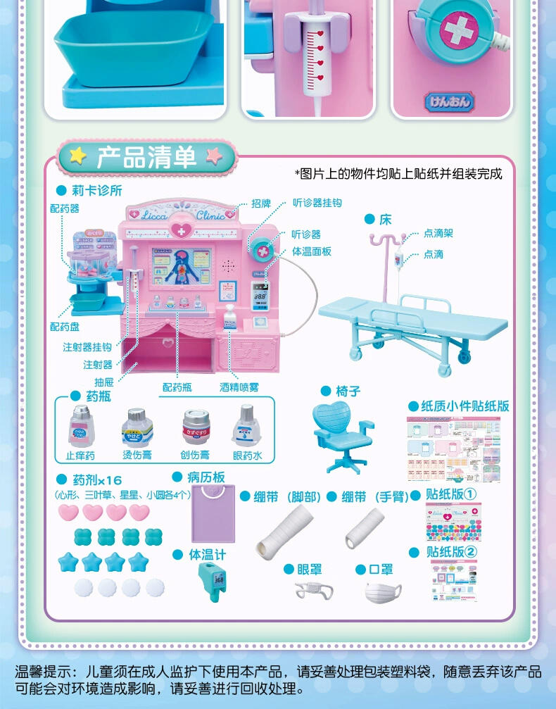 2) 内含孩子们反复想玩的“听诊器”和“配药器”逼真的“医疗配件”使医生游戏更生动!