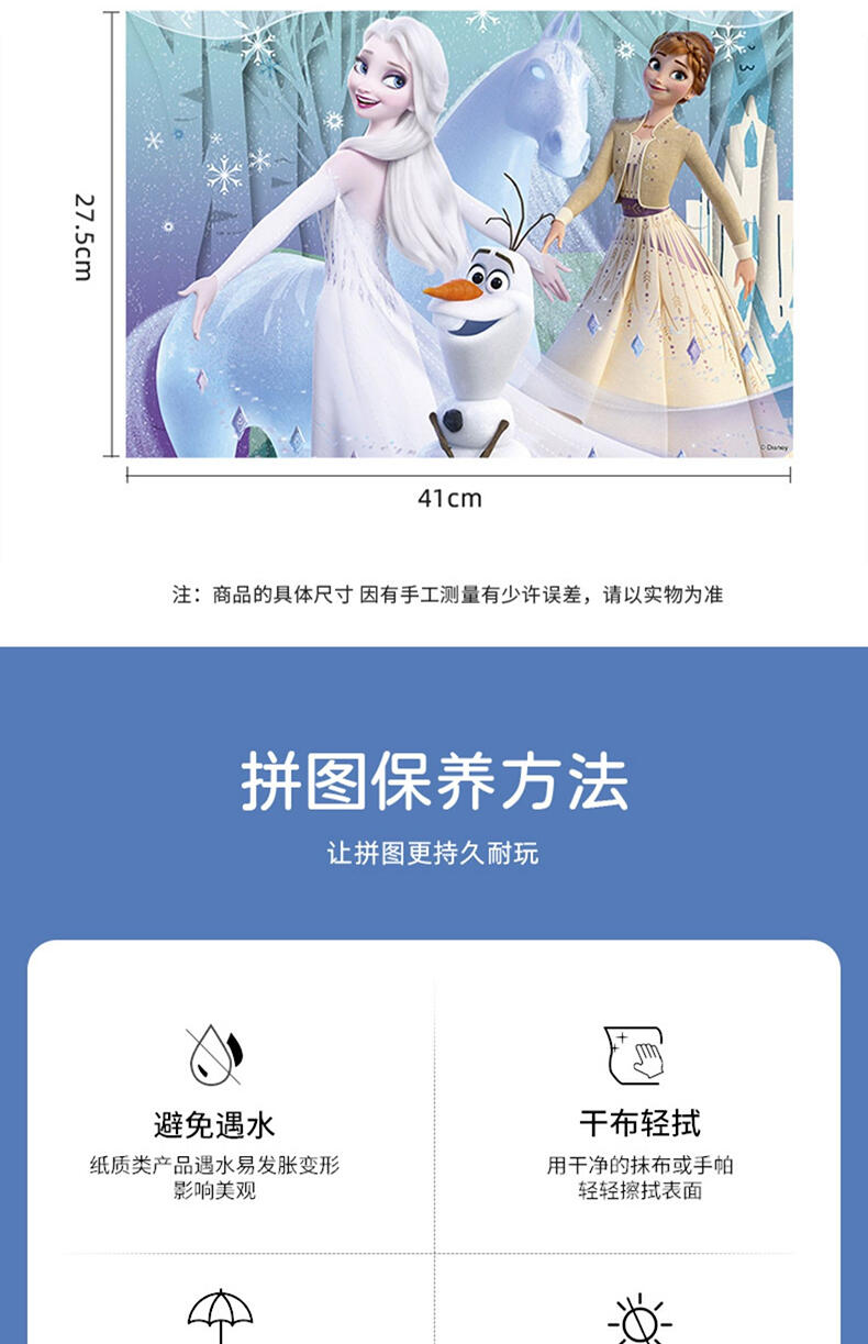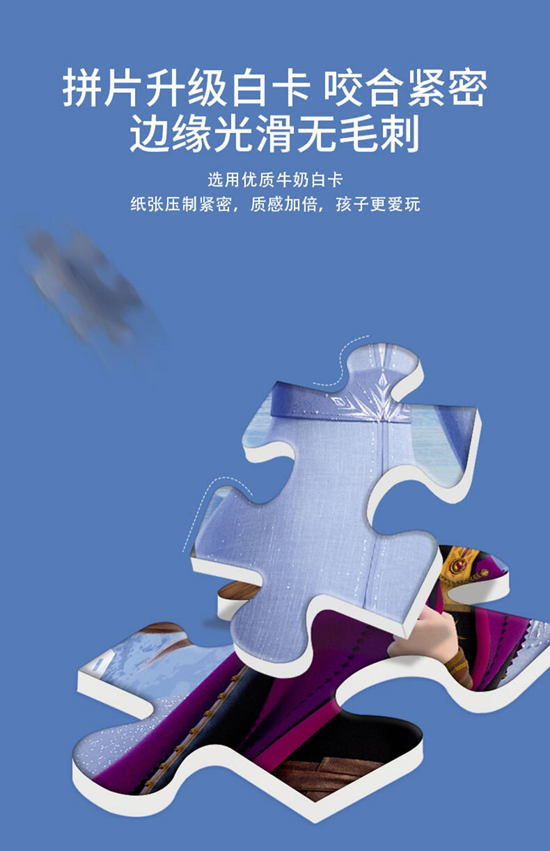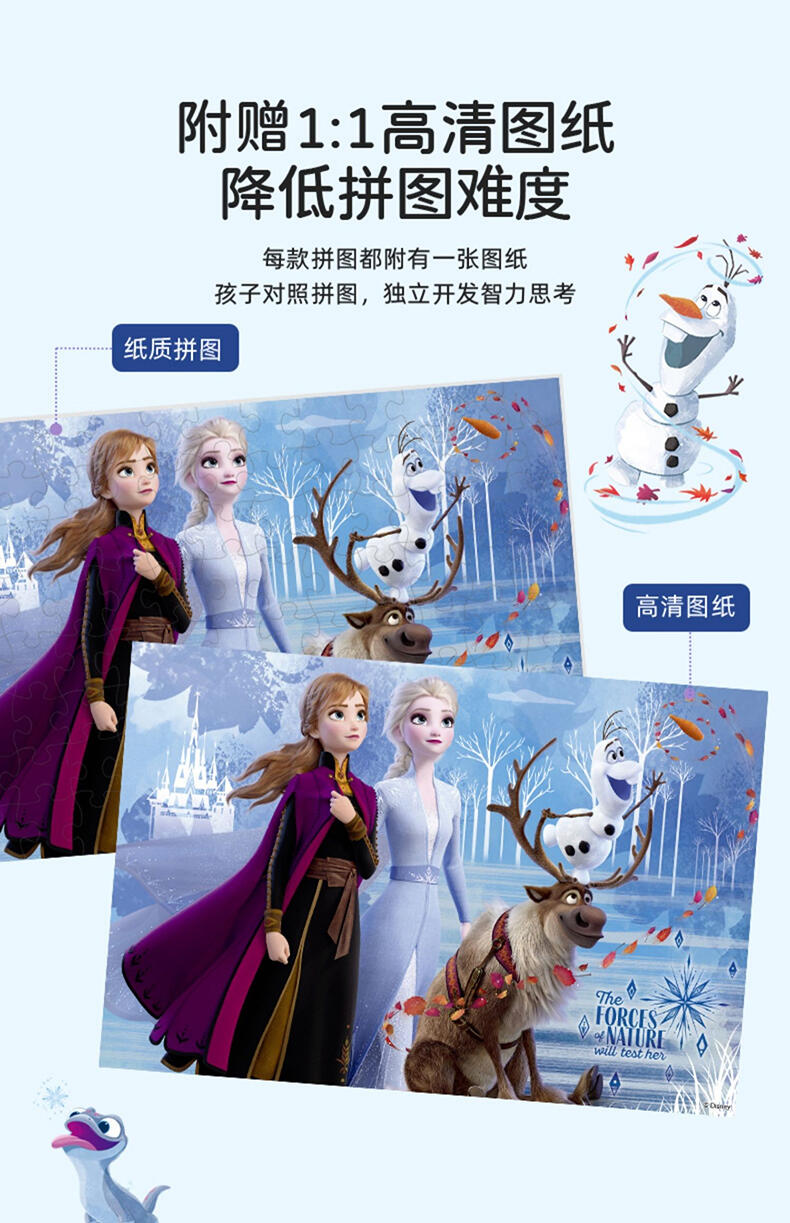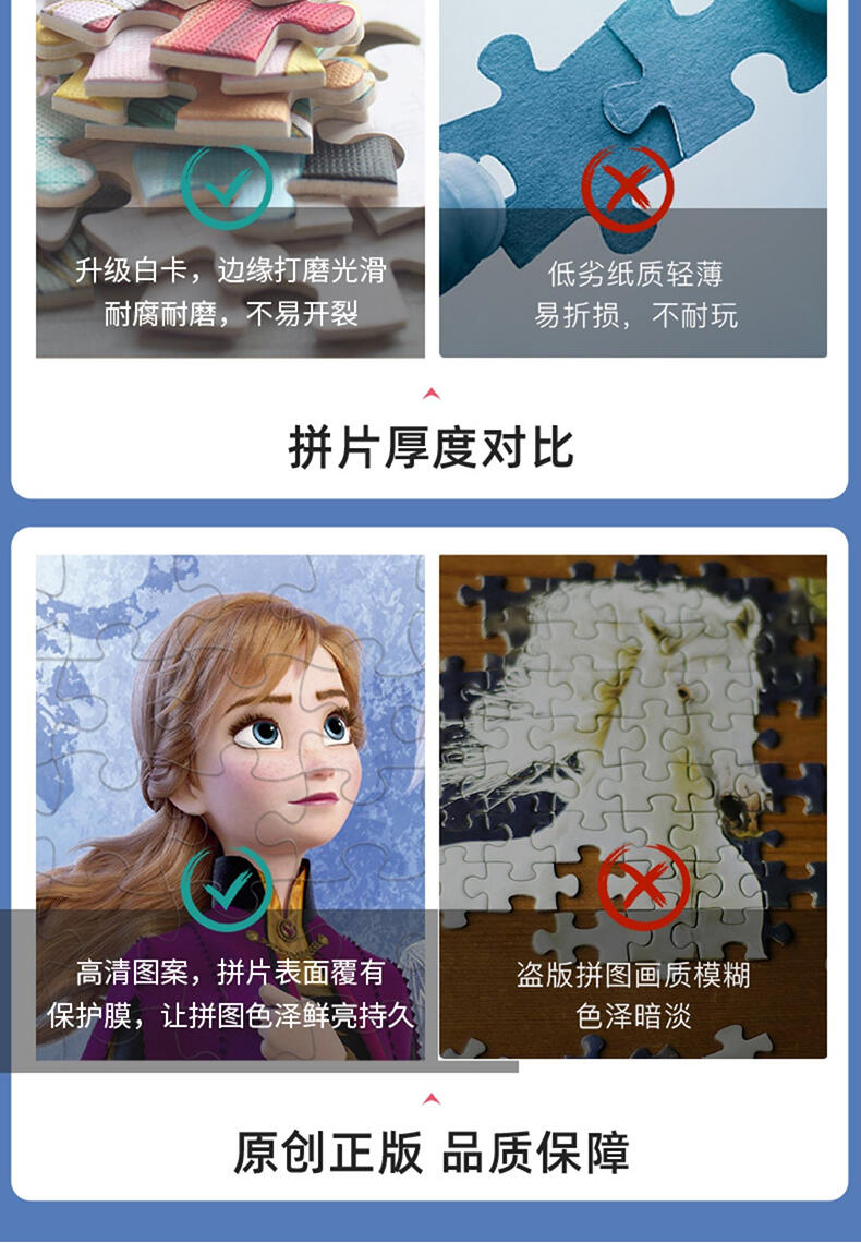 正版授权IP-冰雪奇缘,高清画质,趣味场景;采用优质白卡材质,拼片光滑无毛刺,品质优良,手感舒适;包装内1:1高清图纸,方便对照,玩起来更轻松;印刷清晰,色彩明亮;拼玩过程动手动脑,锻炼手脑灵活