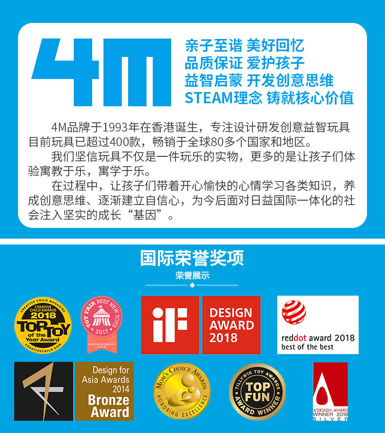 4M科文实业于1993年成立于香港,专注益智玩具的设计与研发,经过20多年的历史沉淀,4M产品超过400多款,种类横跨环保科学、动力机器人、考古历史、太空天文和美术创意等,畅销全球80多个国家和地区。