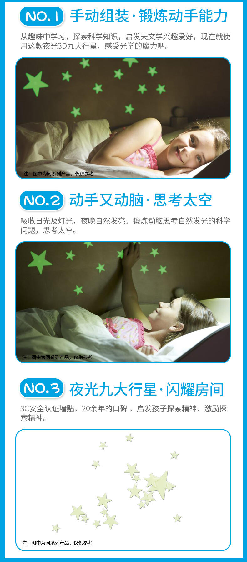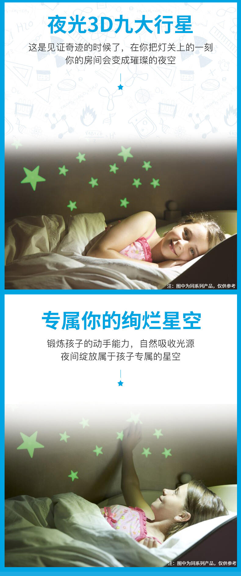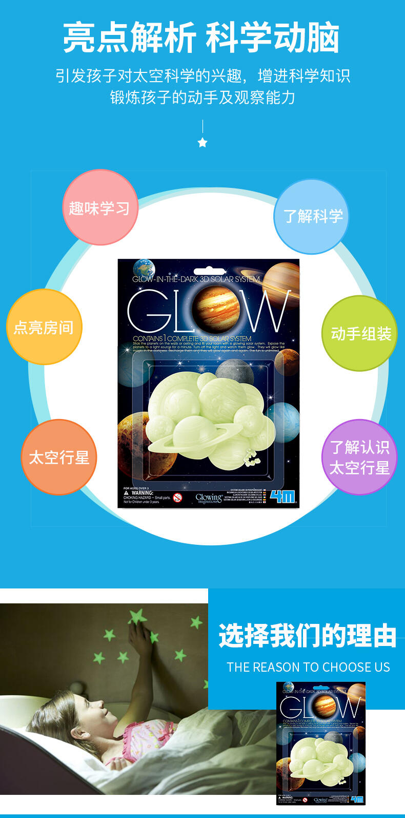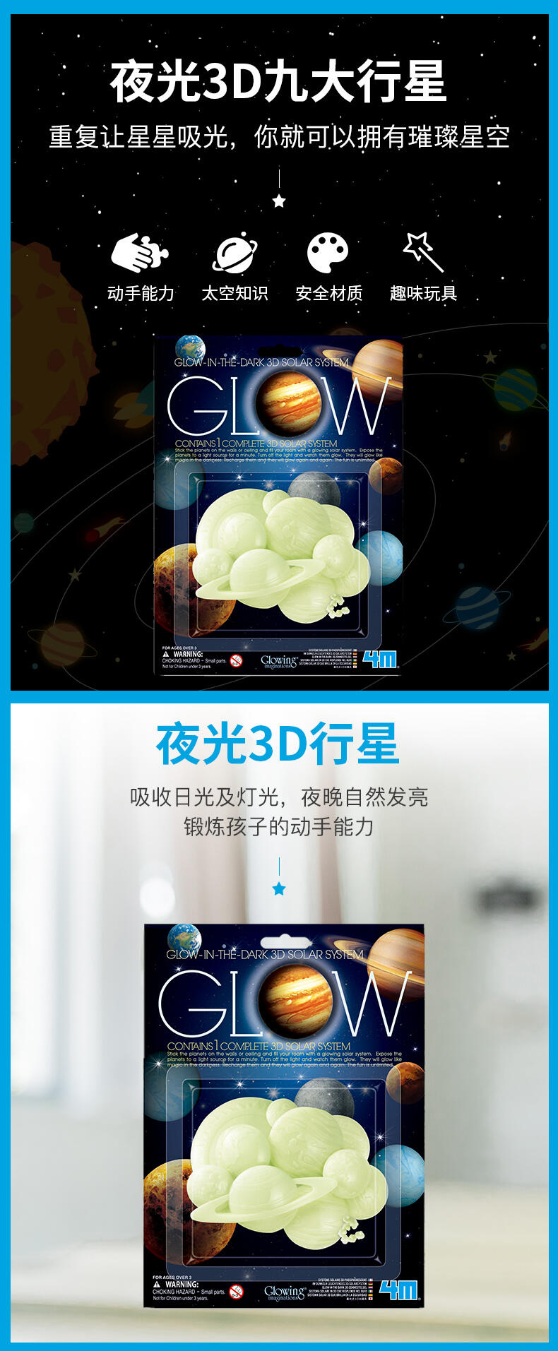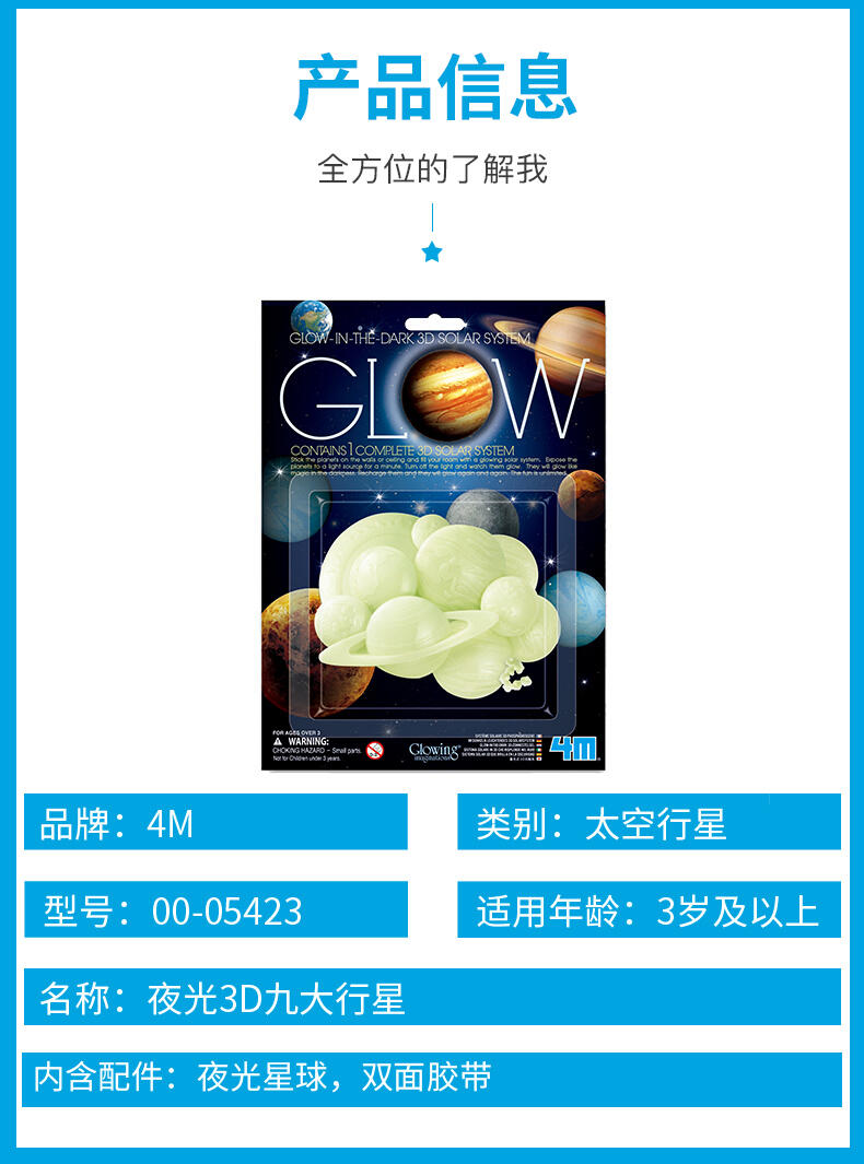 4M 夜光3D九大行星,让孩子仿佛置身在宇宙之间,被散发夜光的行星包围,是他(她)入睡前的小兴奋。夜光带点神秘,行星带着故事。产品材质:塑料。