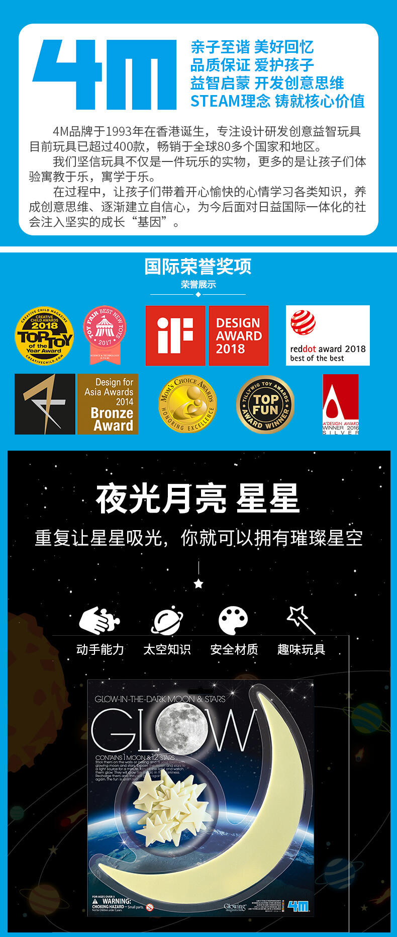 4M科文实业于1993年成立于香港,专注益智玩具的设计与研发,经过20多年的历史沉淀,4M产品超过400多款,种类横跨环保科学、动力机器人、考古历史、太空天文和美术创意等,畅销全球80多个国家和地区。