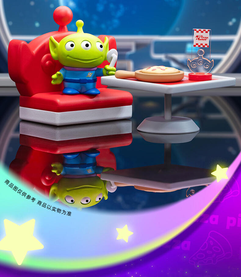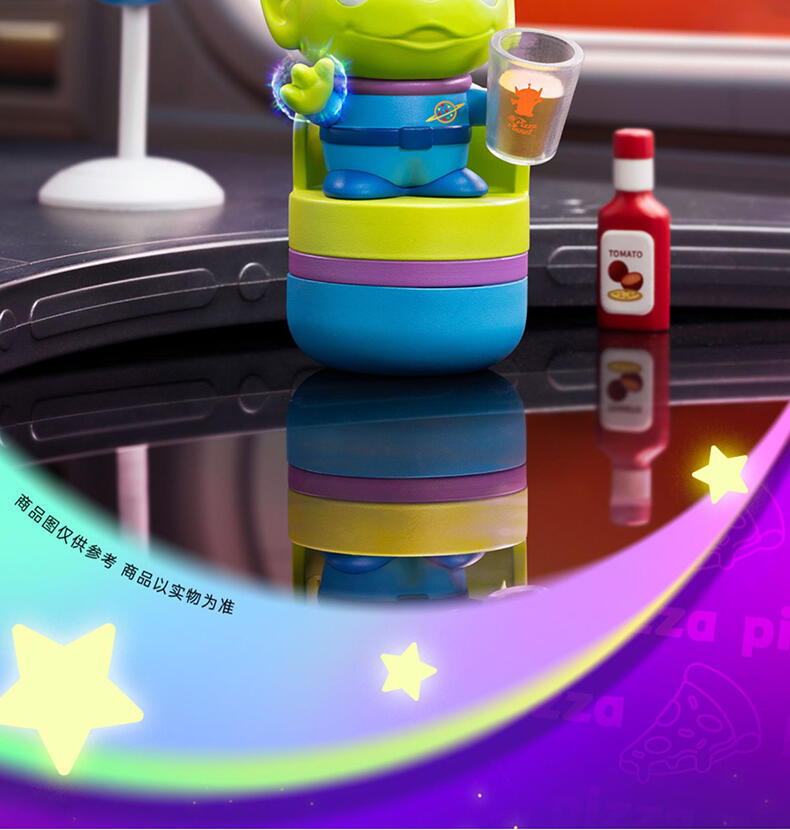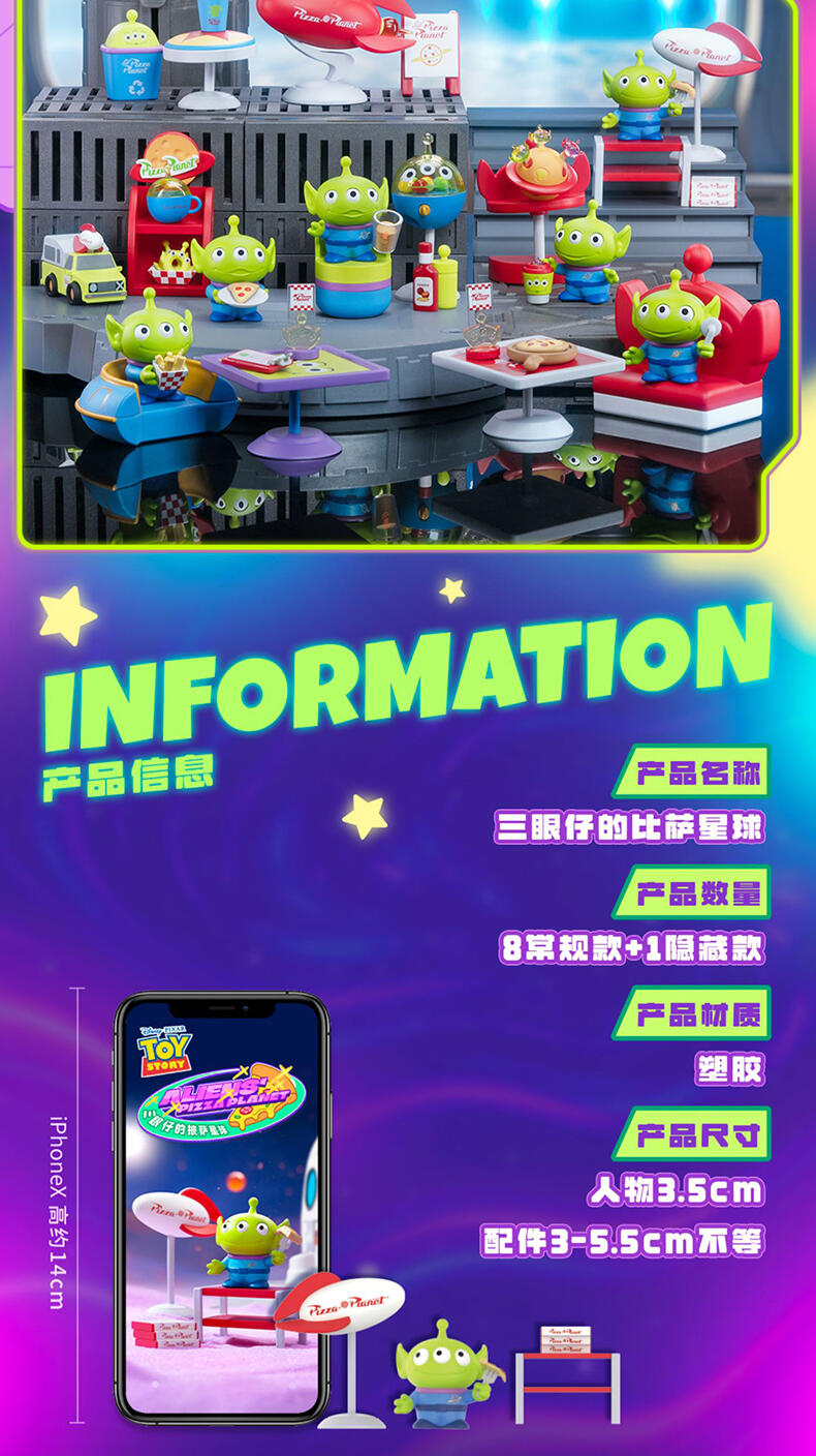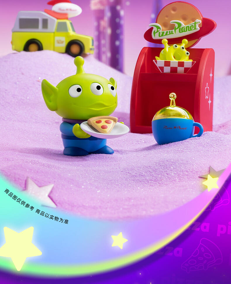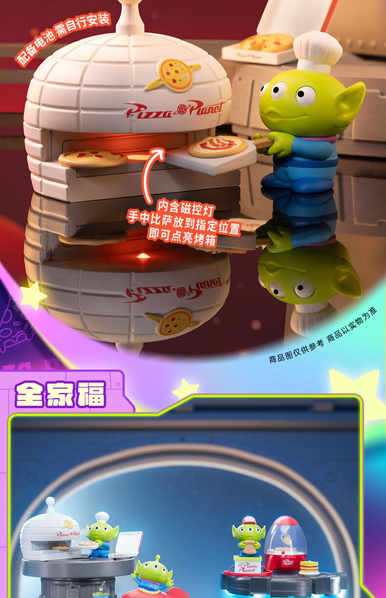 三眼仔(Alien),是玩具总动员中的一个角色。来自于比萨星球。作为玩具总动员中最受欢迎的角色之一,三眼仔深受玩家的喜爱,我们这次把披萨星球做了出来,在浩瀚的宇宙中各种能量补给站和餐车总有一款是你喜欢的,隐藏款更是增加了磁控灯的玩法,十分有趣。 三眼仔迷你尺寸,食玩大小,每款都会有很多配件,三眼仔的眼球是可动效果,黑色瞳孔可以不同位置凹造型,隐藏款比萨烤箱是磁控(热度款、工艺亮点等 灯,比萨在放到箭头位置时可以点亮烤箱,会配电池单独放置,玩家自行组装包装会同草莓熊的房间一样,可以叠成小房子,有场景背景,更加丰富玩法