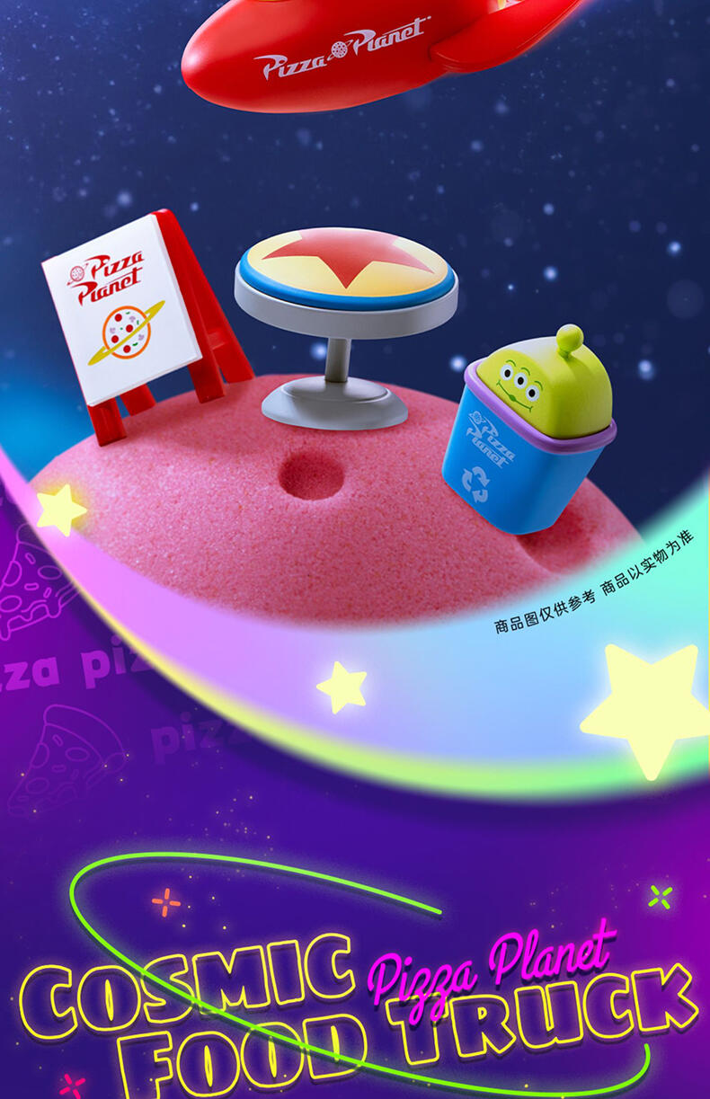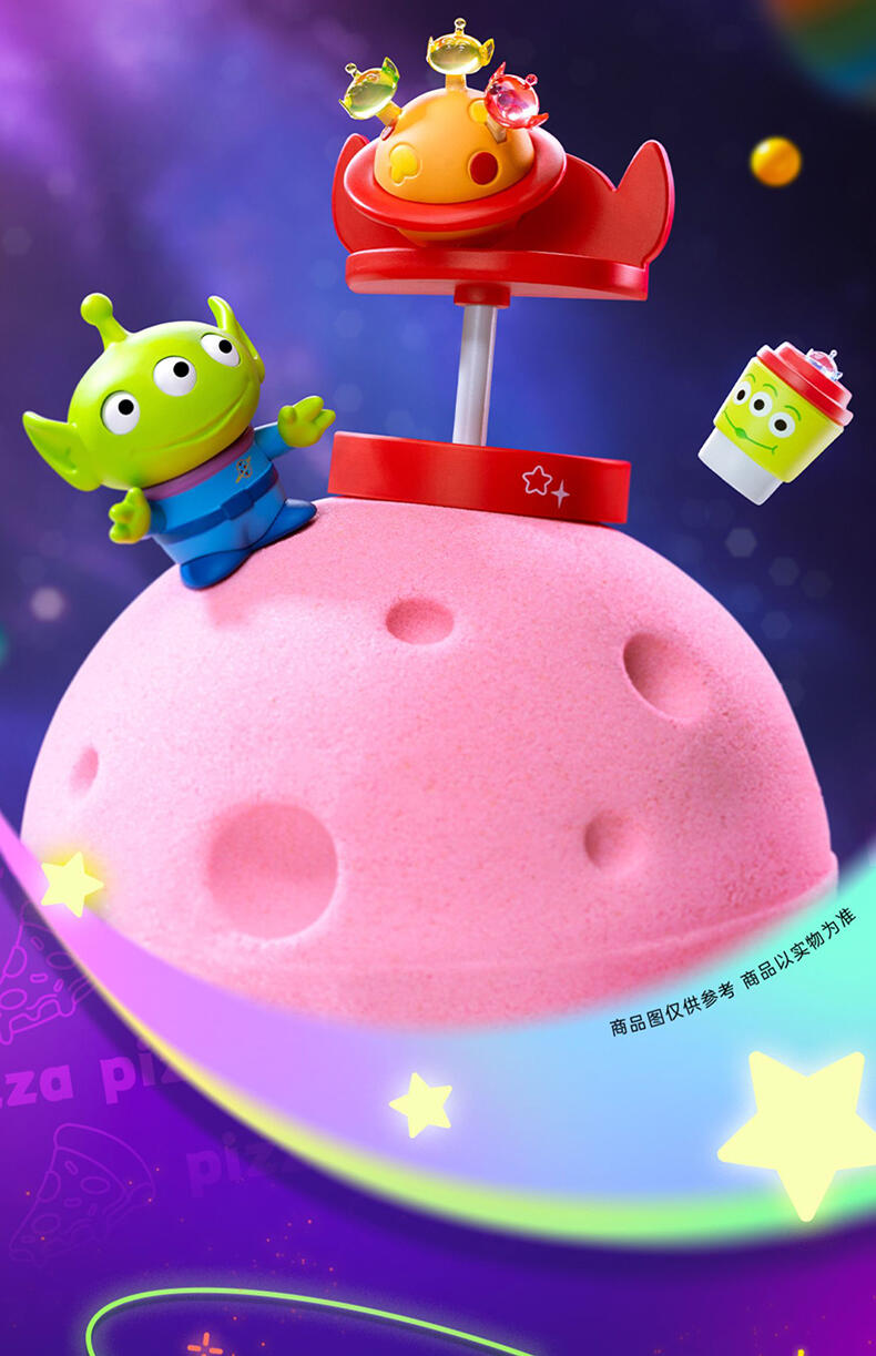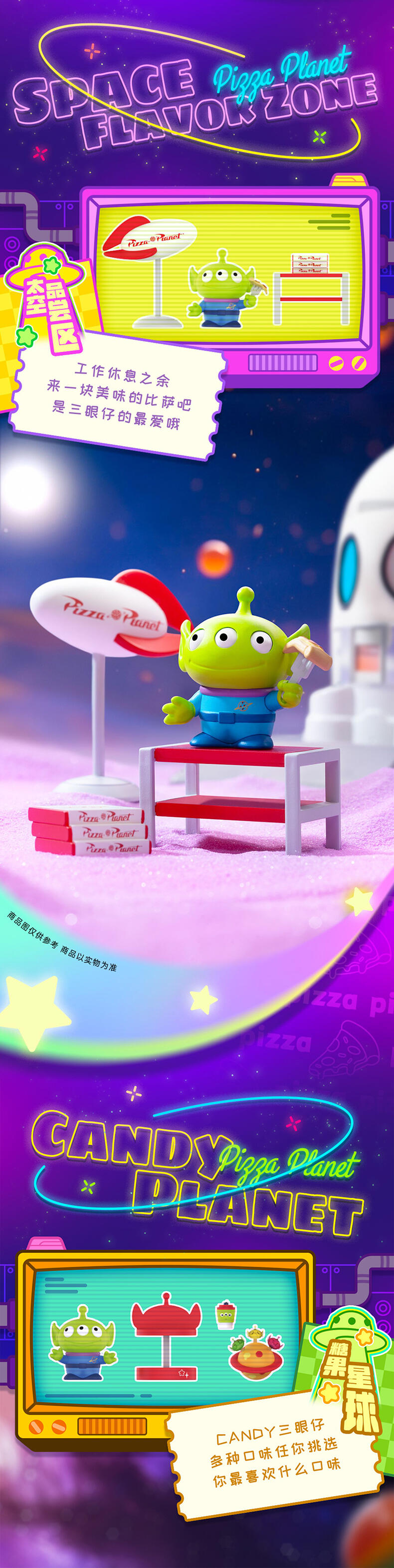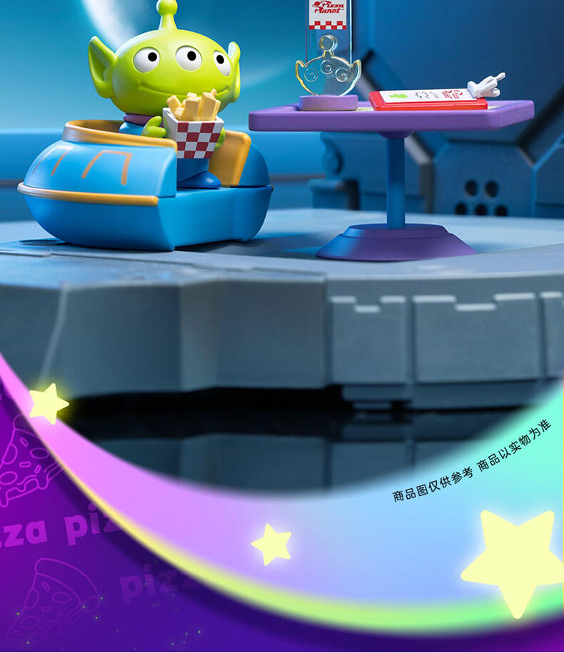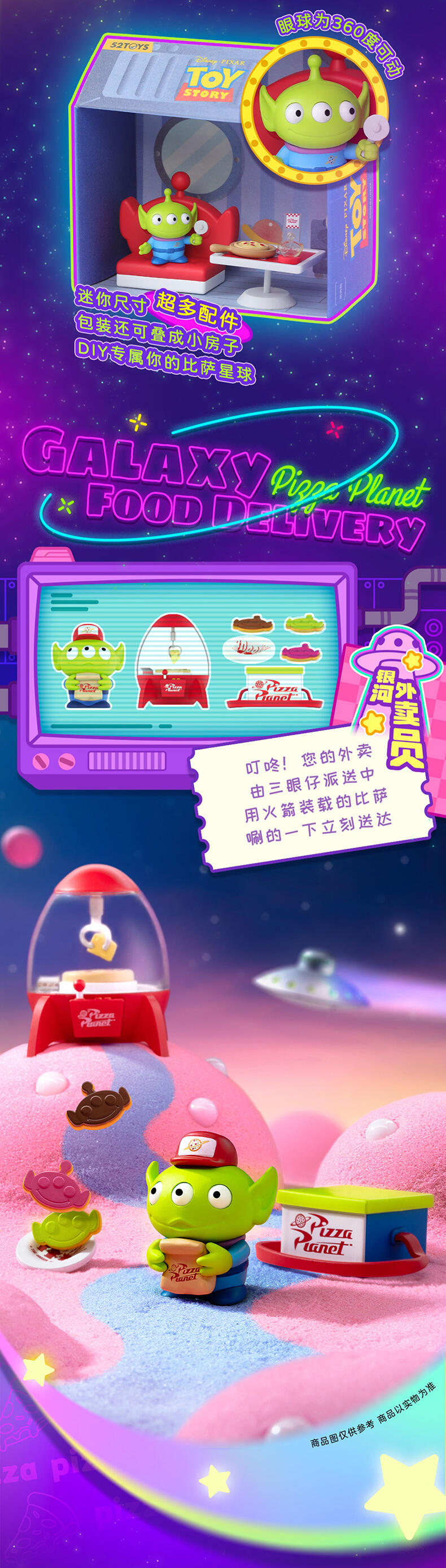 三眼仔(Alien),是玩具总动员中的一个角色。来自于比萨星球。作为玩具总动员中最受欢迎的角色之一,三眼仔深受玩家的喜爱,我们这次把披萨星球做了出来,在浩瀚的宇宙中各种能量补给站和餐车总有一款是你喜欢的,隐藏款更是增加了磁控灯的玩法,十分有趣。 三眼仔迷你尺寸,食玩大小,每款都会有很多配件,三眼仔的眼球是可动效果,黑色瞳孔可以不同位置凹造型,隐藏款比萨烤箱是磁控(热度款、工艺亮点等 灯,比萨在放到箭头位置时可以点亮烤箱,会配电池单独放置,玩家自行组装包装会同草莓熊的房间一样,可以叠成小房子,有场景背景,更加丰富玩法
