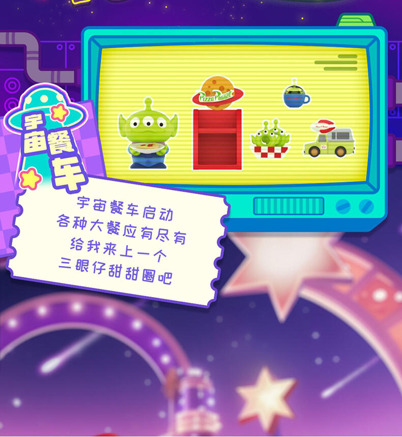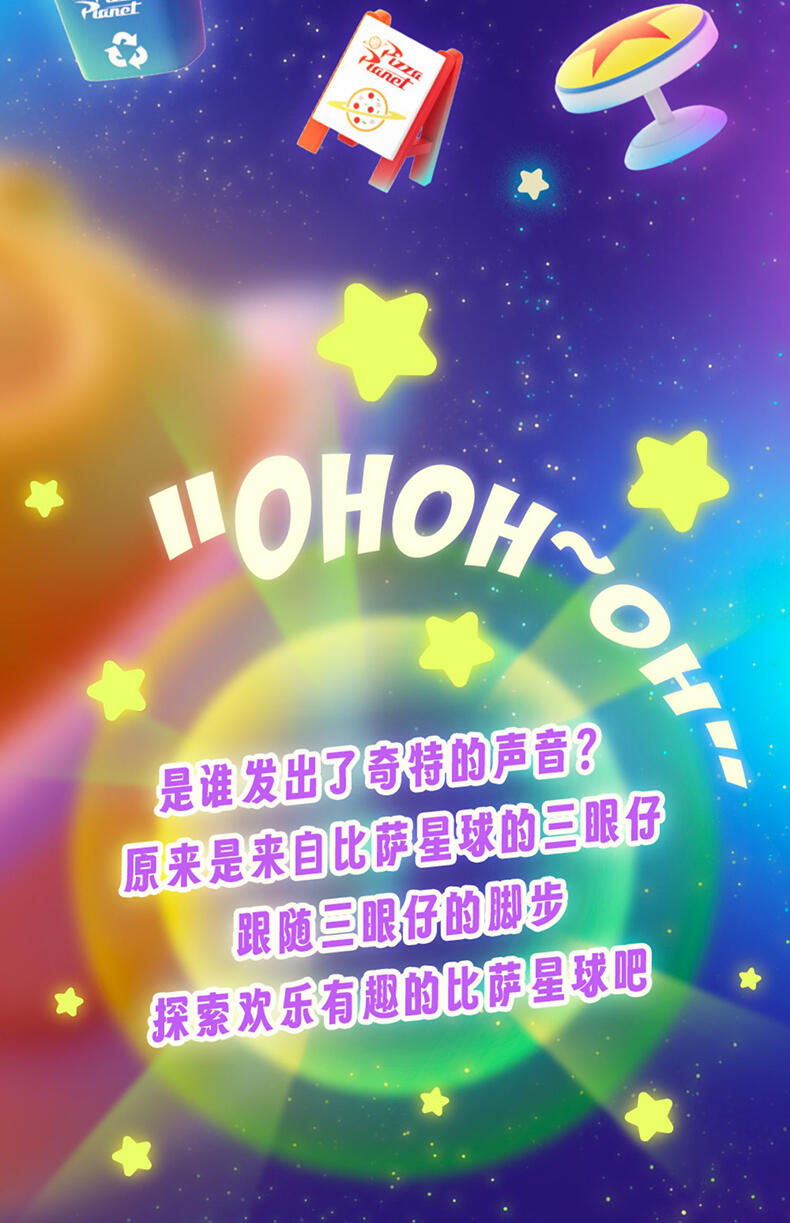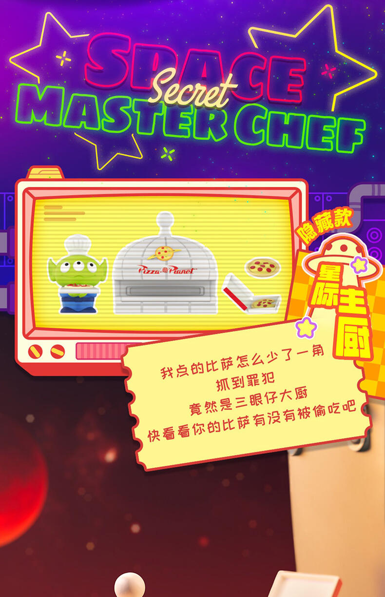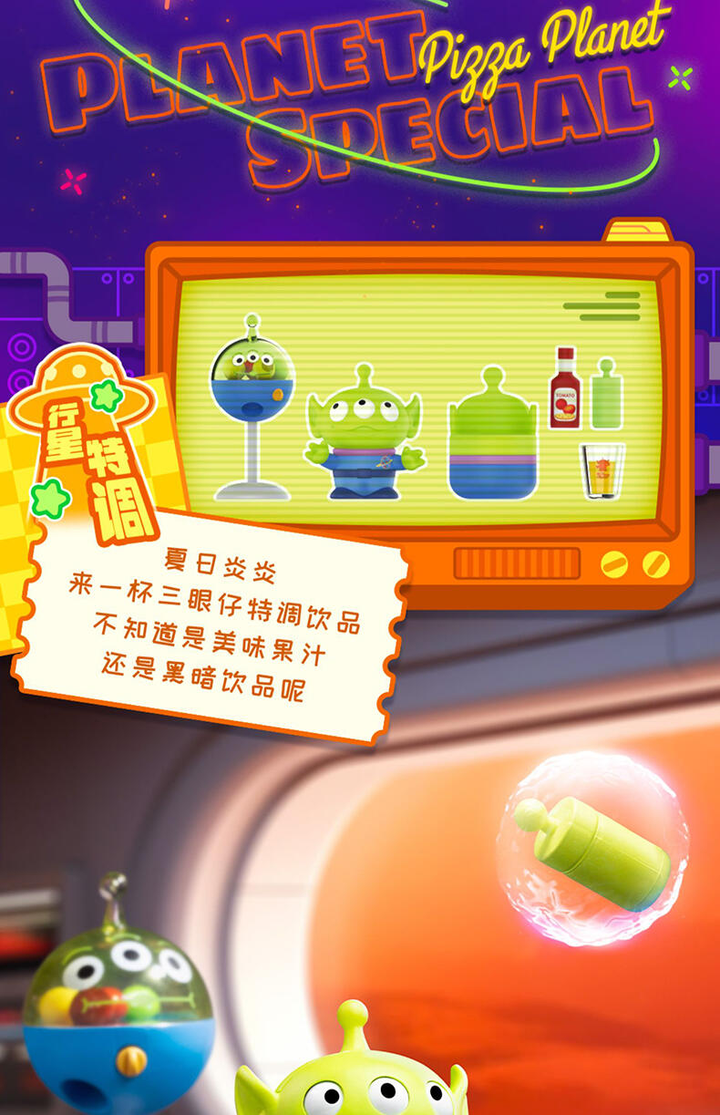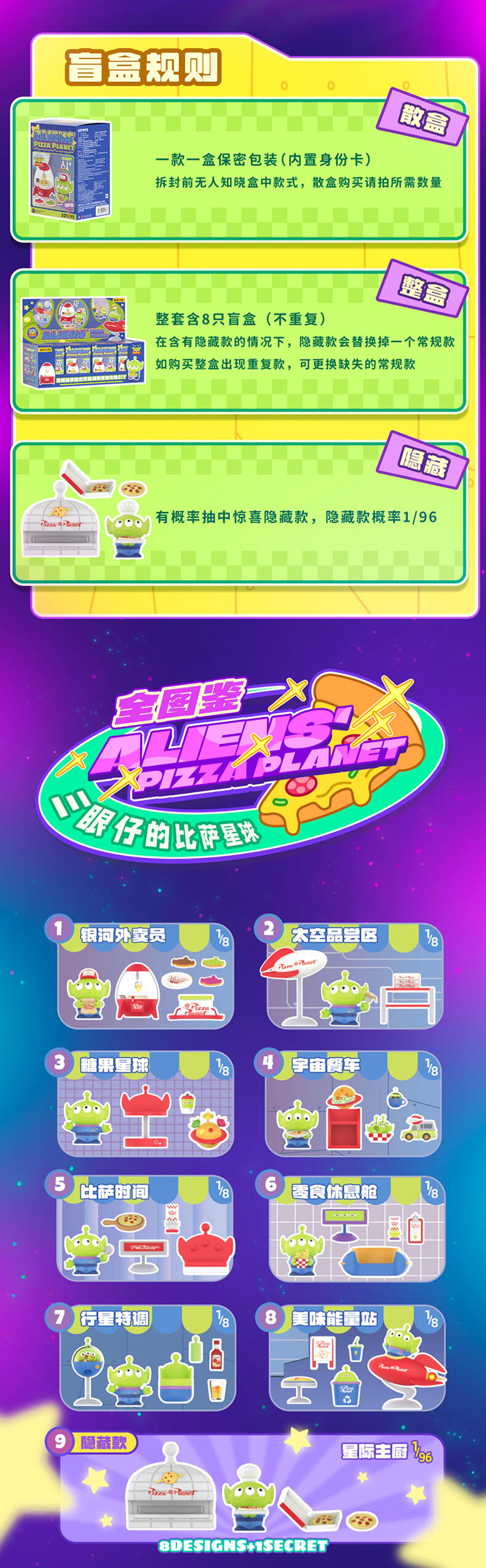 三眼仔(Alien),是玩具总动员中的一个角色。来自于比萨星球。作为玩具总动员中最受欢迎的角色之一,三眼仔深受玩家的喜爱,我们这次把披萨星球做了出来,在浩瀚的宇宙中各种能量补给站和餐车总有一款是你喜欢的,隐藏款更是增加了磁控灯的玩法,十分有趣。 三眼仔迷你尺寸,食玩大小,每款都会有很多配件,三眼仔的眼球是可动效果,黑色瞳孔可以不同位置凹造型,隐藏款比萨烤箱是磁控(热度款、工艺亮点等 灯,比萨在放到箭头位置时可以点亮烤箱,会配电池单独放置,玩家自行组装包装会同草莓熊的房间一样,可以叠成小房子,有场景背景,更加丰富玩法