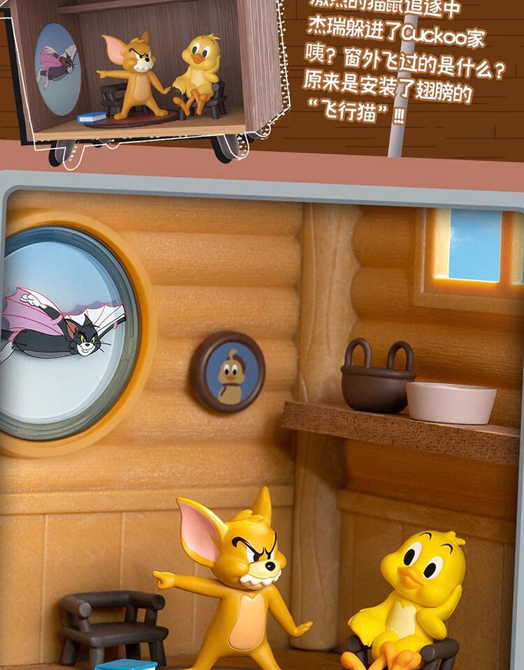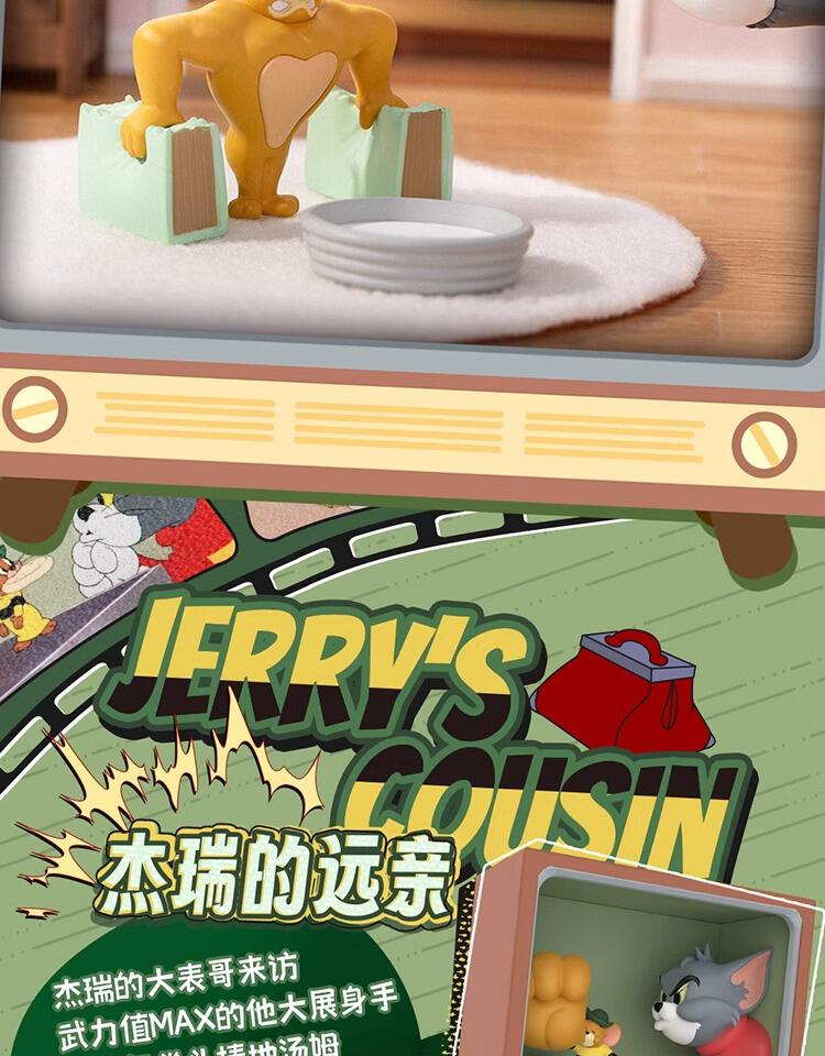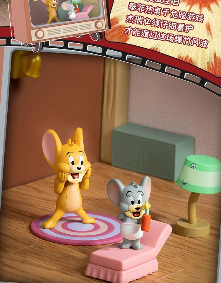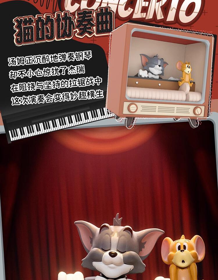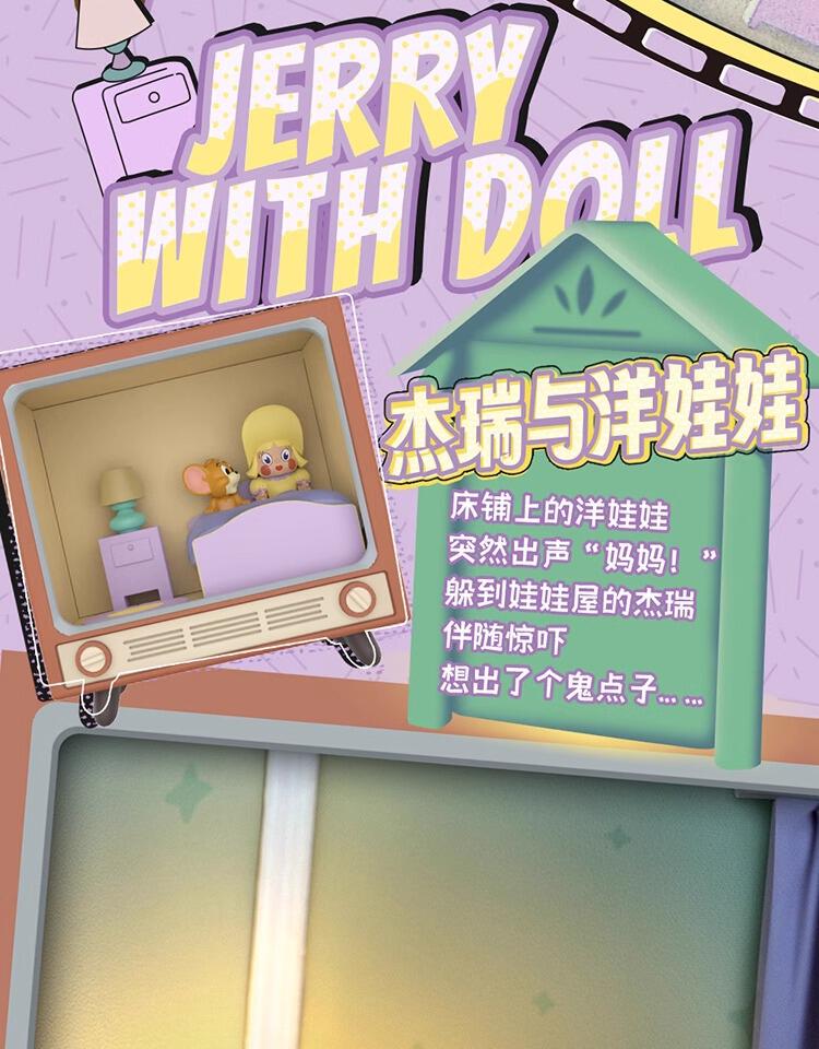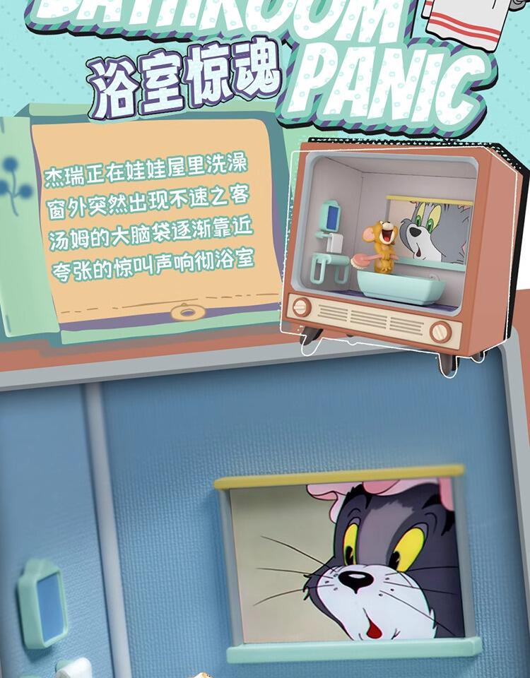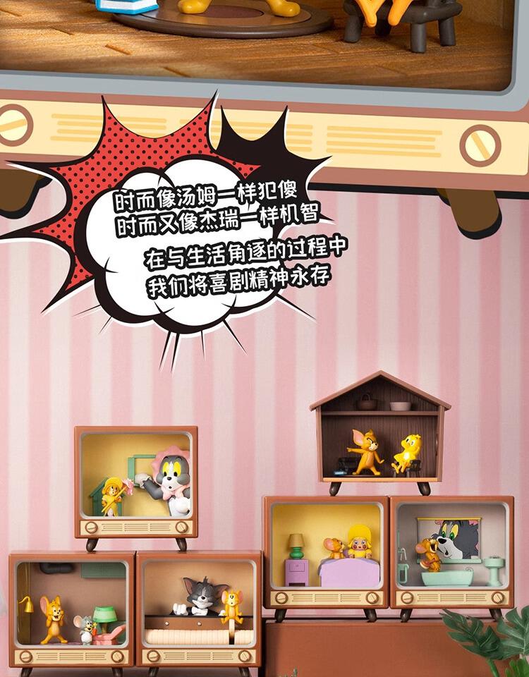 "设计背景:电视机造型内还原每一个属于TOM and JERRY的经典瞬间。 产品亮点 :本套产品有用到光油和透明件的工艺,凸显出产品的质感。部分配件可挪动,可随意摆放。"