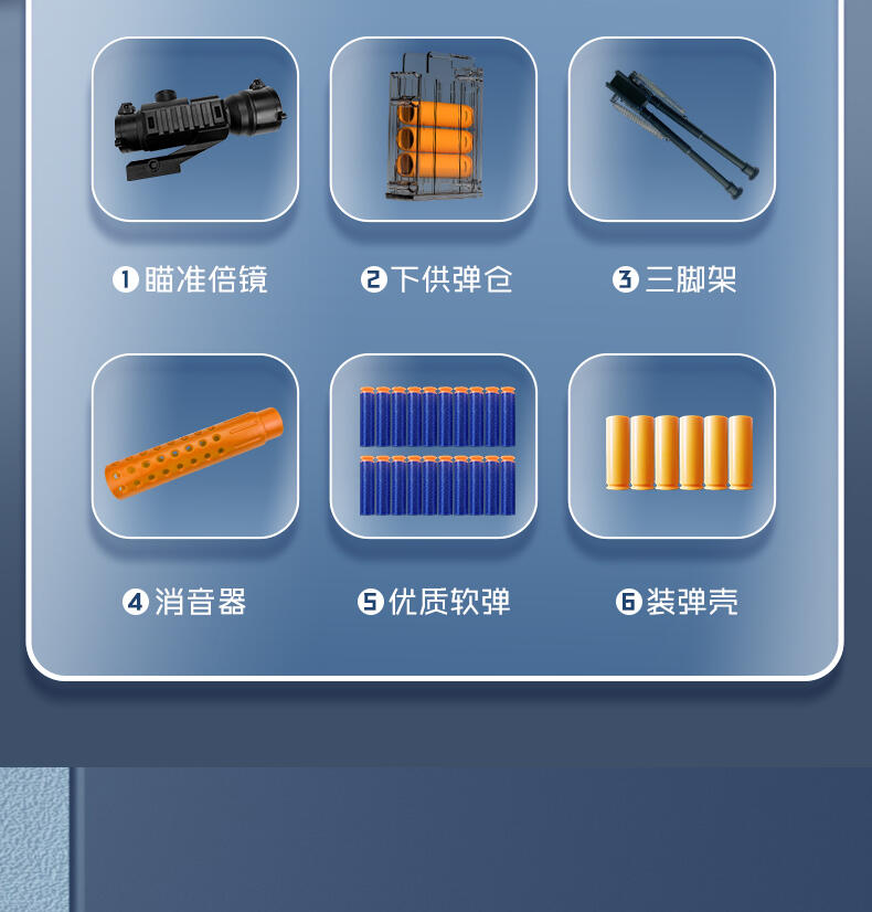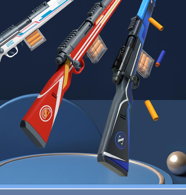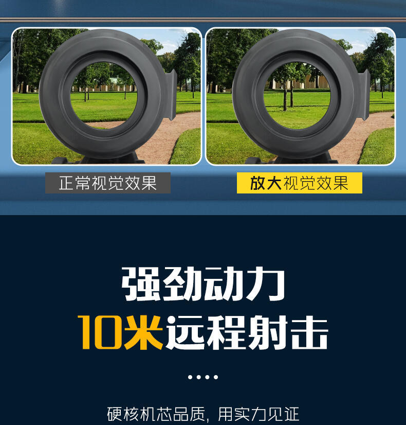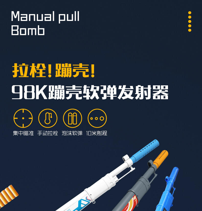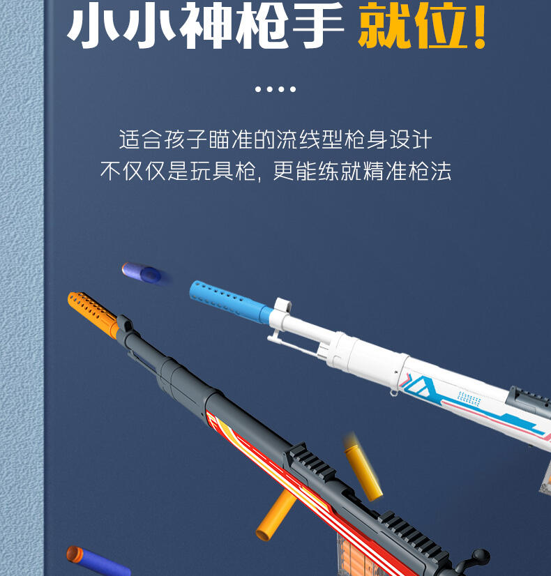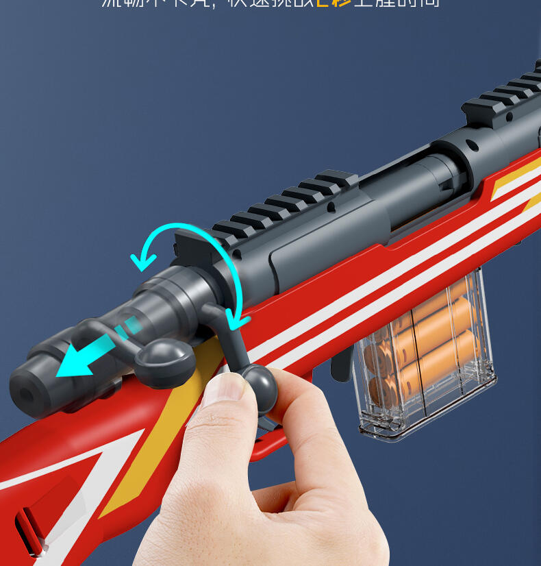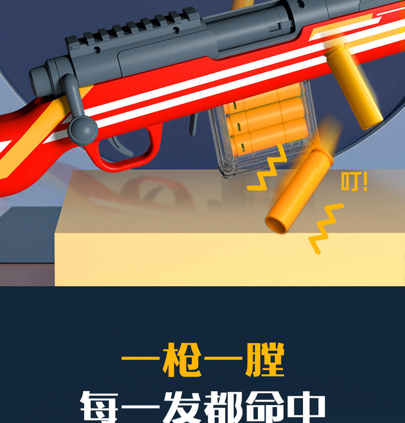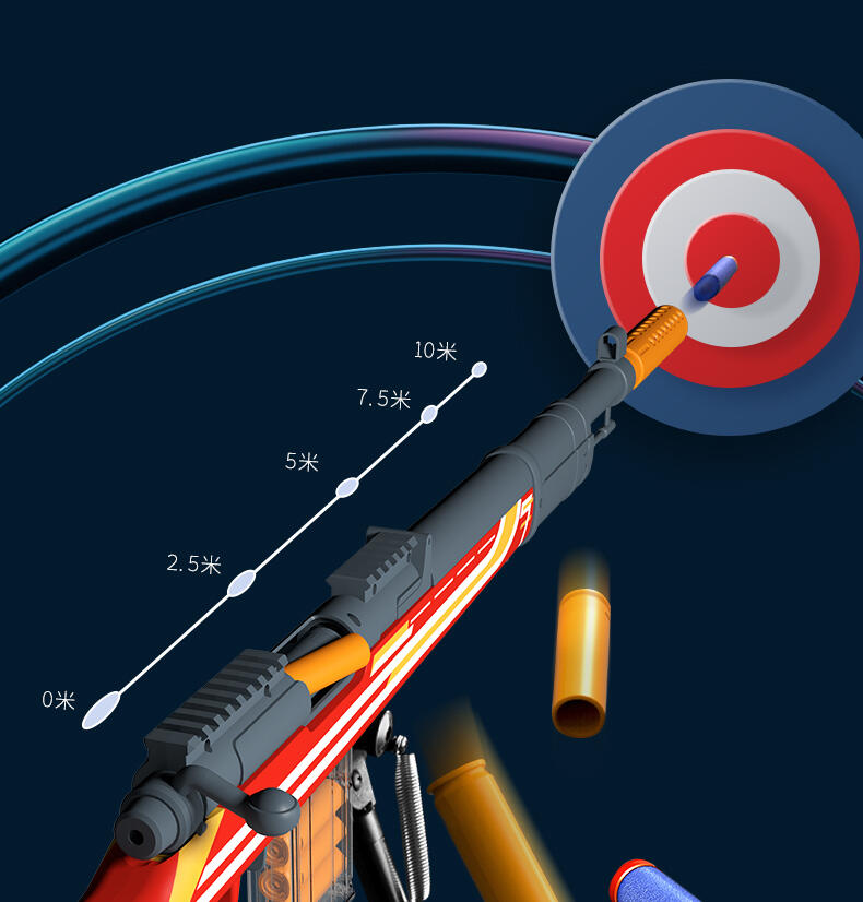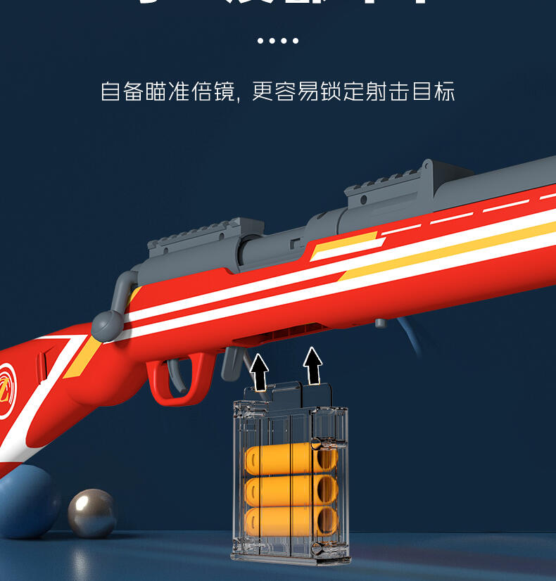 集中瞄准,手动拉栓,泡沫软弹,10米射程。