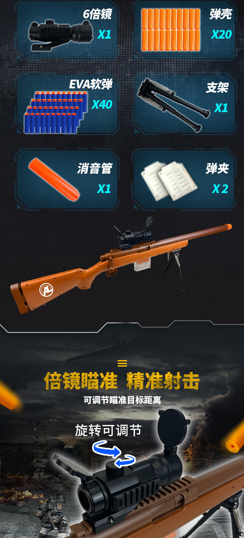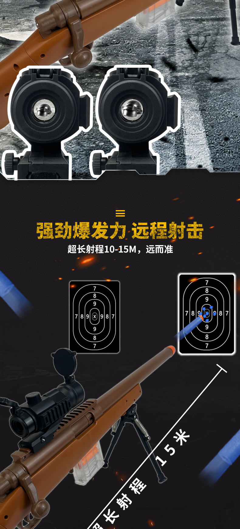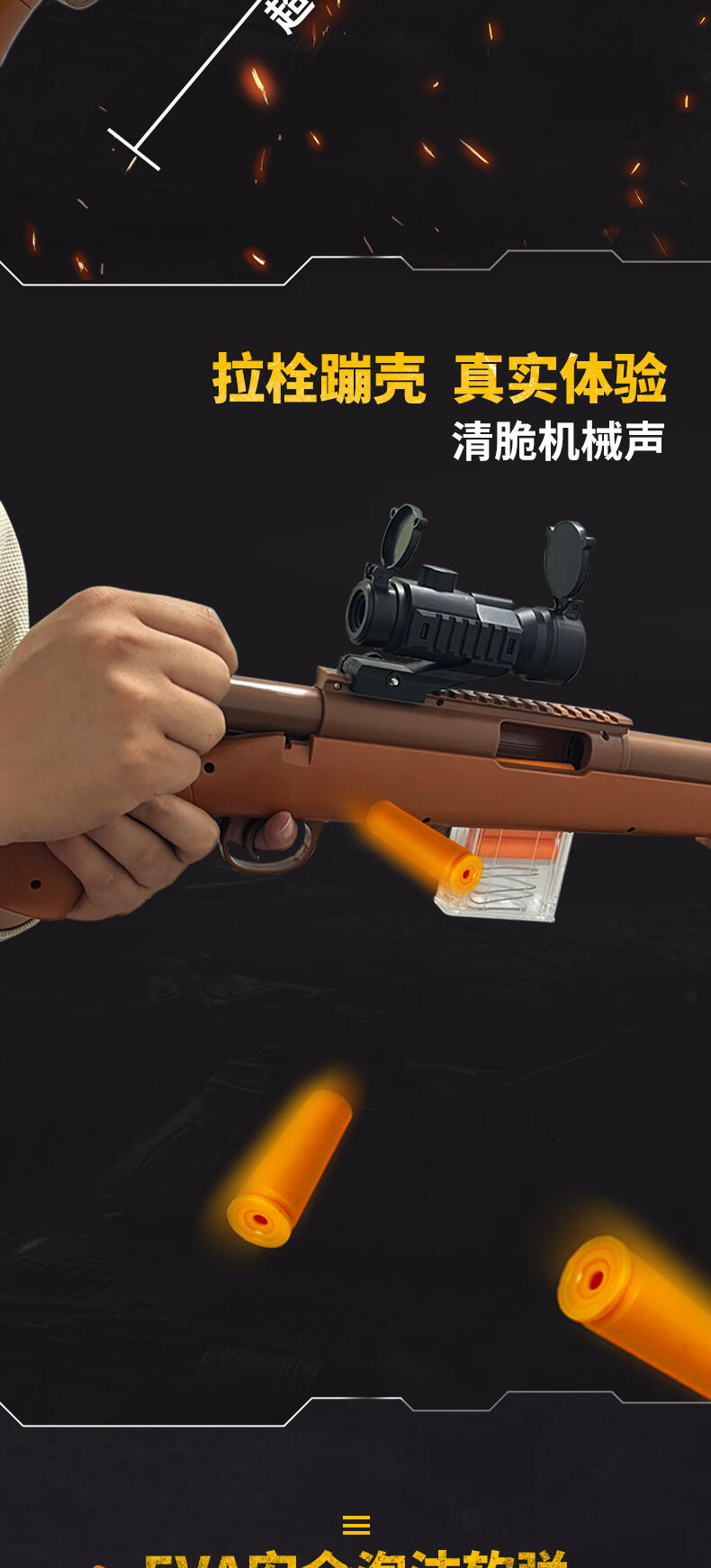 超长射程,爆发力10-15米。EVA软弹,瞄准镜,伸缩后托,手动拉栓。