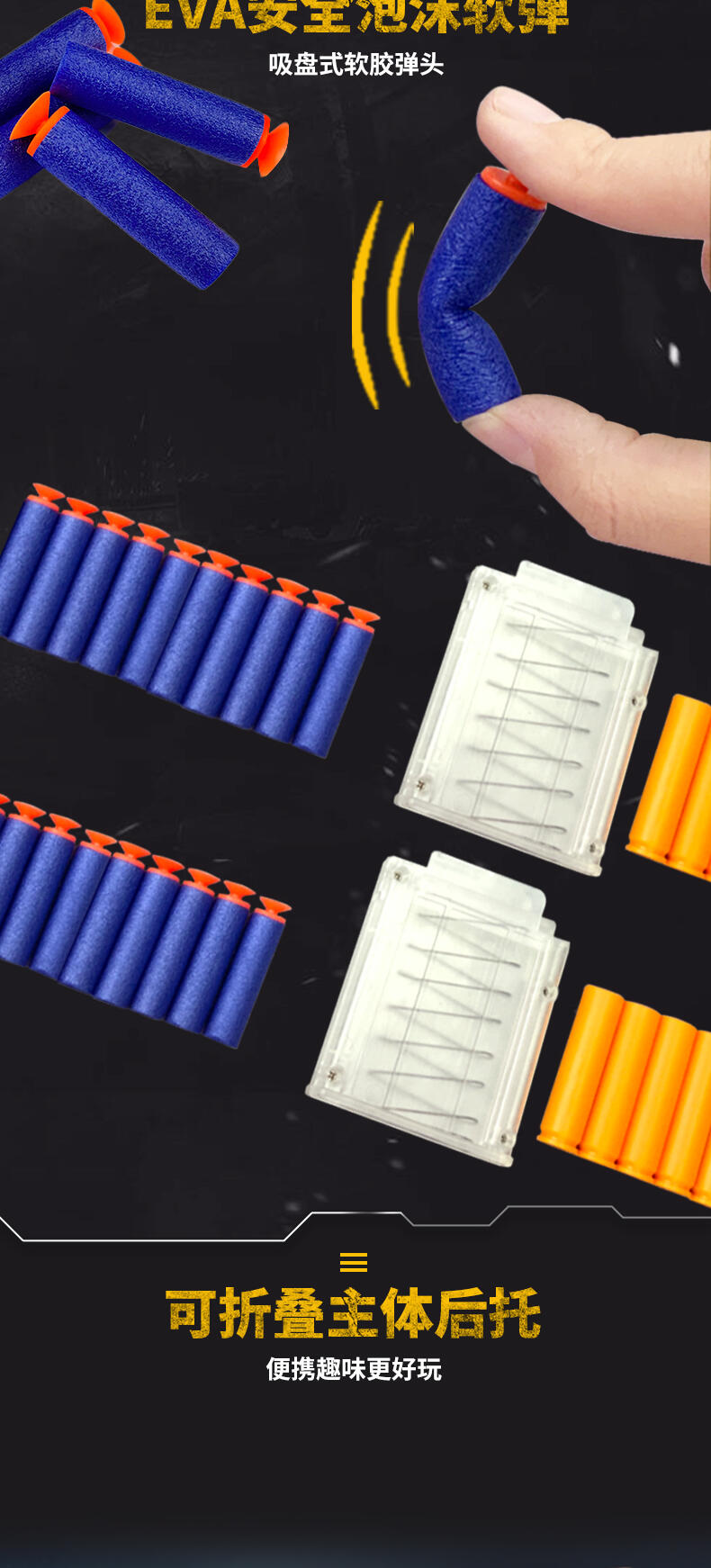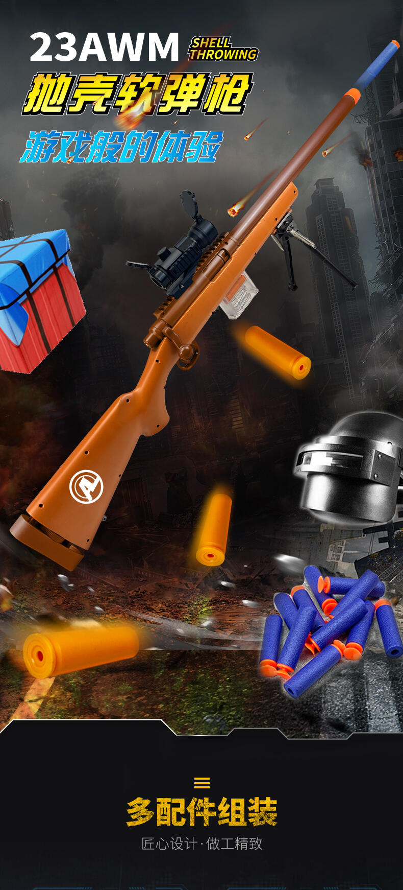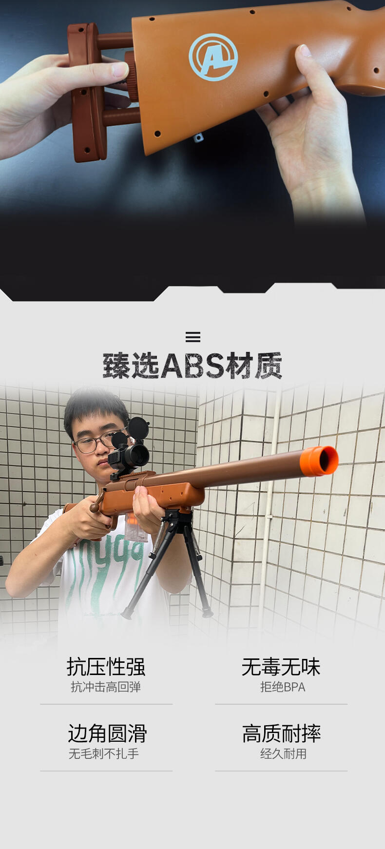超长射程,爆发力10-15米。EVA软弹,瞄准镜,伸缩后托,手动拉栓。