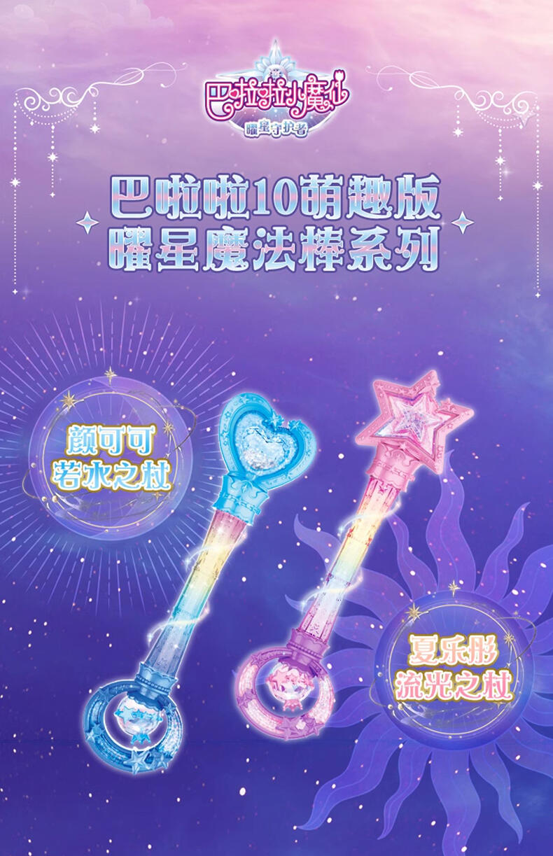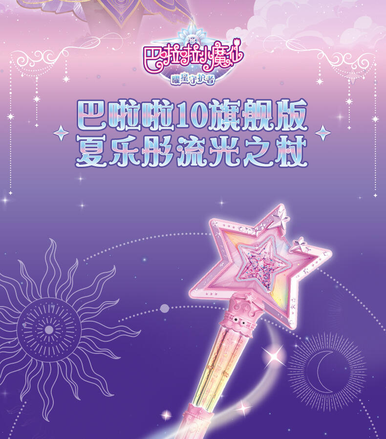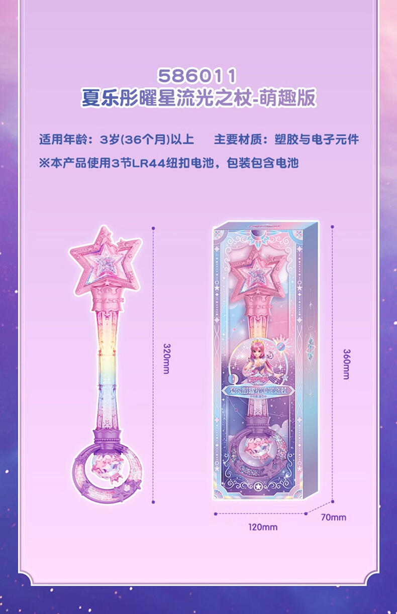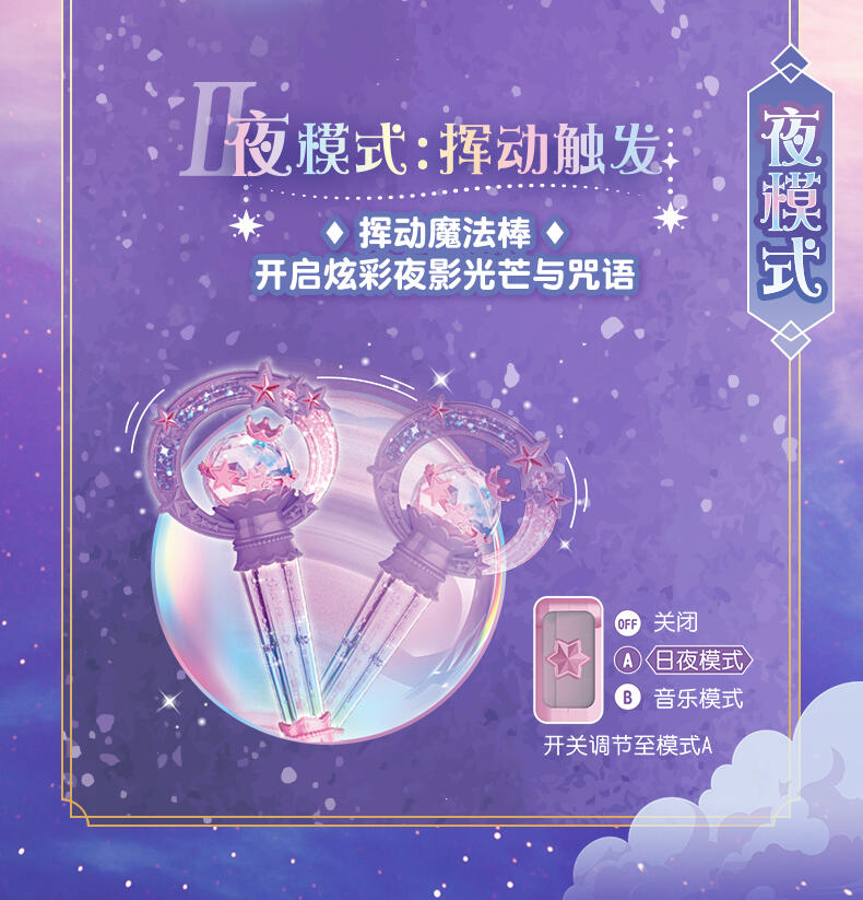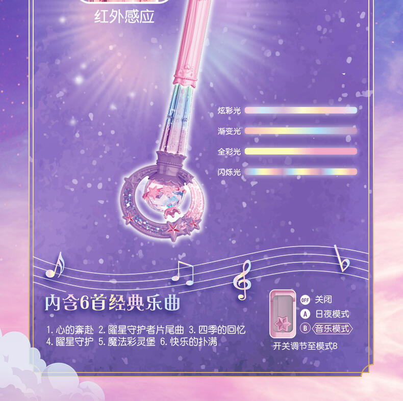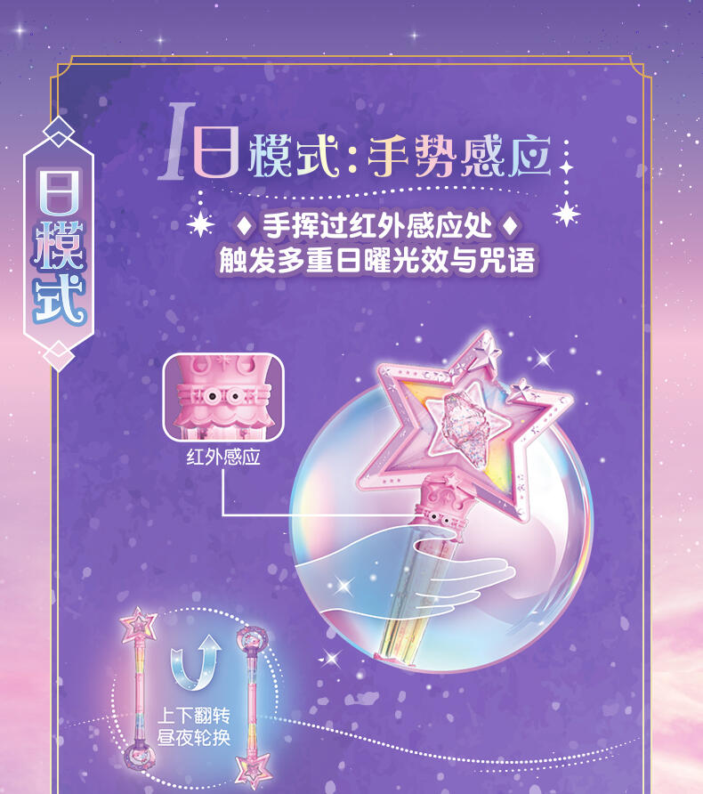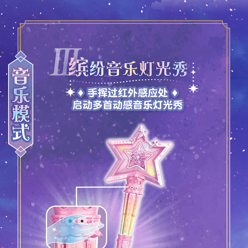 1.巴啦啦全新一季动画片夏乐彤曜星流光之杖,高还原动画魔法道具,华丽造型,吸睛无数; 2.拥有日夜双模式,翻转魔法棒,日夜模式即可切换:①日模式下,红外感应,触摸红外感应处,即可切换华丽灯效与咒语;②夜模式下,挥动感应,挥动魔法棒即可切换华丽灯效与咒语~3.更增添音乐模式,触摸红外感应即可切换6首音乐,搭配不同炫动灯光效果,华丽炫光,触发魔法音乐~!