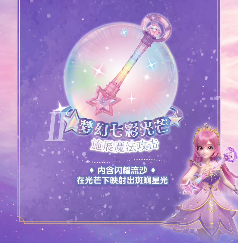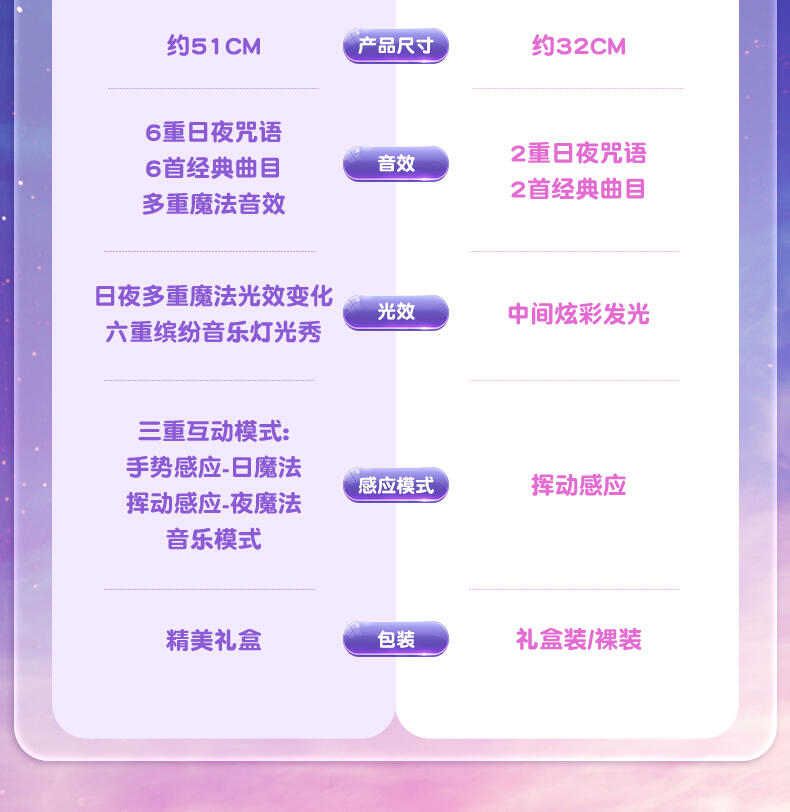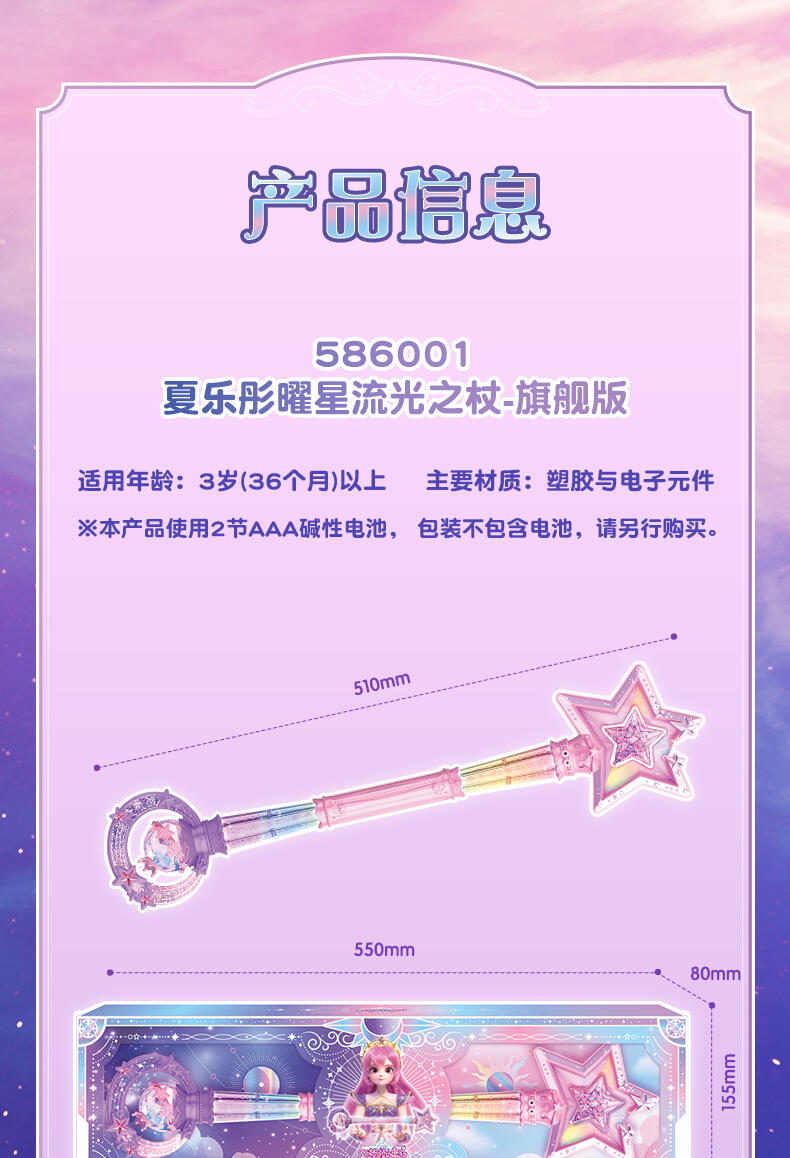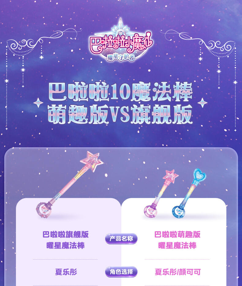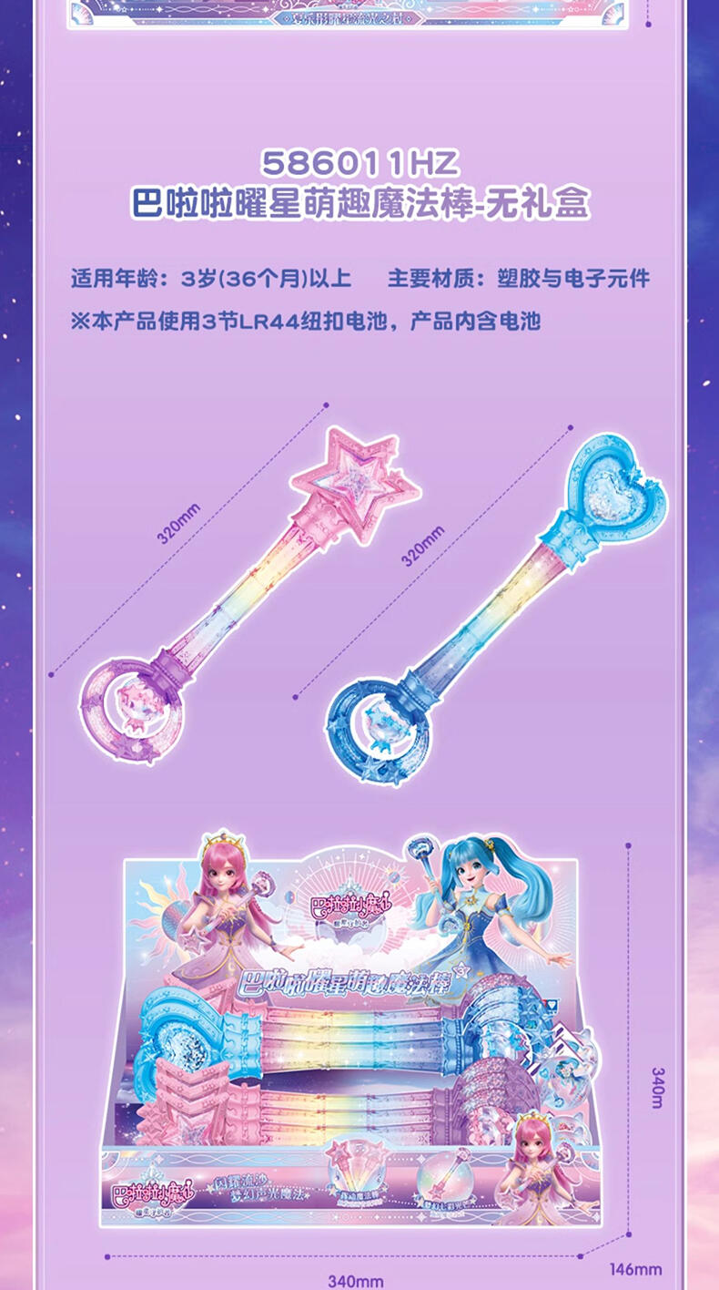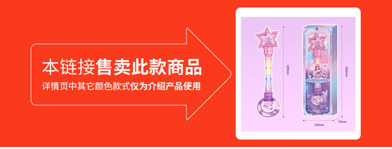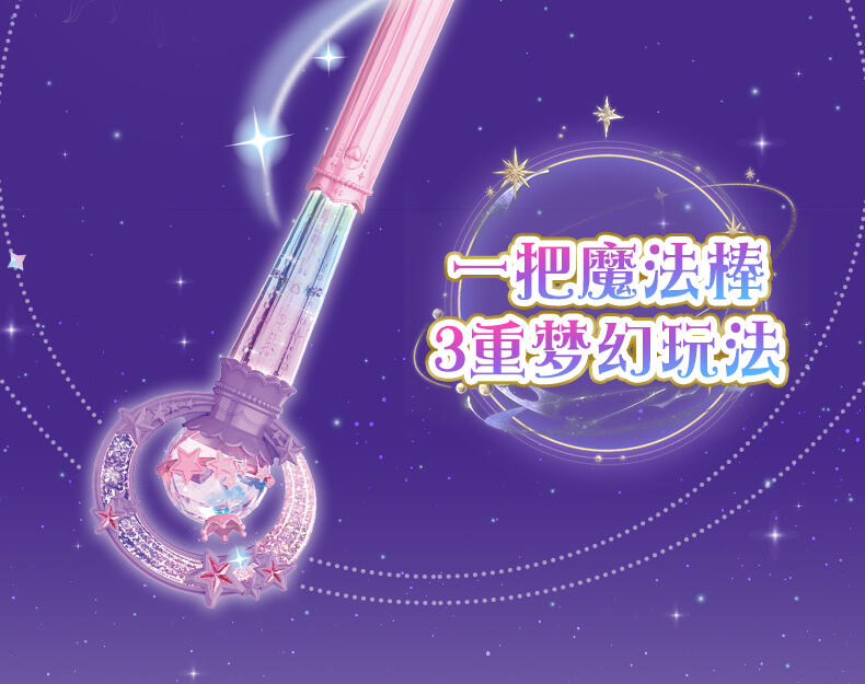 1.巴啦啦全新一季动画片夏乐彤曜星流光之杖,高还原动画魔法道具,华丽造型,吸睛无数; 2.拥有日夜双模式,翻转魔法棒,日夜模式即可切换:①日模式下,红外感应,触摸红外感应处,即可切换华丽灯效与咒语;②夜模式下,挥动感应,挥动魔法棒即可切换华丽灯效与咒语~3.更增添音乐模式,触摸红外感应即可切换6首音乐,搭配不同炫动灯光效果,华丽炫光,触发魔法音乐~!