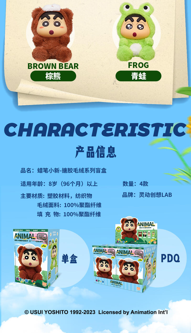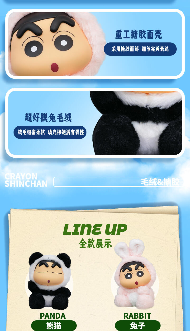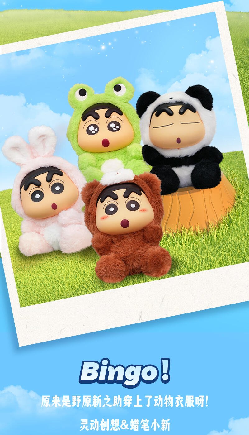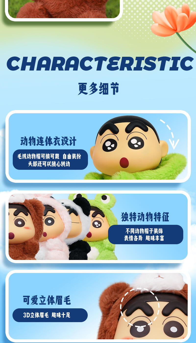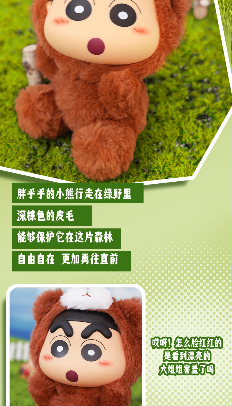 1、趣稚小新形象+动物连体衣的可爱设计. 2、搪胶面壳+亲肤毛绒身体,画风还原+萌软手感兼得。3、帽子可穿脱、手脚脖子可动,互动满分