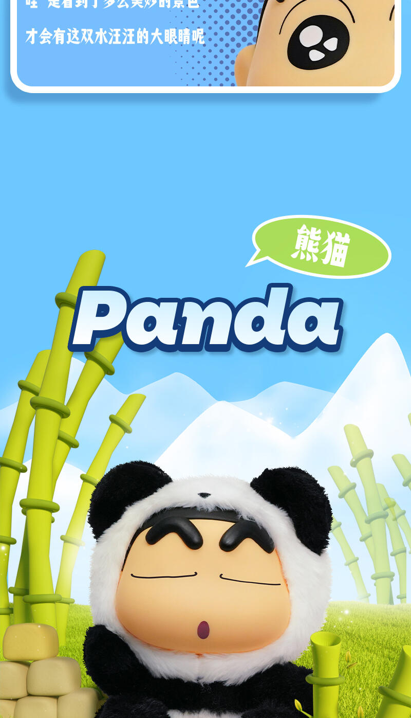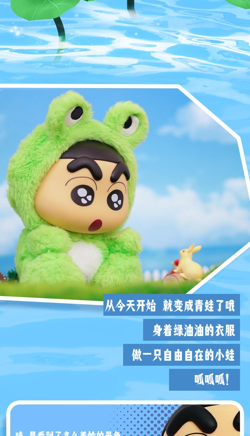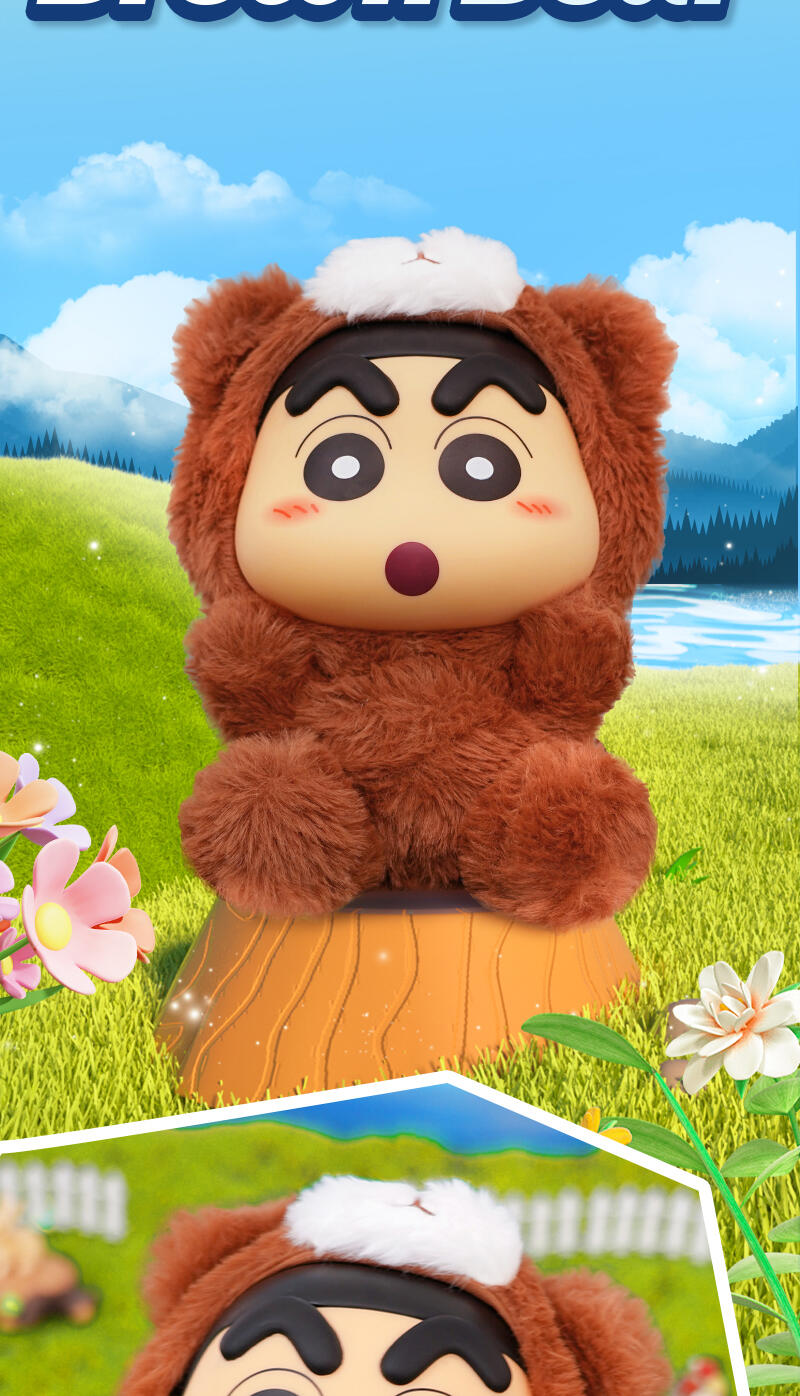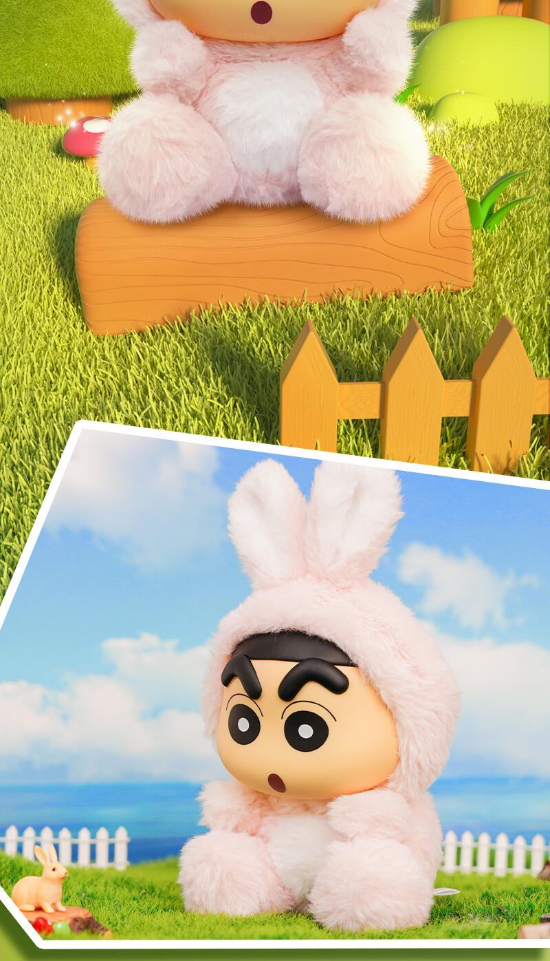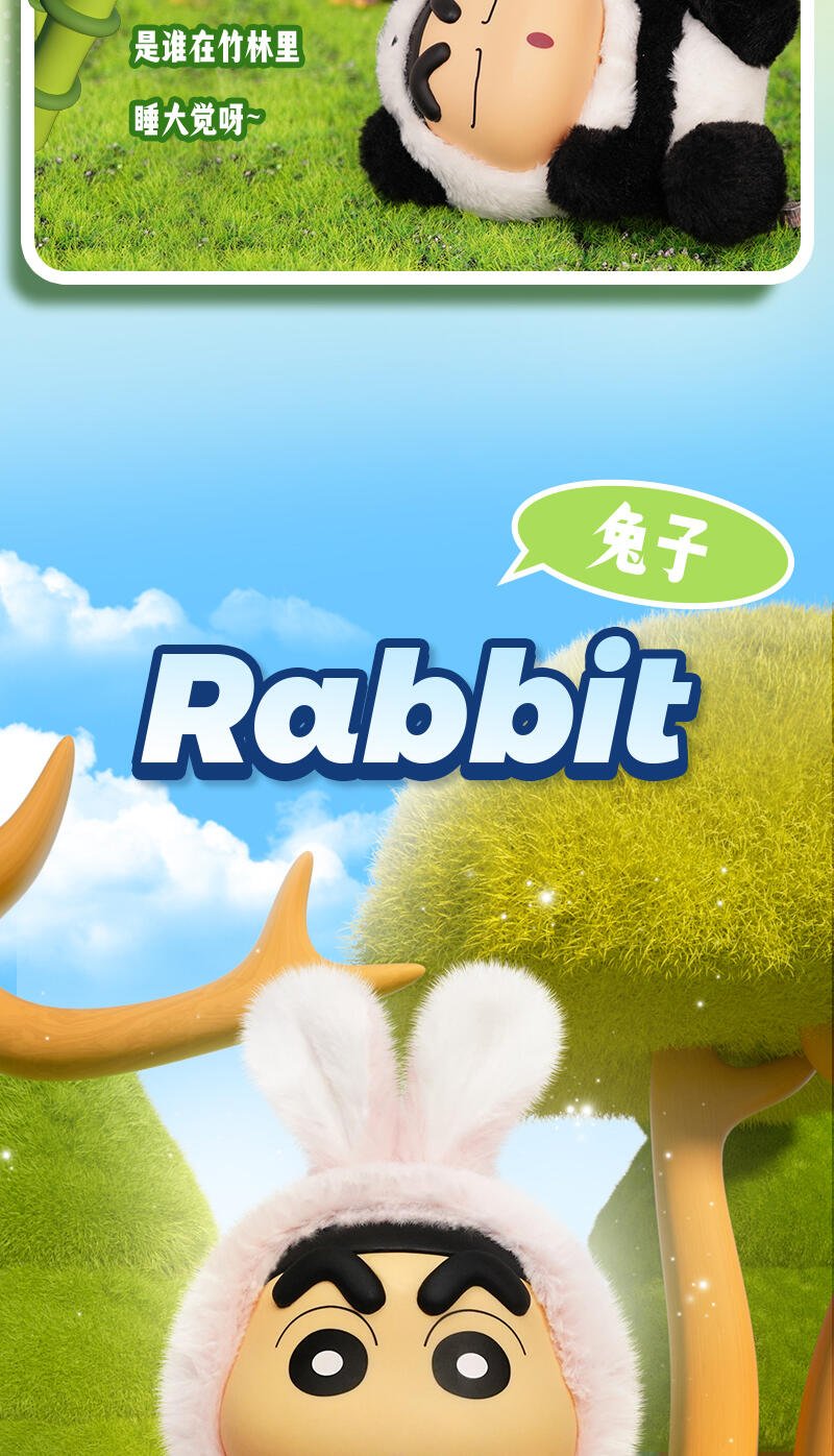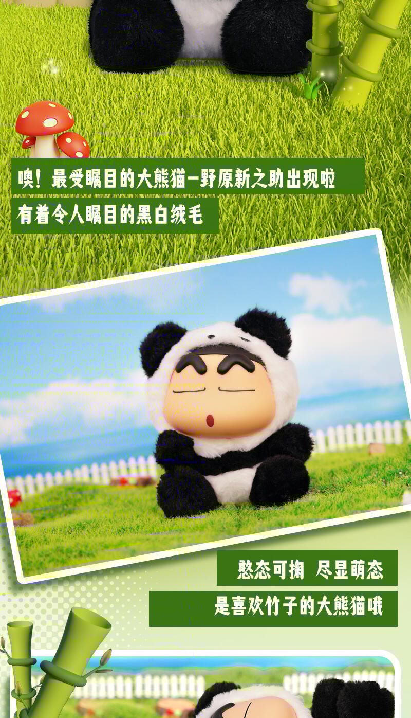 1、趣稚小新形象+动物连体衣的可爱设计. 2、搪胶面壳+亲肤毛绒身体,画风还原+萌软手感兼得。3、帽子可穿脱、手脚脖子可动,互动满分
