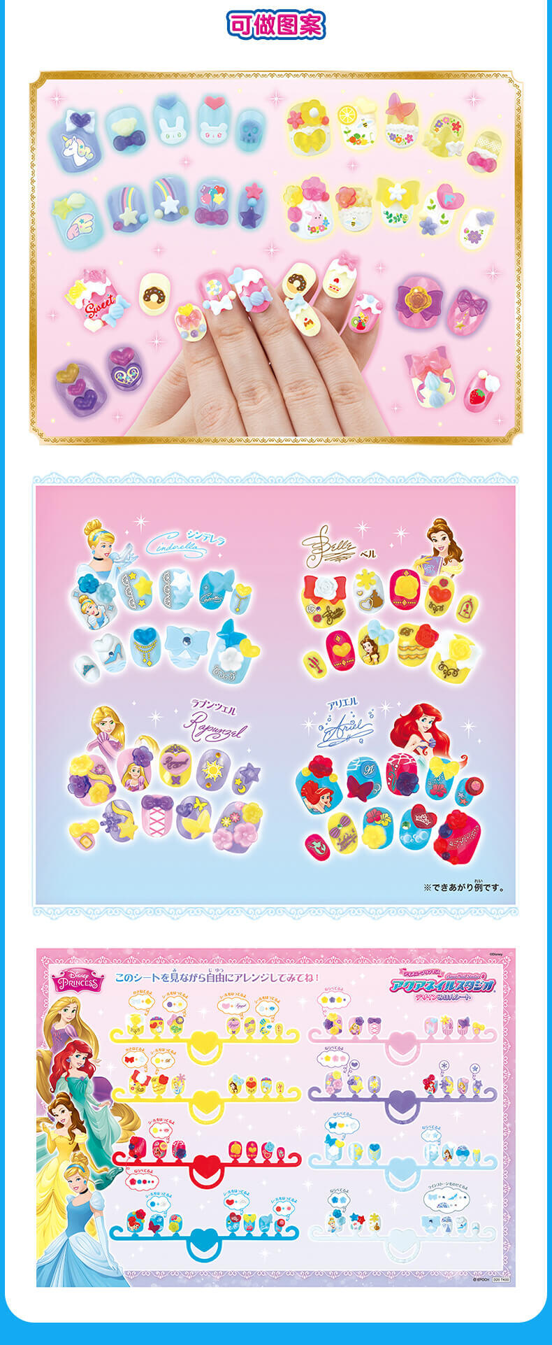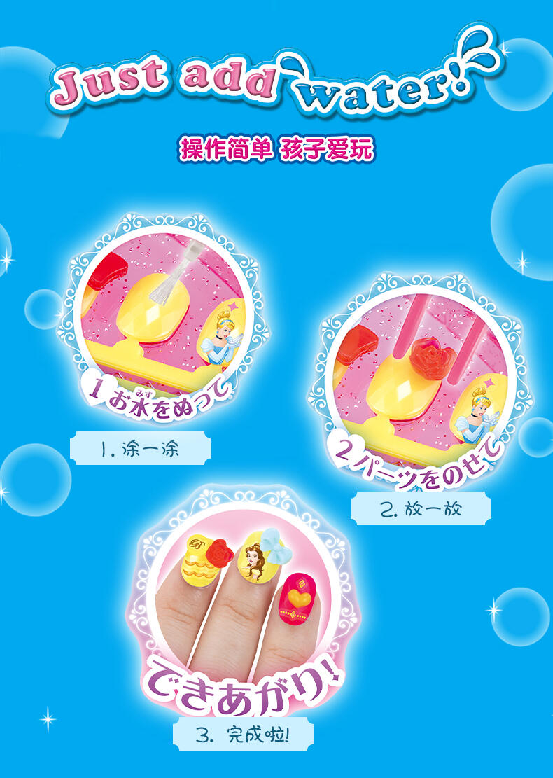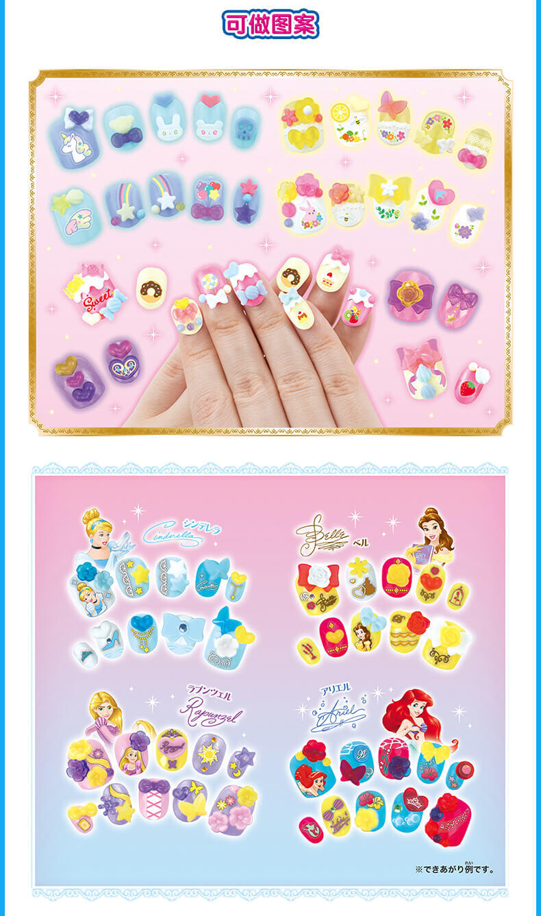 把水弄湿,把装饰件放在上面就行了! 凭借色彩缤纷的指甲尖、大量装饰部件和时尚的指甲贴,以及闪闪发光的水钻,您可以设计出以迪士尼公主(长发公主、灰姑娘、贝尔、爱丽儿)为灵感的美妙指甲。