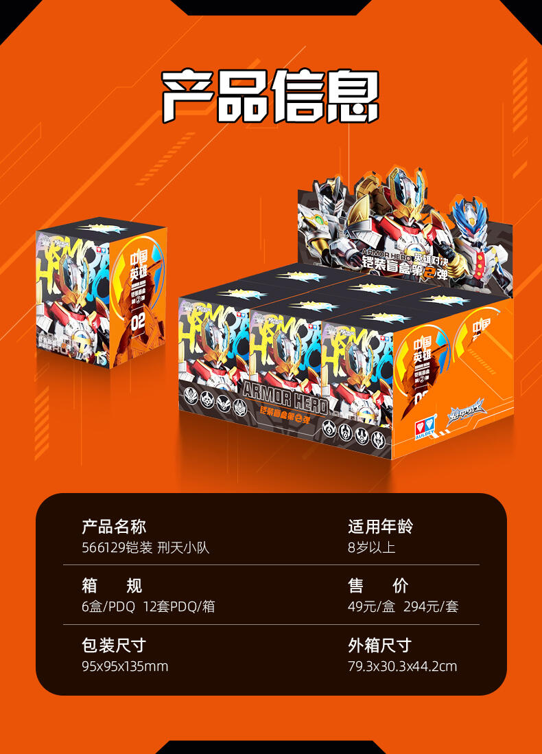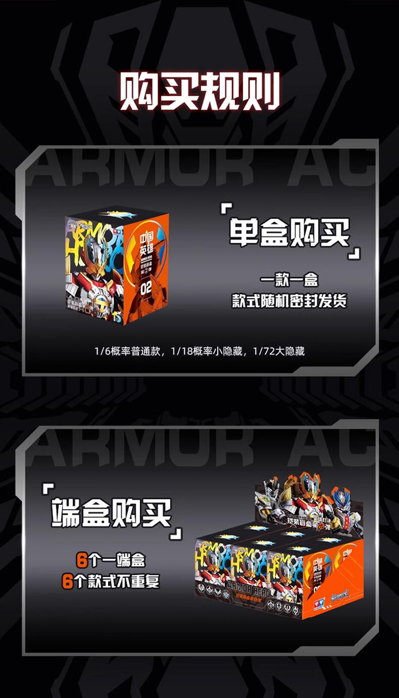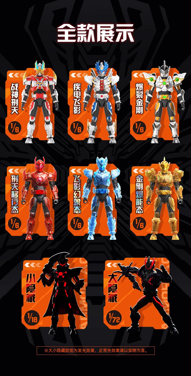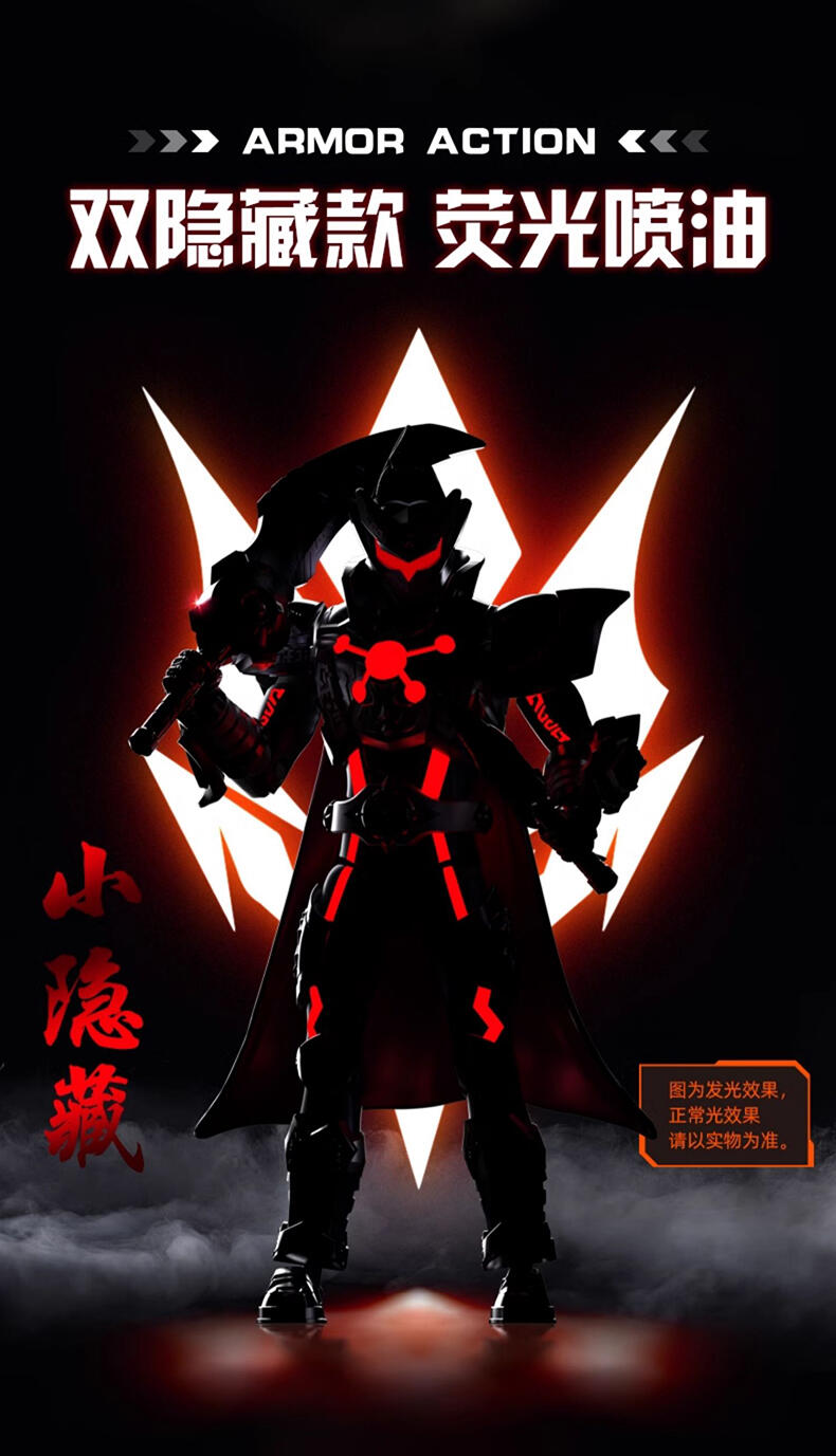1、该系列集合了二代铠甲勇士8个角色,配置为6+2,设置大隐藏和小隐藏 2、通过优化体验,升级为预拼装方式出货,儿童也可完成拼装,铠甲合体过程,精美分色分件设计,无 需贴纸,通过成型色即可再现设定配色 3、高可动素体,全身多关节可动 4、高度还原设定造型 5、丰富配件,附送武器,手掌零件,支架 6、每个角色配精美角色卡一张 7、大小隐藏附带荧光喷油(配合紫外线灯)