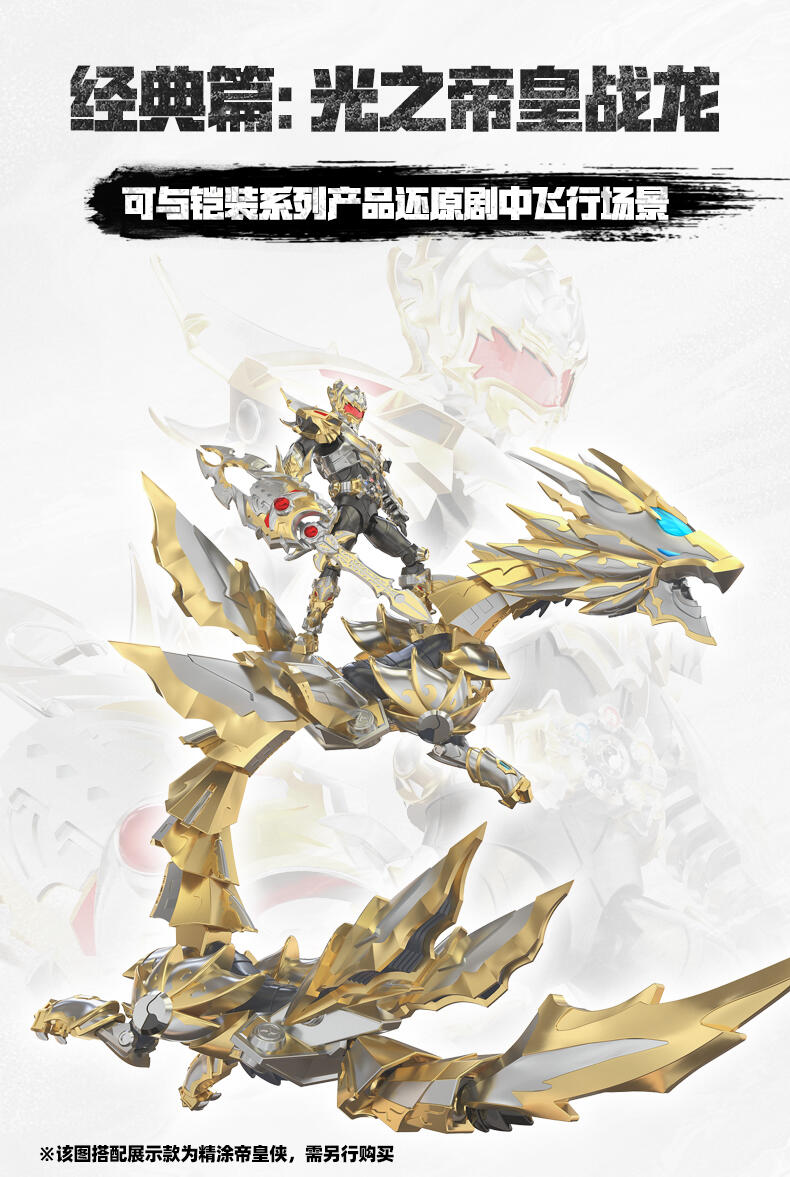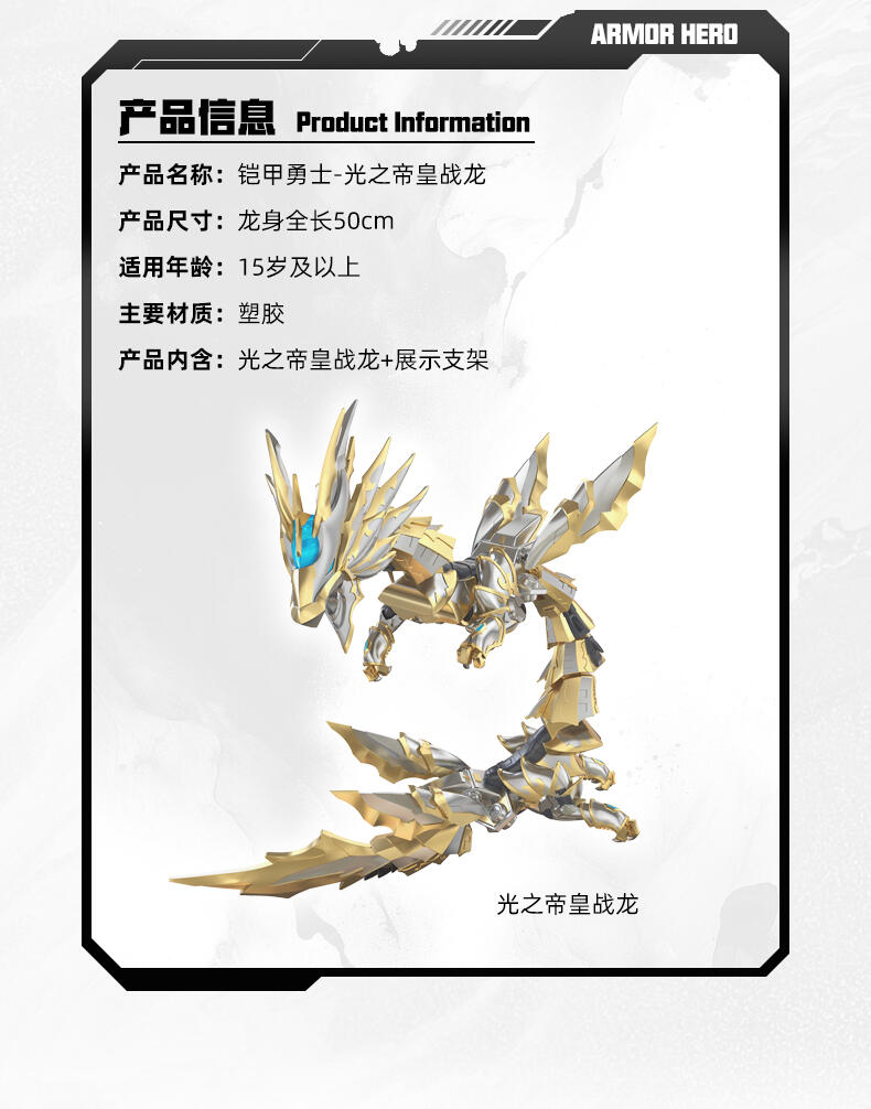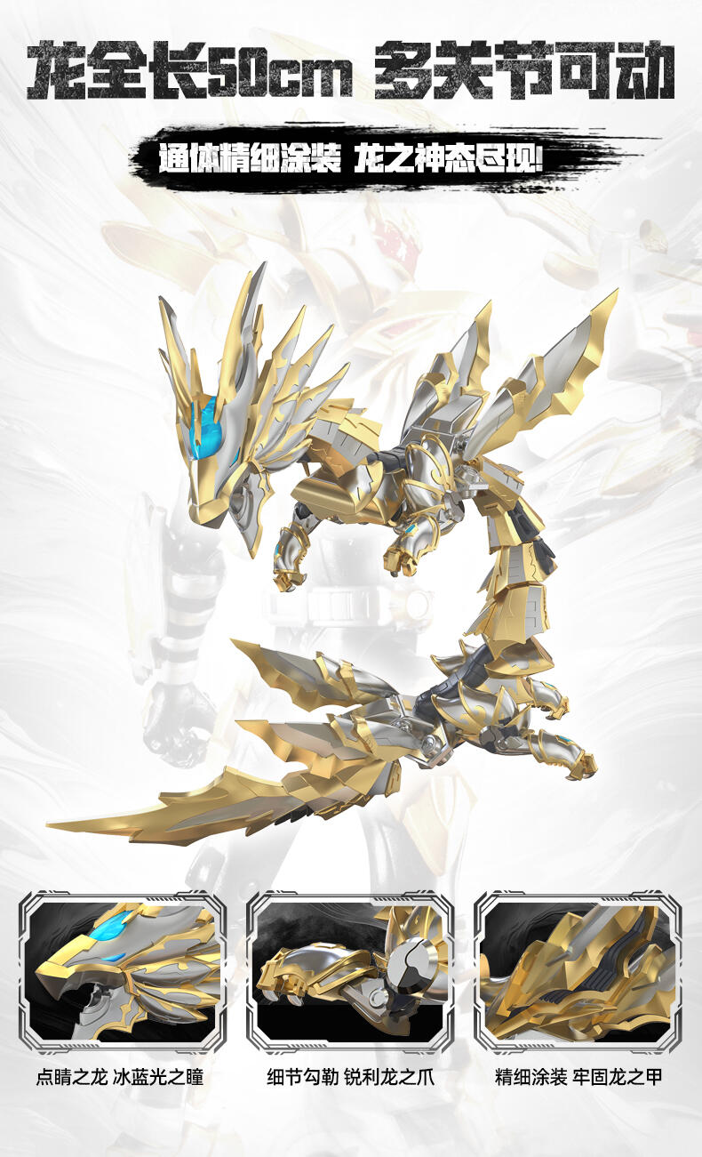 1.全长50CM,龙身多处可动关节,助你凹出更多霸气造型。2.透明件+涂装结合,高度还原影片战龙形象;全龙各部位精细涂装,可与铠装系列产品搭配,还原片中飞行姿态。