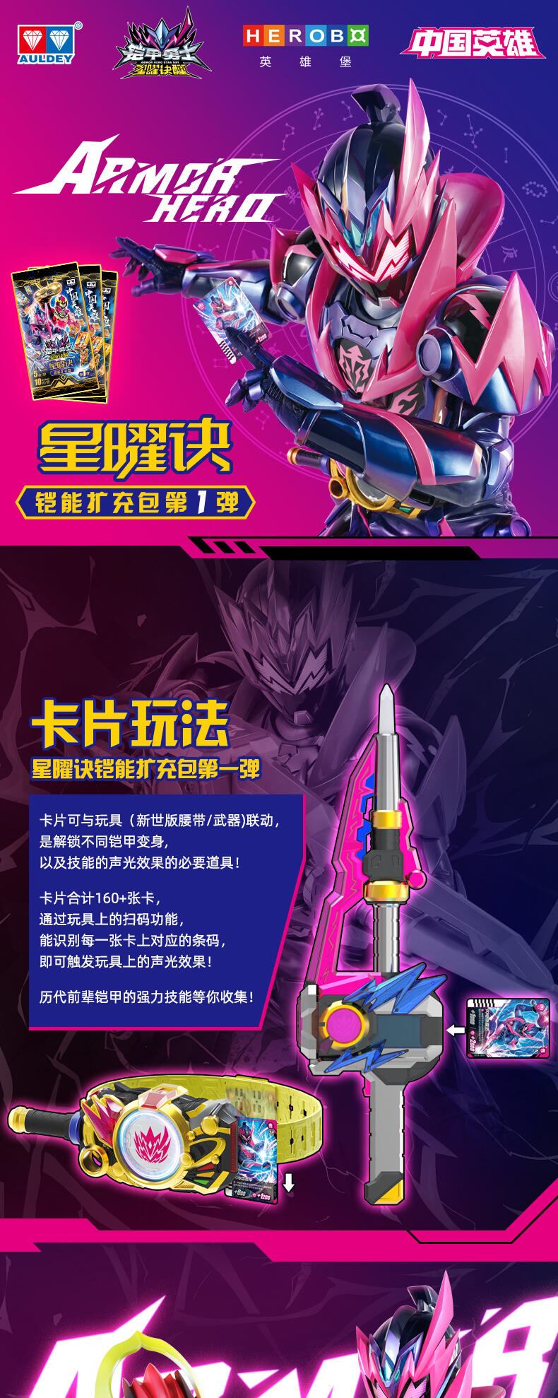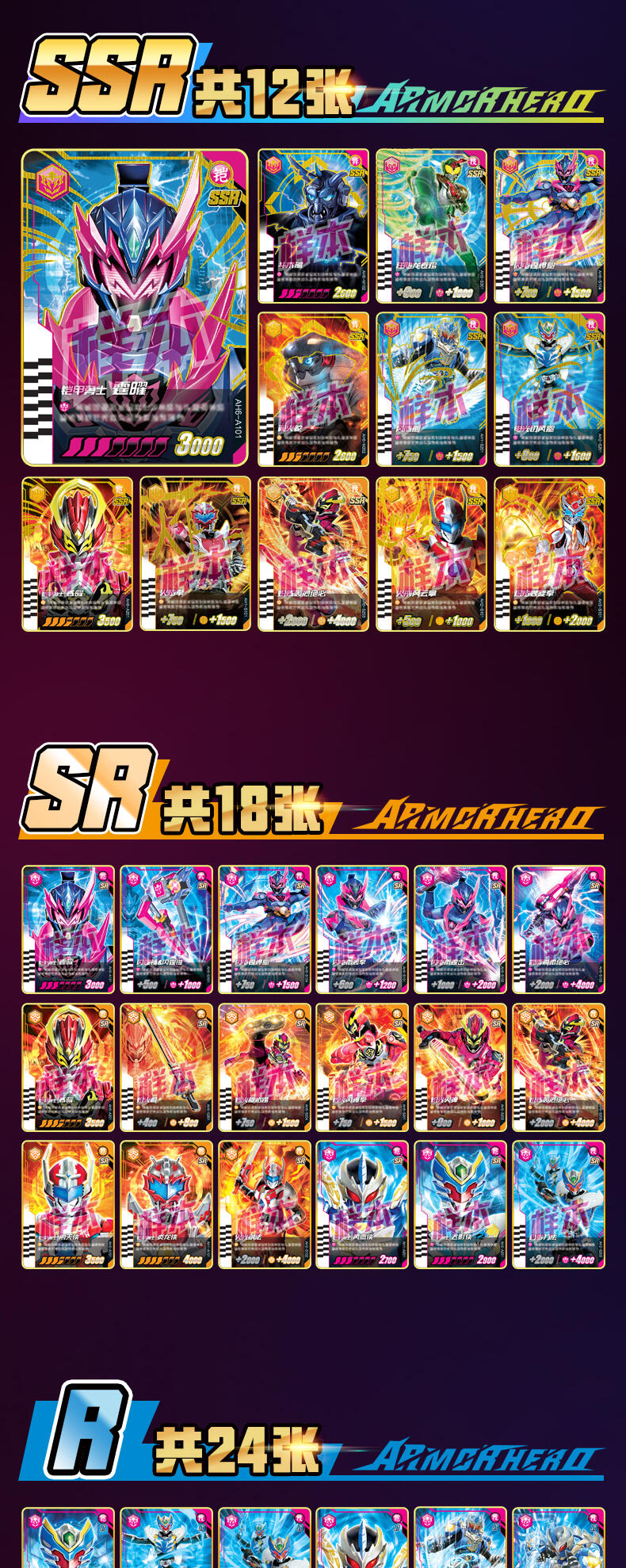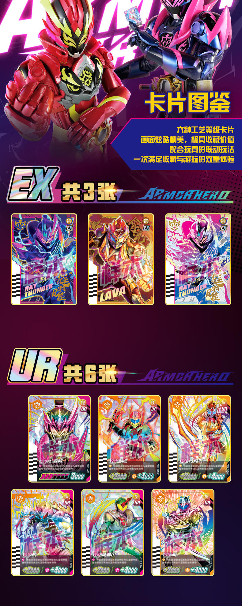 配合高端版腰带召唤铠甲的必要道具。 完美还原剧中卡牌玩法,卡牌插入召唤器主体、铠甲武器,扭动相关按键,触发变身/相关技能声光效果。 卡牌与玩具(腰带、武器)联动,召唤铠甲及发动武器招数的必要道具。 卡牌共四弹,合计170张卡,每一张卡牌都有相应的条码,可识别不同的铠甲变身及战斗技能,总计可触发32位铠甲的技能(包含28位前辈铠甲)。 共计六种工艺等级卡牌,卡牌精美,还有超稀有的异画卡! 内设简易TCG玩法,兼备收藏性与对战性!