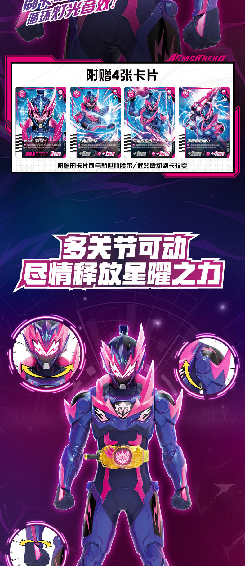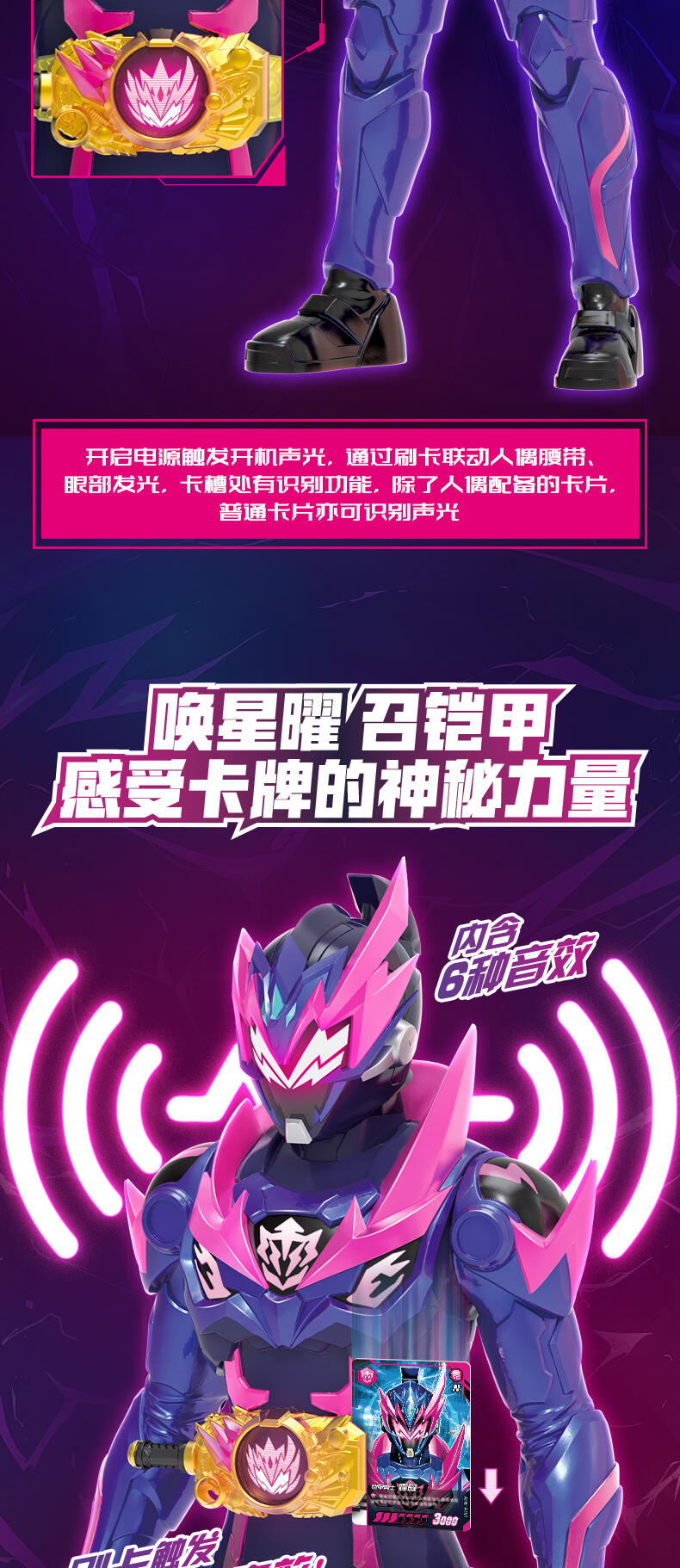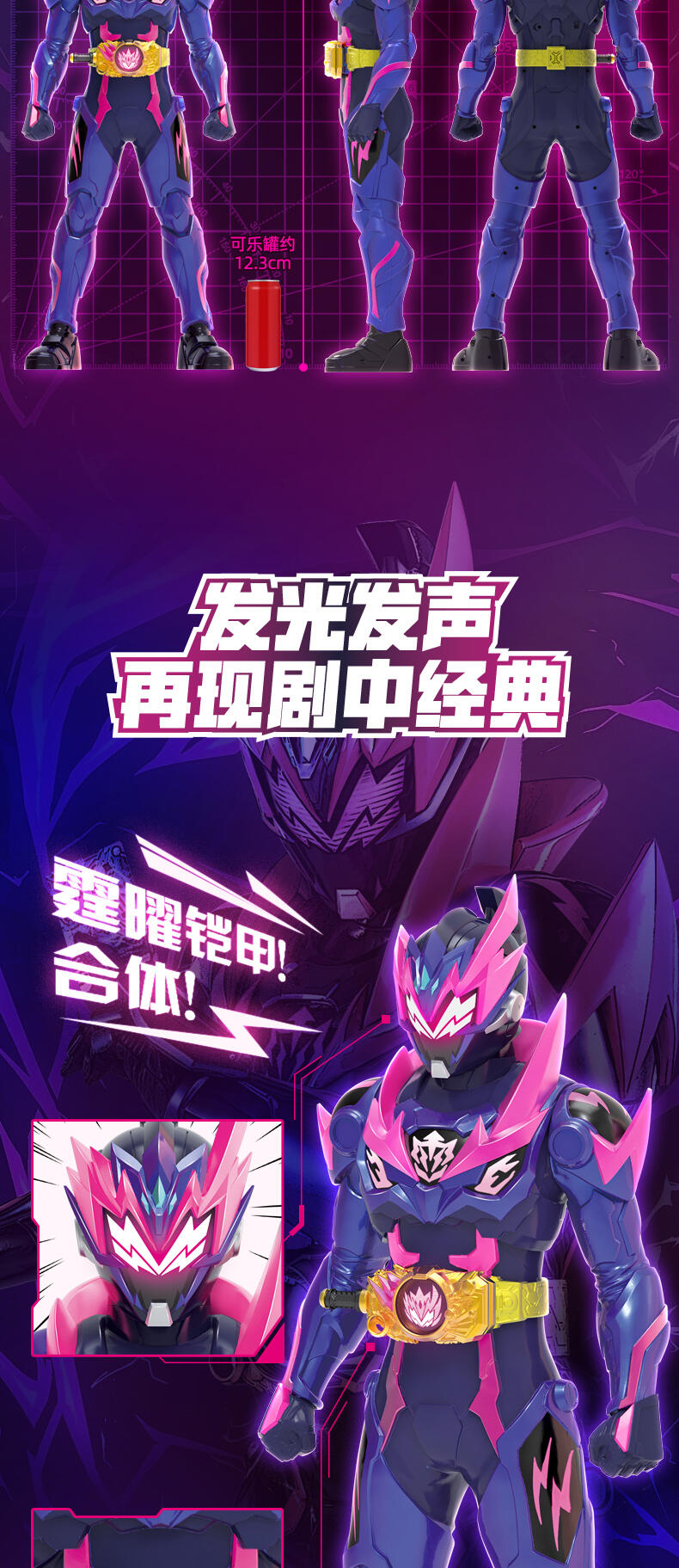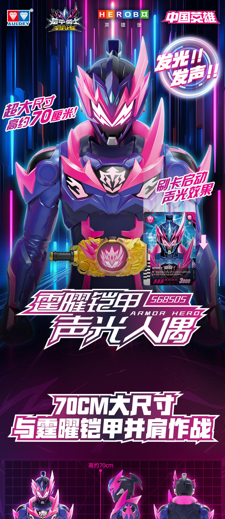 高约70厘米。关节可动,刷卡启动声光效果。眼部腰带可发光。