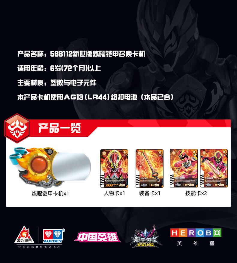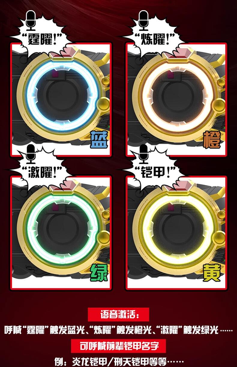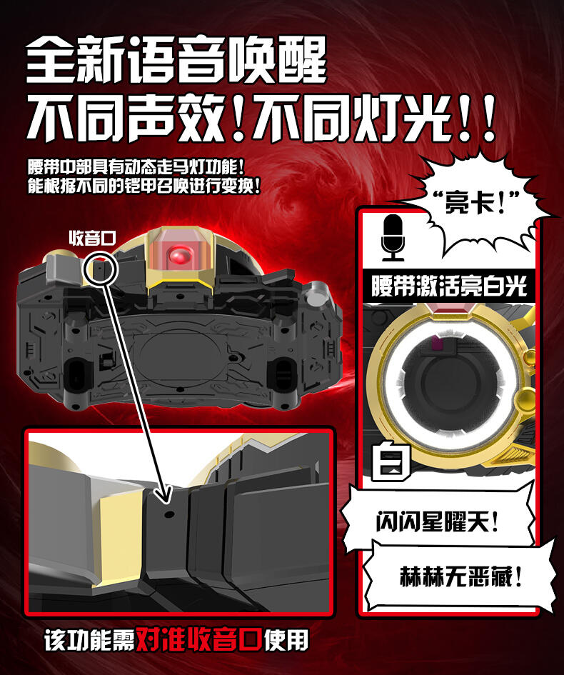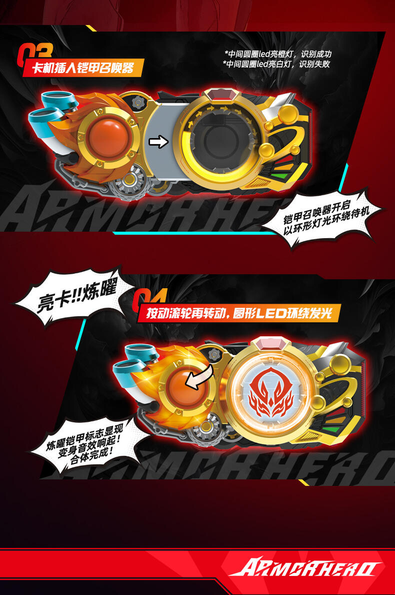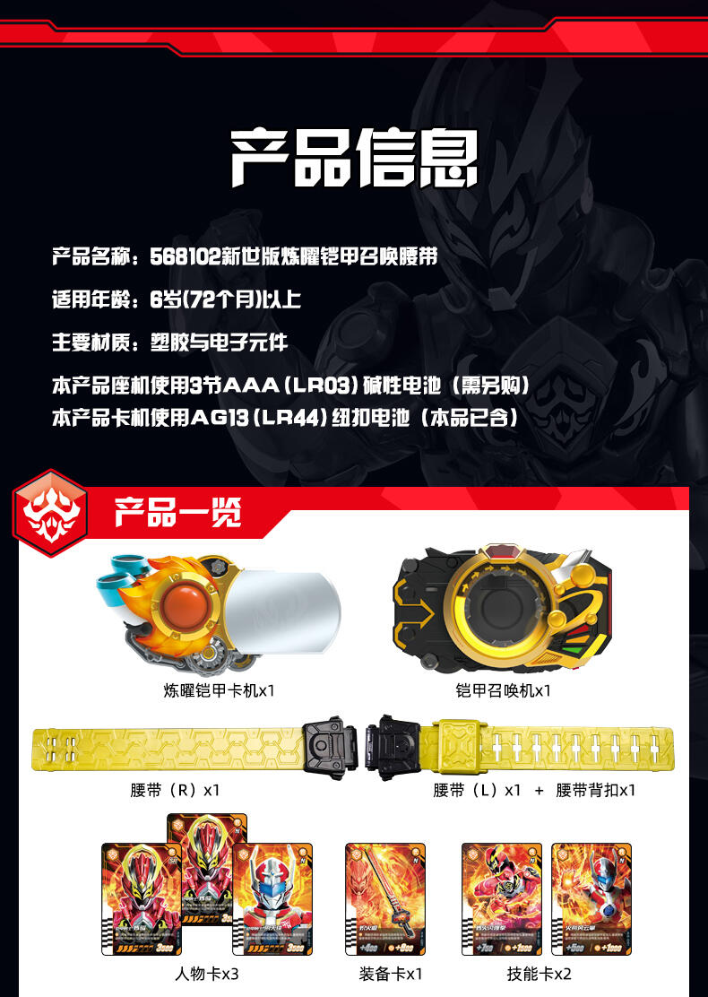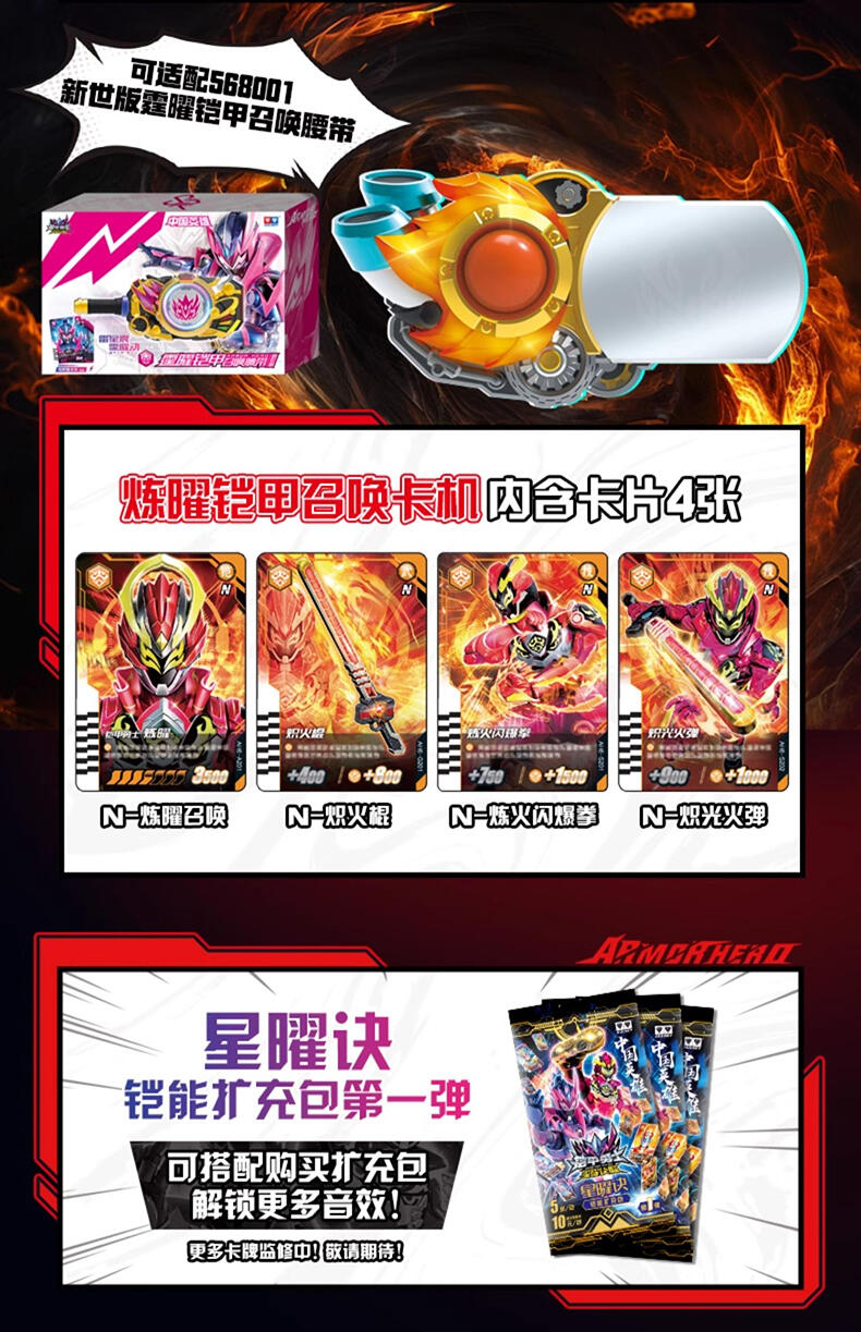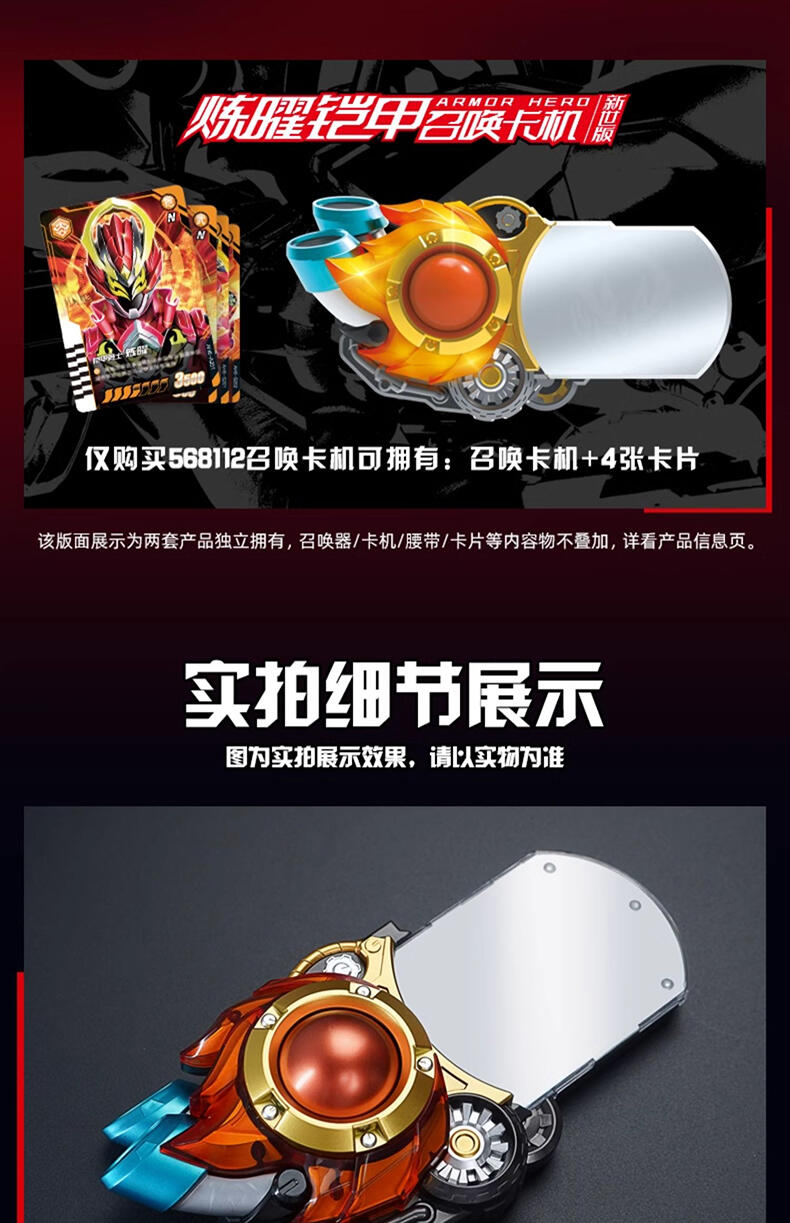 一号铠甲“炼曜铠甲” 高端版召唤腰带。 完美还原剧中变身玩法,卡机插入召唤器主体,扭动卡机把手,伴随酷炫的声光效果,召唤炼曜铠甲~合体! 卡机可实现与片中一致的星曜诀插卡玩法,附送6张星曜诀卡片,总计可召唤32位铠甲(包含28位前辈铠甲)。【需要配合星曜诀卡牌使用,更多卡牌陆续上市中!】 卡机插入腰带并扭动把手后,触发酷炫走马灯光效,炼曜LOGO显现。 腰带主体可实现与剧中一致的技能卡刷卡玩法,变身完成状态下,共计可触发超过160条语音!历任铠甲经典音效集于一体。