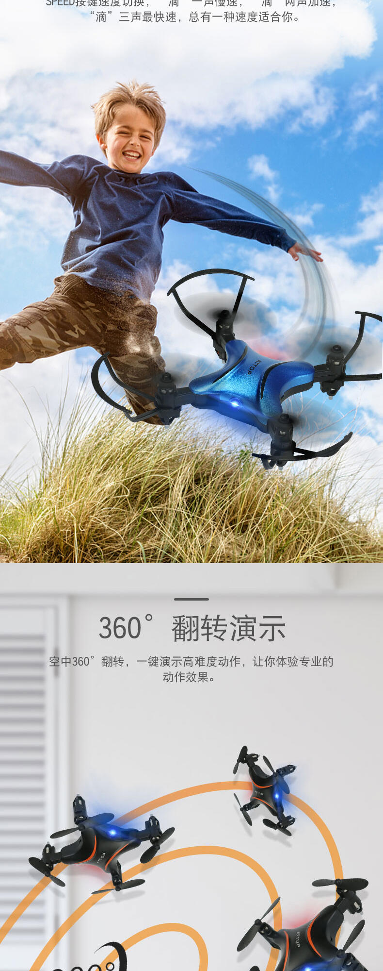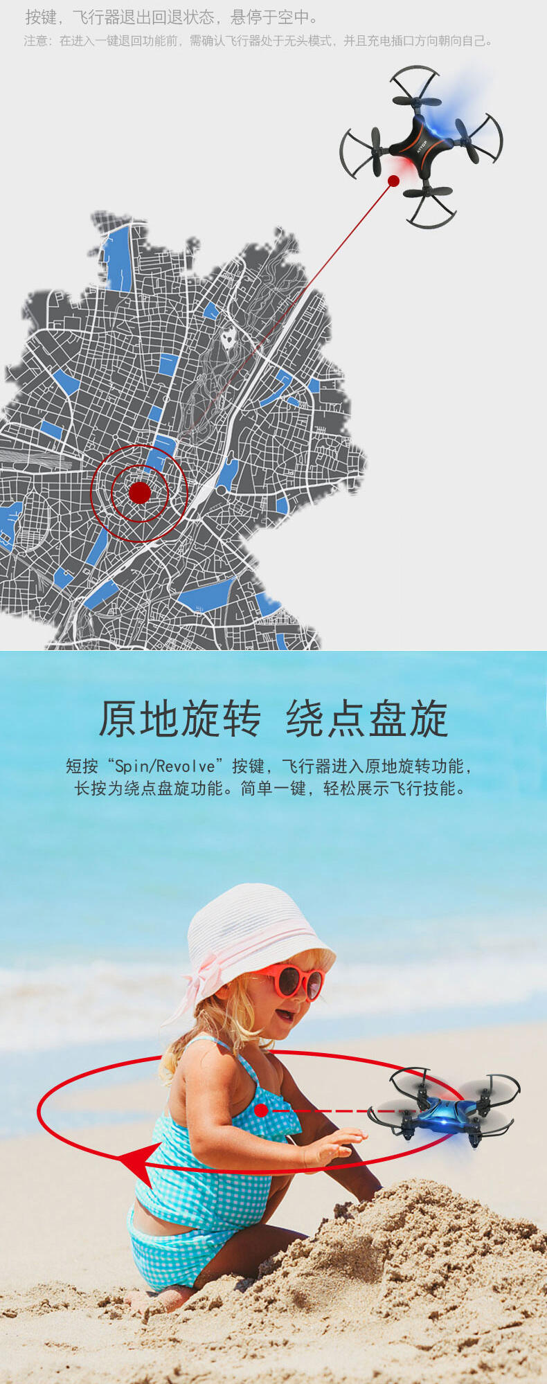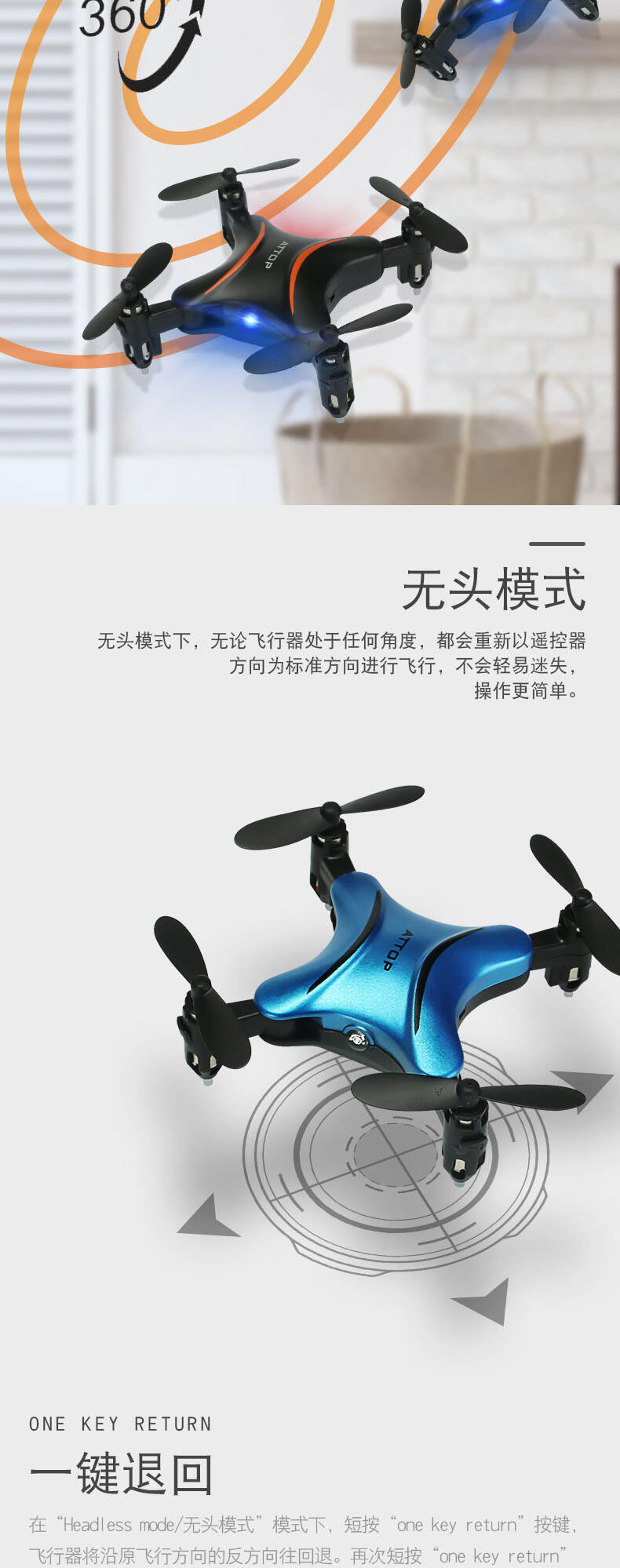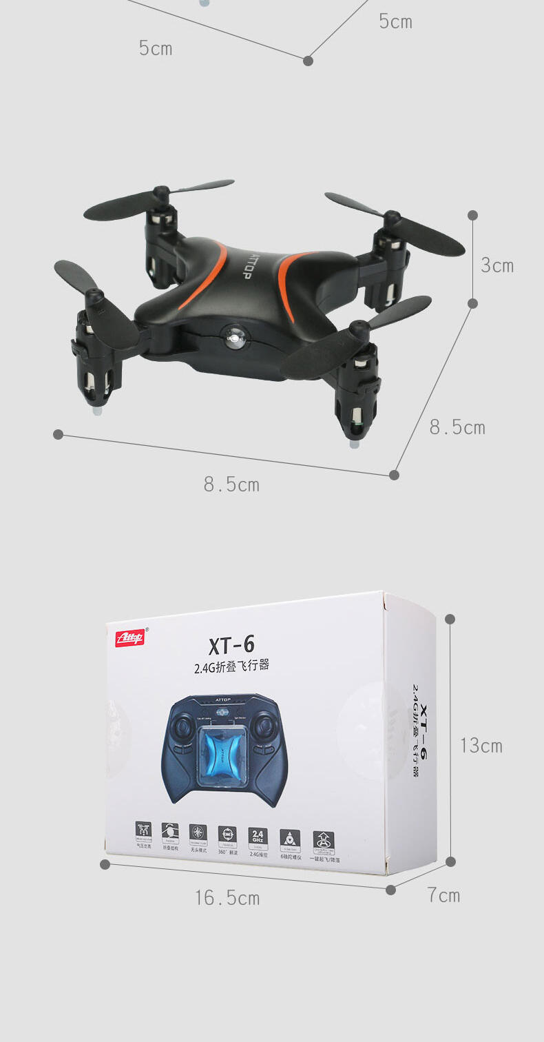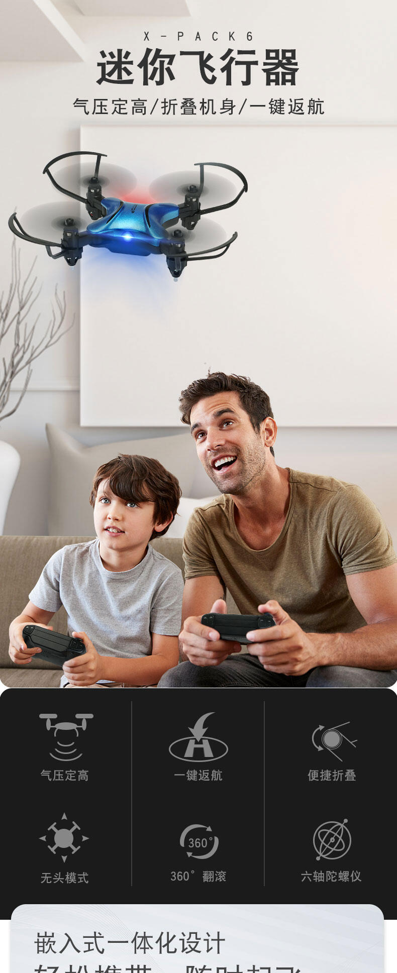 气压定高,折叠结构,无头模式,360度翻滚,2.4G遥控,6轴陀螺仪,一键起飞/降落
