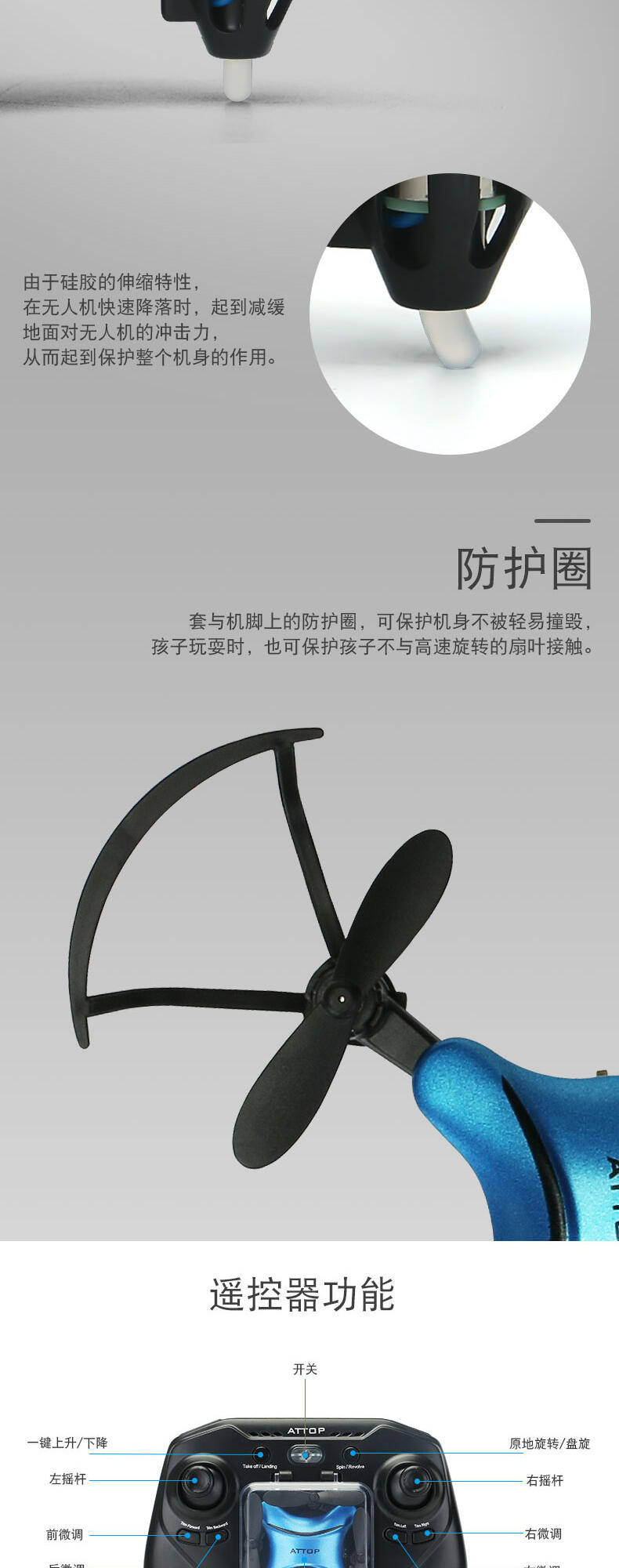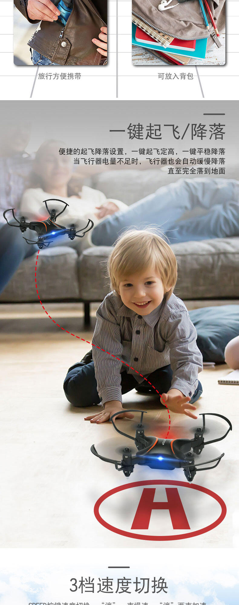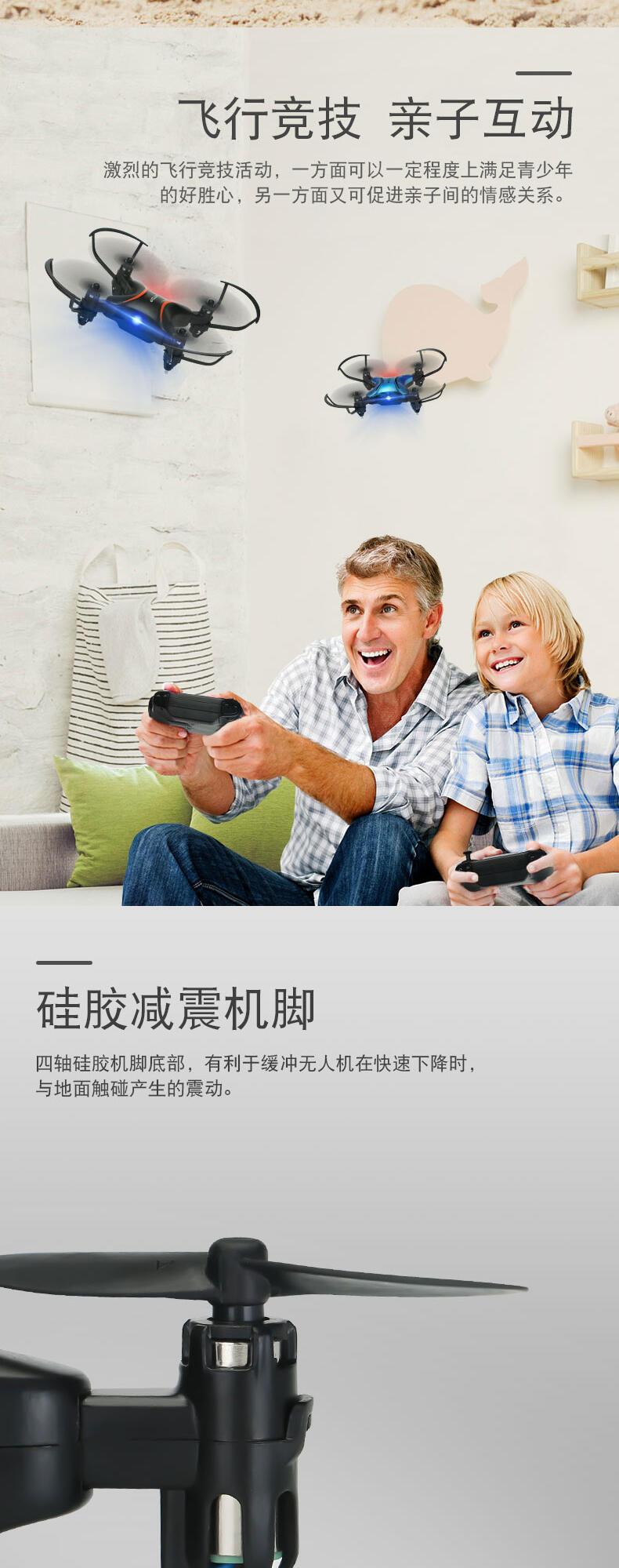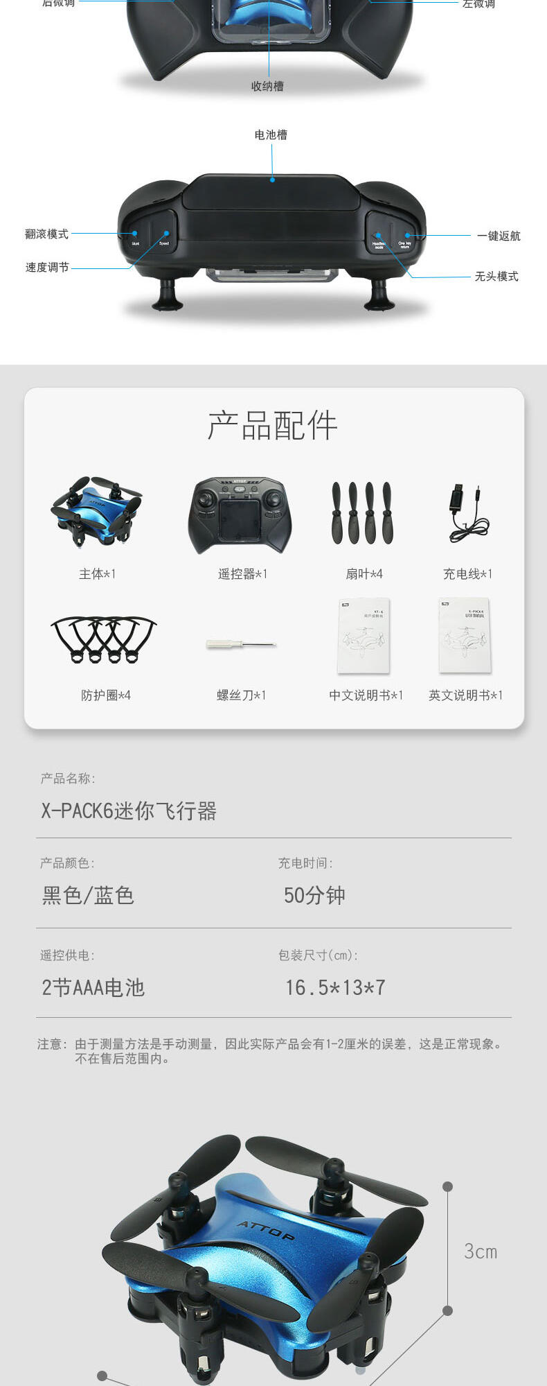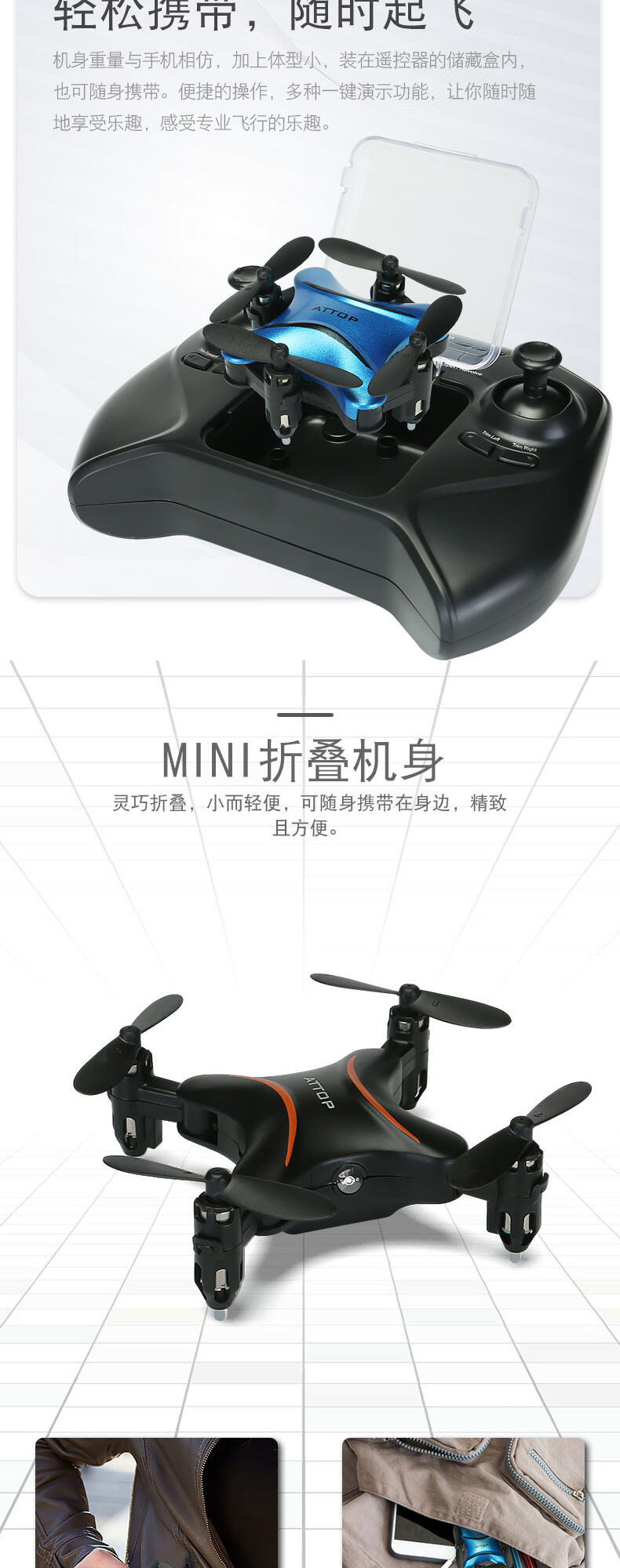 气压定高,折叠结构,无头模式,360度翻滚,2.4G遥控,6轴陀螺仪,一键起飞/降落