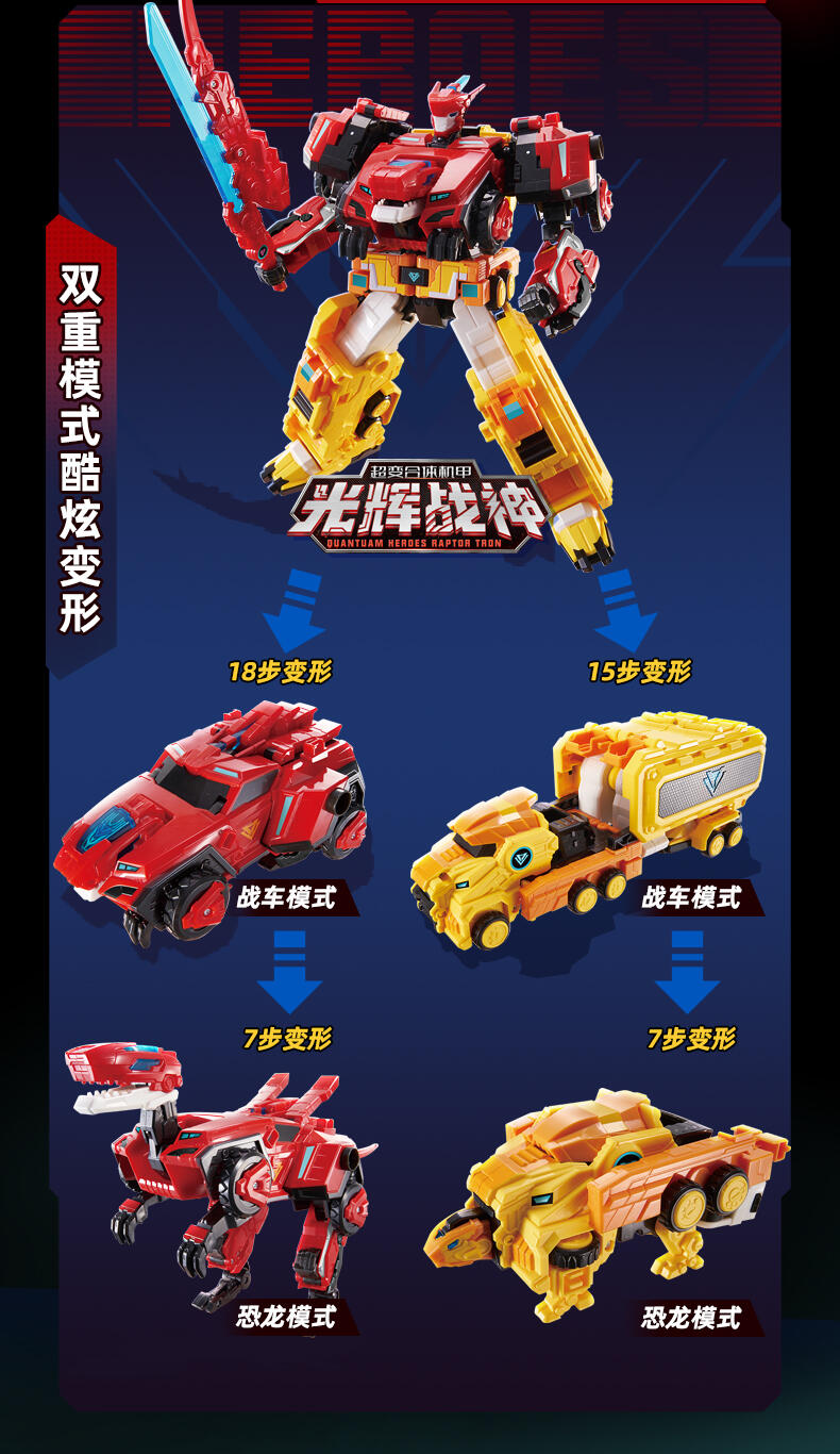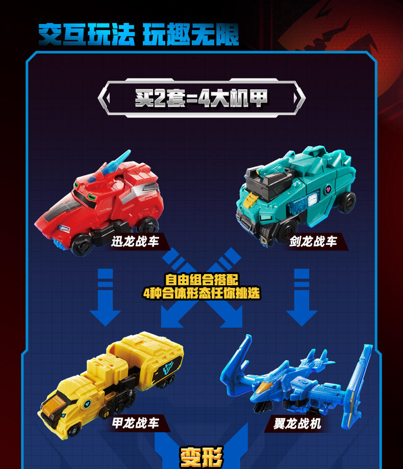 1.变形玩法:两辆车变形合体成超帅机器人,搭配1把酷炫武器