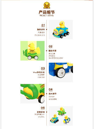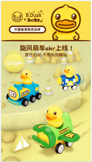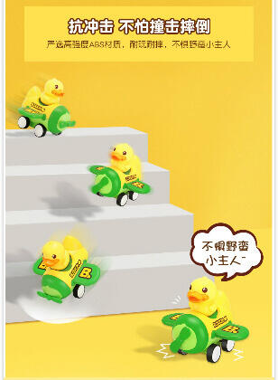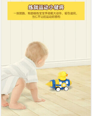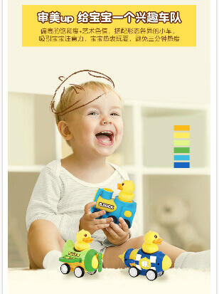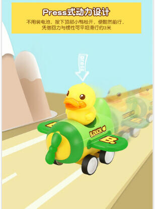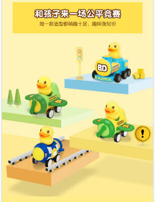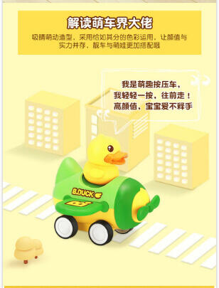 香港B.Duck小黄鸭潮流IP品牌。按压启动惯性行驶,不费电的嗨玩。按压松开,一按一松间,凭借回力与惯行滑行约3米。内置回力牙箱,可反复滑行,尽情玩耍。大小适中,轻松拿握,出门携带方便。可爱的交通车队造型,带上小车去冒险。PVC弹性橡胶车轮,抗压耐磨,行驶平稳不易侧翻.