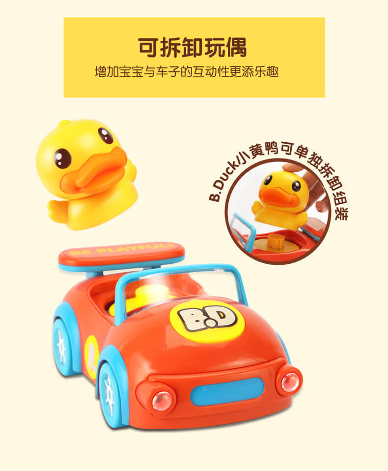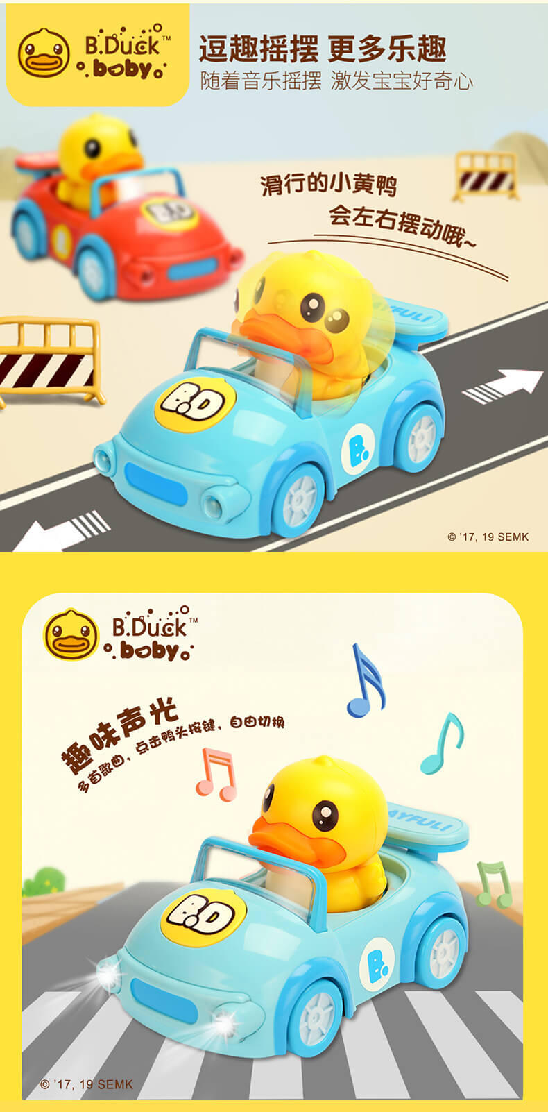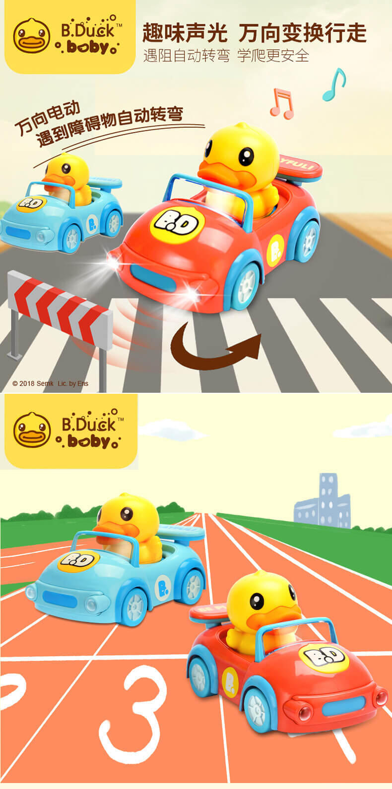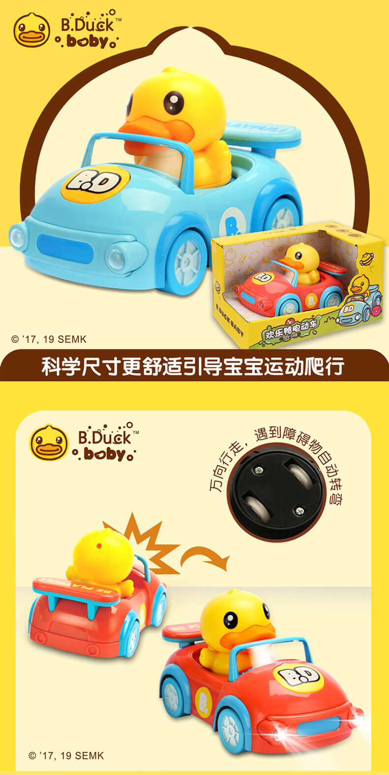 萌趣学爬小汽车,小黄鸭陪伴宝宝欢乐成长!Q萌有趣,宝宝爱玩。卡通小黄鸭手推车动感设计,拒绝枯燥。电动前进,小鸭子随着车子前进会左右摇摆滑行,趣味声光,欢乐相伴,多首歌曲灯光随着音乐闪烁,按压车头按键即可开启。万向行走,无惧碰撞,360度电动万向行走遇到障碍会自动转弯,引导宝宝行走。可拆卸玩偶,增加宝宝与车子的互动性,更添乐趣;抗冲击,无惧蛮力碰撞,圆润边角,不伤宝宝小手。