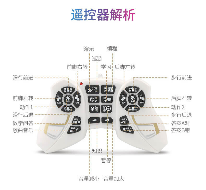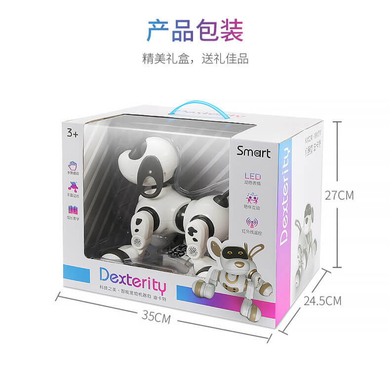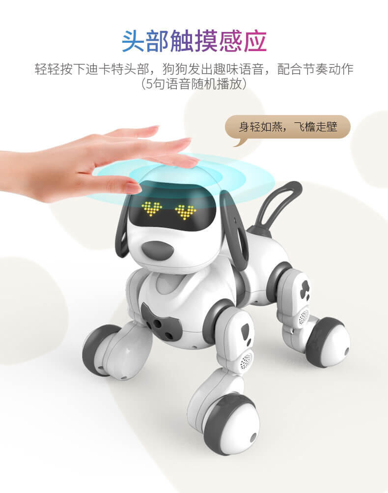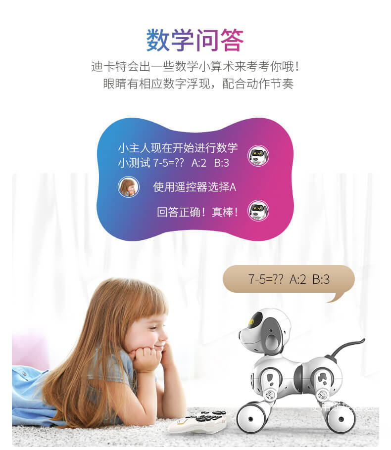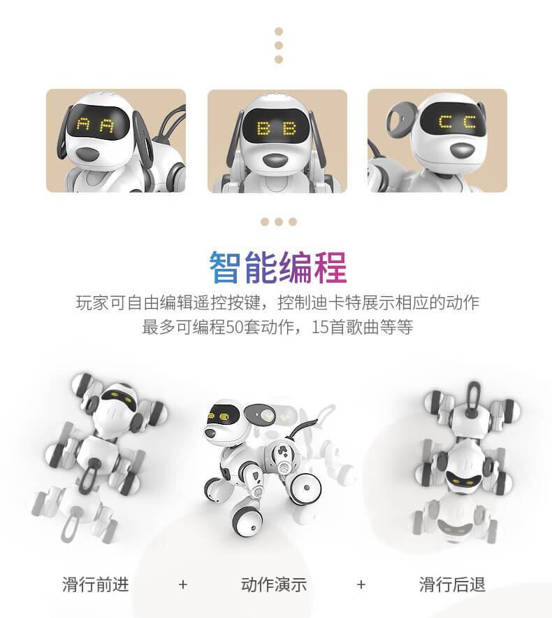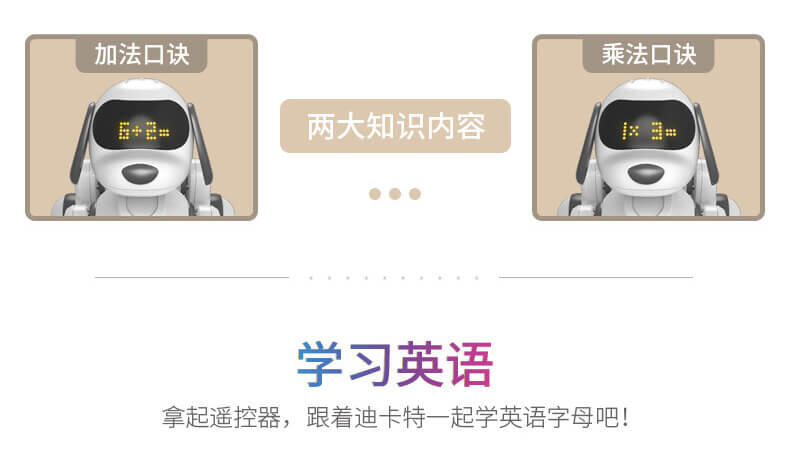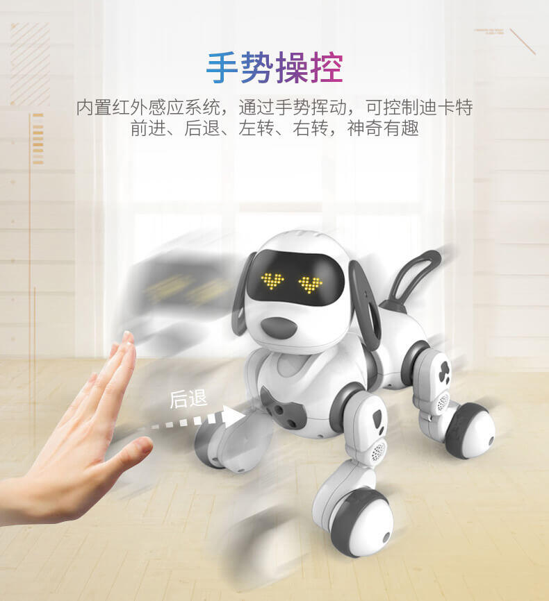智能萌宠乐趣陪伴,迪卡特可以陪你聊天,逗你开心,它不仅可以陪伴孩子玩耍,也能够装饰家居,给生活增添生气。他拥有一身的本领一起来玩耍,增添你的生活乐趣,可以用手势来操控它,内置红外感应系统,通过手势挥动可以控制的卡特前进后退,左转右转。问他一些数学小算数,可以让孩子更快地接触到数学小知识。还可以学习英语,拿起遥控器跟着迪卡特一起学习英语字母,睡前听一听故事知识,还可以帮助孩子进入睡眠,她还能歌善舞,内置多首歌曲播放,同时搭配舞蹈动作,一起舞动起来吧,丰富的led表情让他不是那么的冷冰冰。