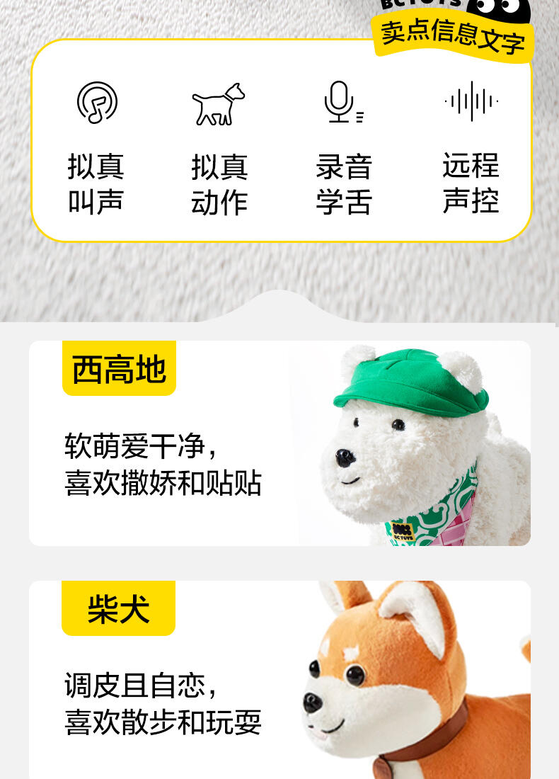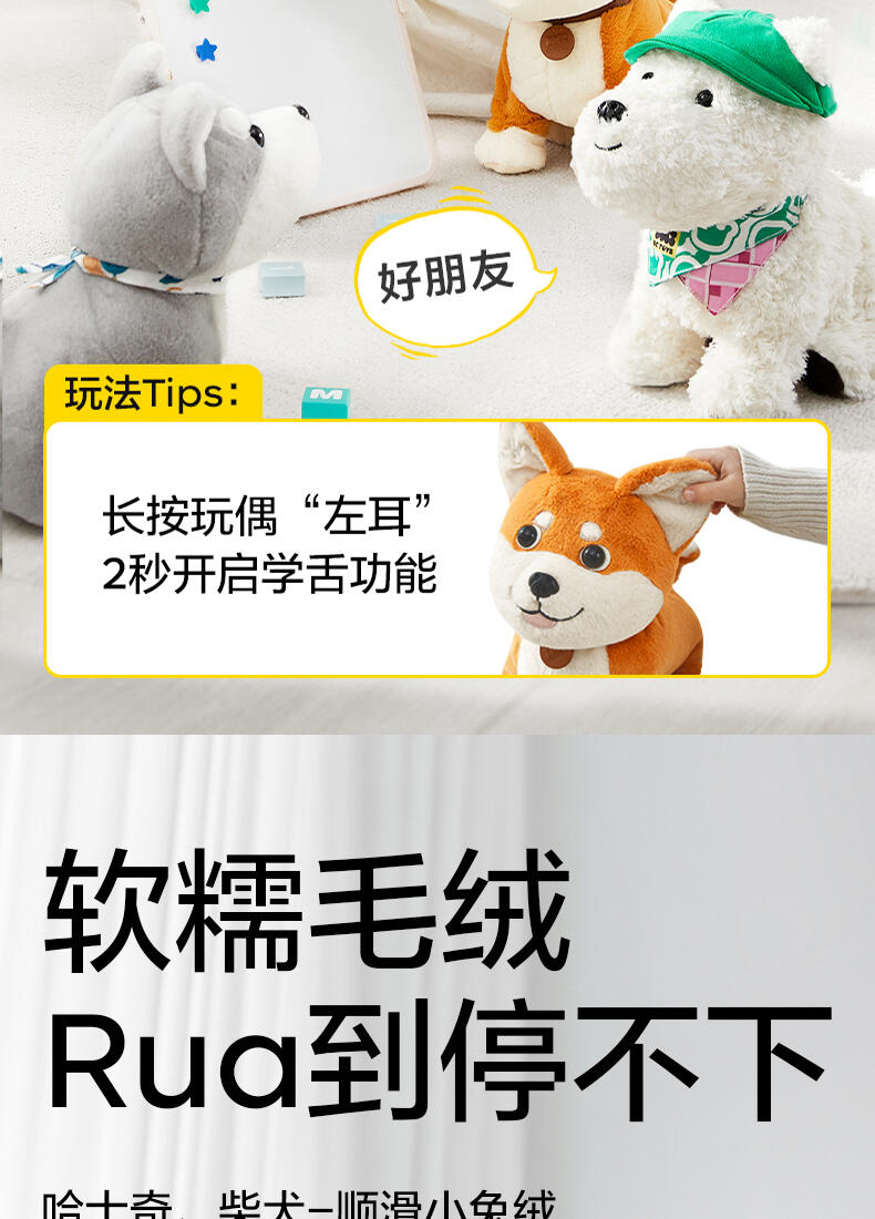 特别柔软手感,还原真实毛感。通过语音/动态/装扮互动做很好的孩子的成长伙伴,给孩子和家长双方提供情绪价值
