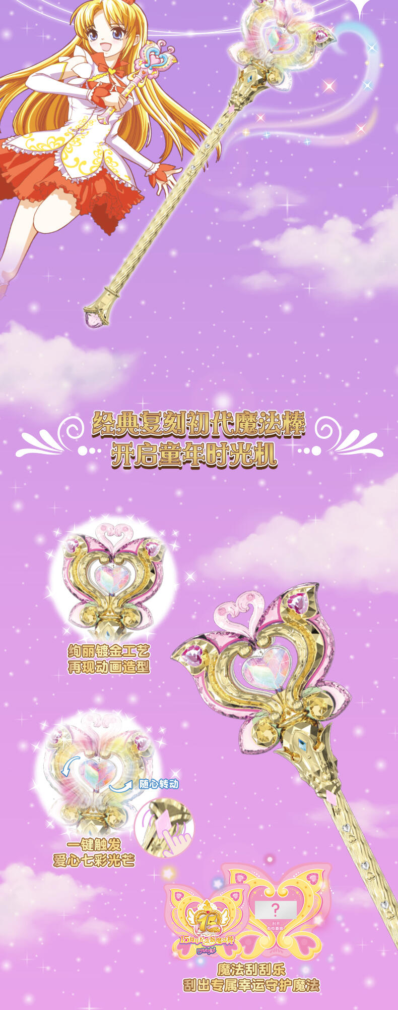 按开开关,挥动魔法棒,梦幻灯光闪烁,爱心随之旋转,开启魔法少女之旅;吊卡另附魔法刮刮乐,趣味加倍。