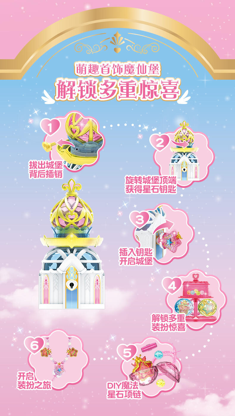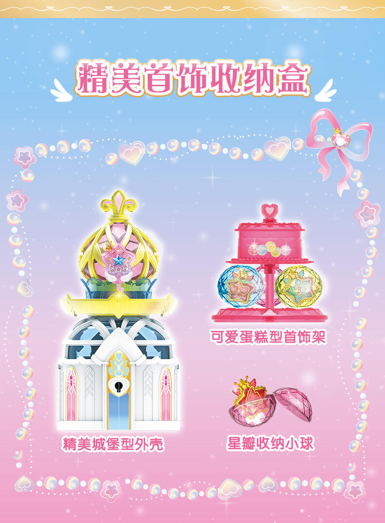 3. 星石有打开和关闭2种形态,城堡尖顶内置星石,旋转打开取出星石,插入城门孔位,可打开城堡,城堡内置独创首饰架方便收纳。上层蕴藏炫彩宝珠,下层彩球包裹项链配饰,随心搭配,动手串链,尽享DIY乐趣。