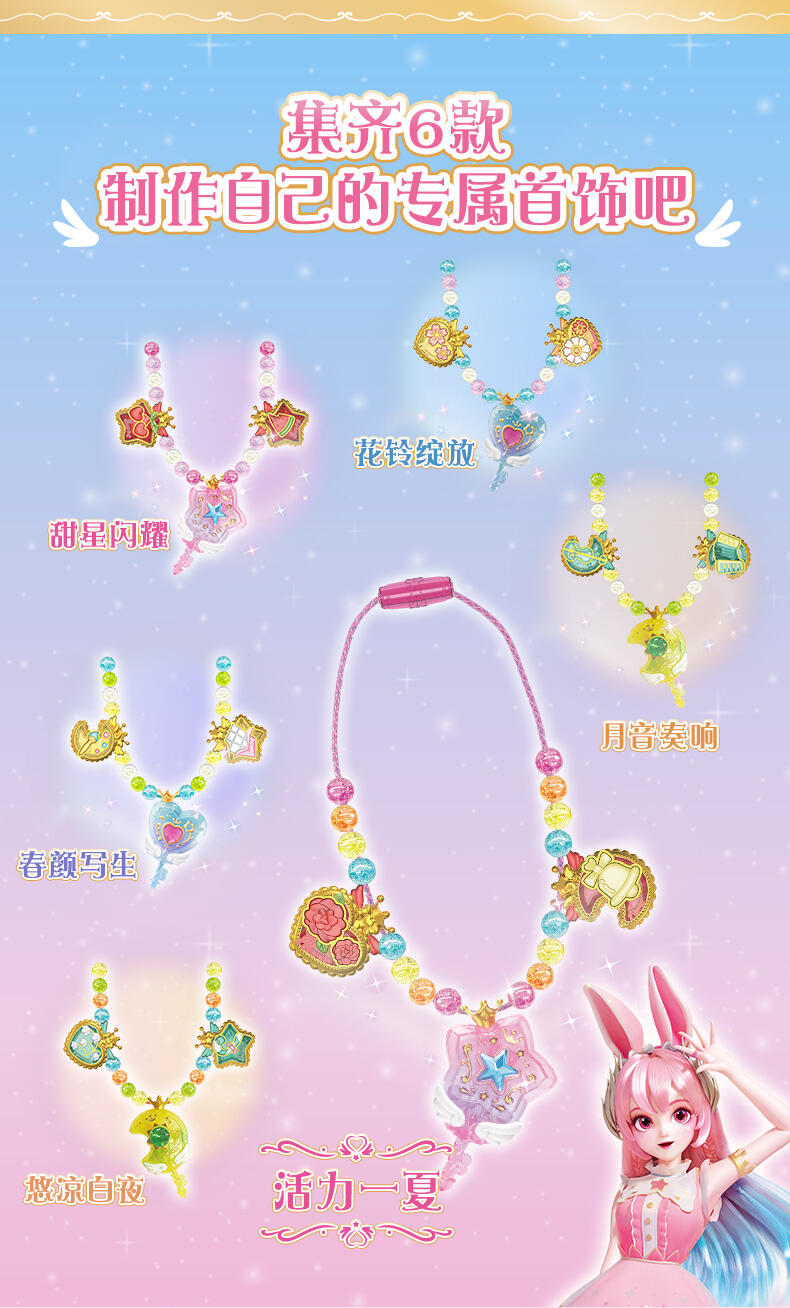 4. 趣味盲盒玩法惊喜多多,六大缤纷主题,全套集齐12颗限定闪耀星瓣,色彩炫彩透亮,超值超惊喜!小朋友随机获得不同款式和色彩的星石、星瓣、珠子、绳子进行搭配,串成专属项链。