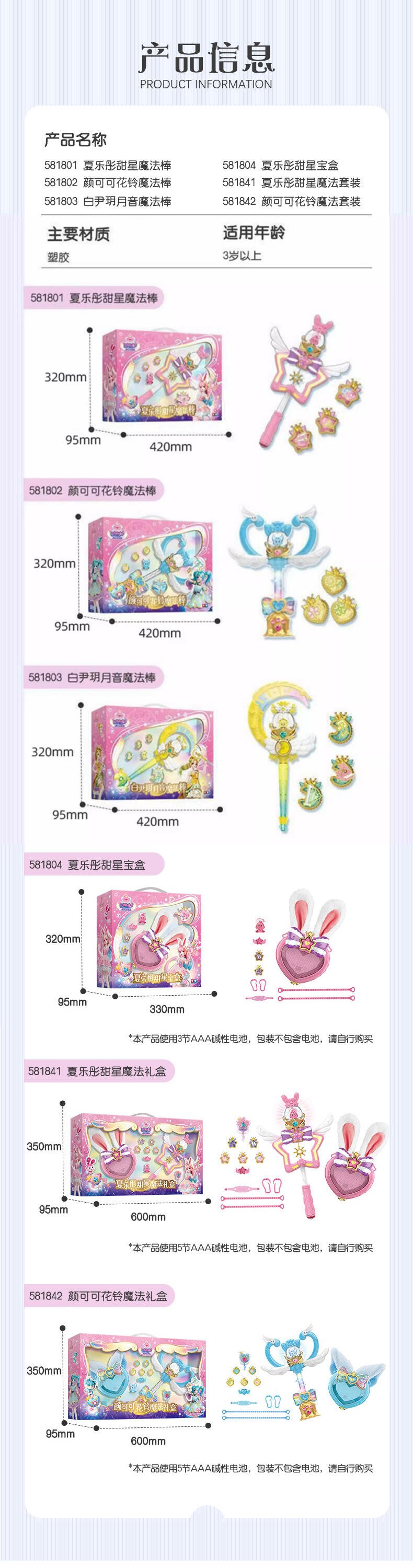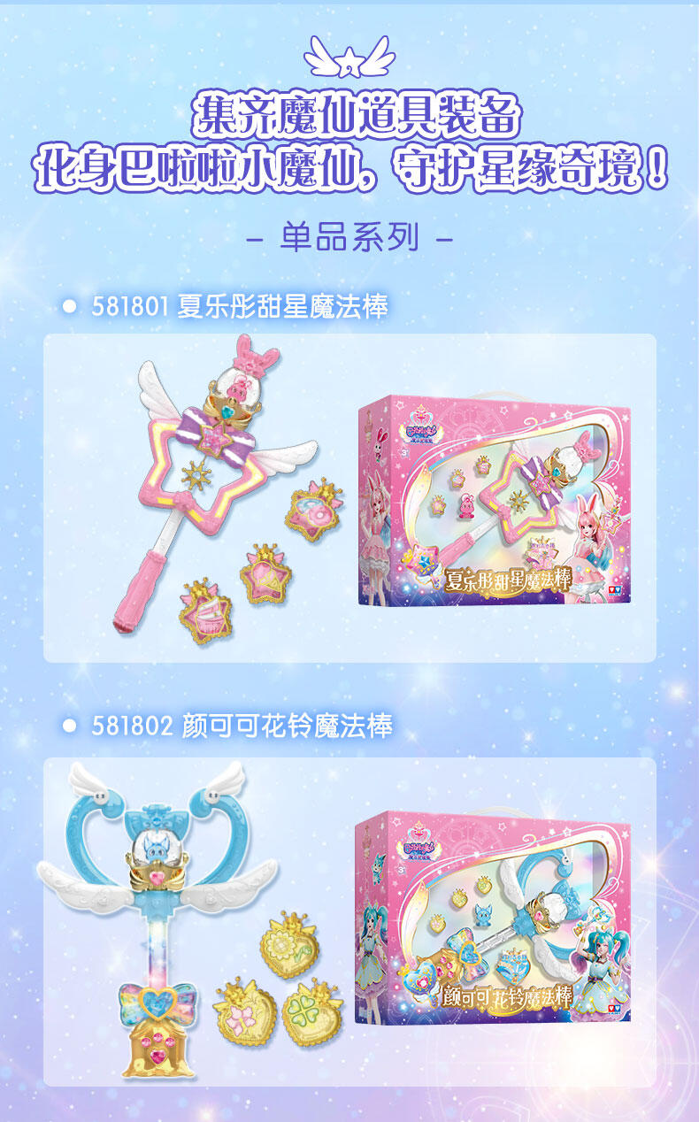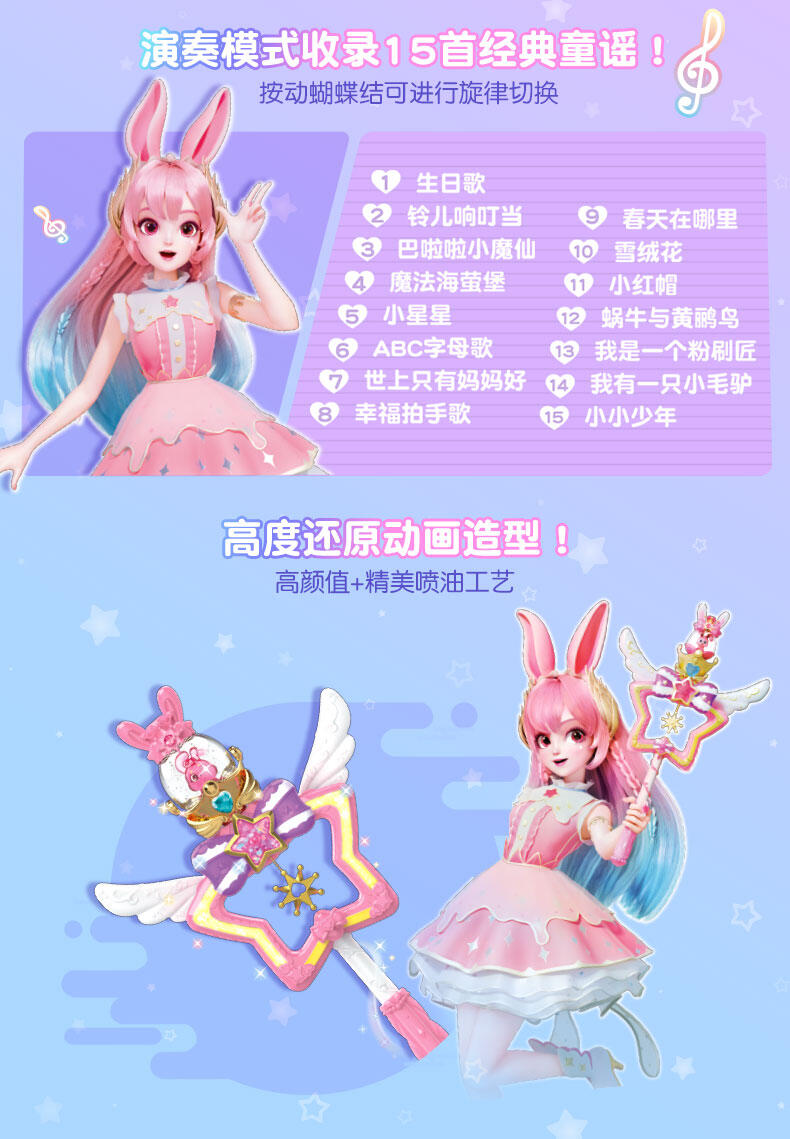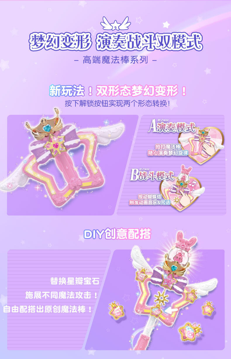 1. 演奏战斗双模式:演奏模式摇晃魔法棒自由创作演绎15首乐曲;战斗模式一键触发巴啦啦咒语&声光效