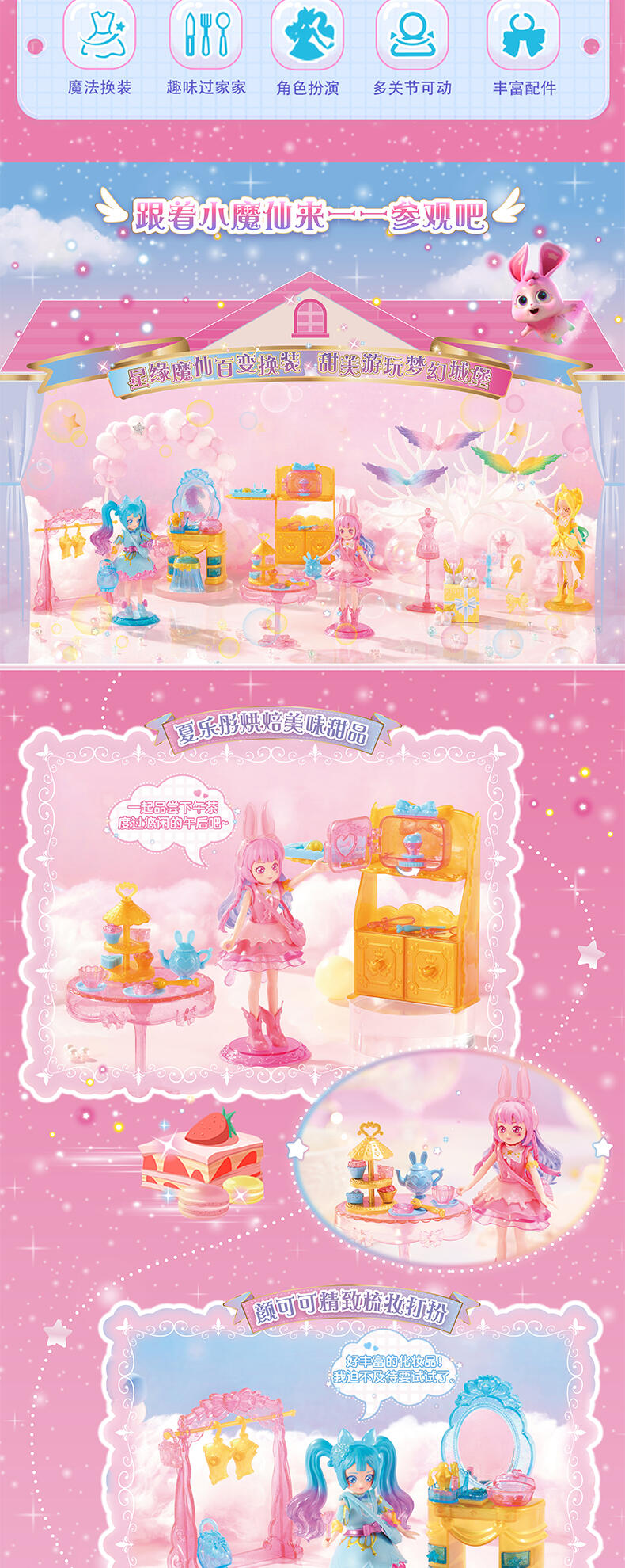 - 130+丰富配件,3个主角人偶,9款精美服装,尽情百变换装。 更有过家家场景玩法,和夏乐彤品尝美味甜品,和颜可可一起梦幻梳妆,与白尹玥互换精美服装。 神奇魔法小盒,拆出惊喜配件。