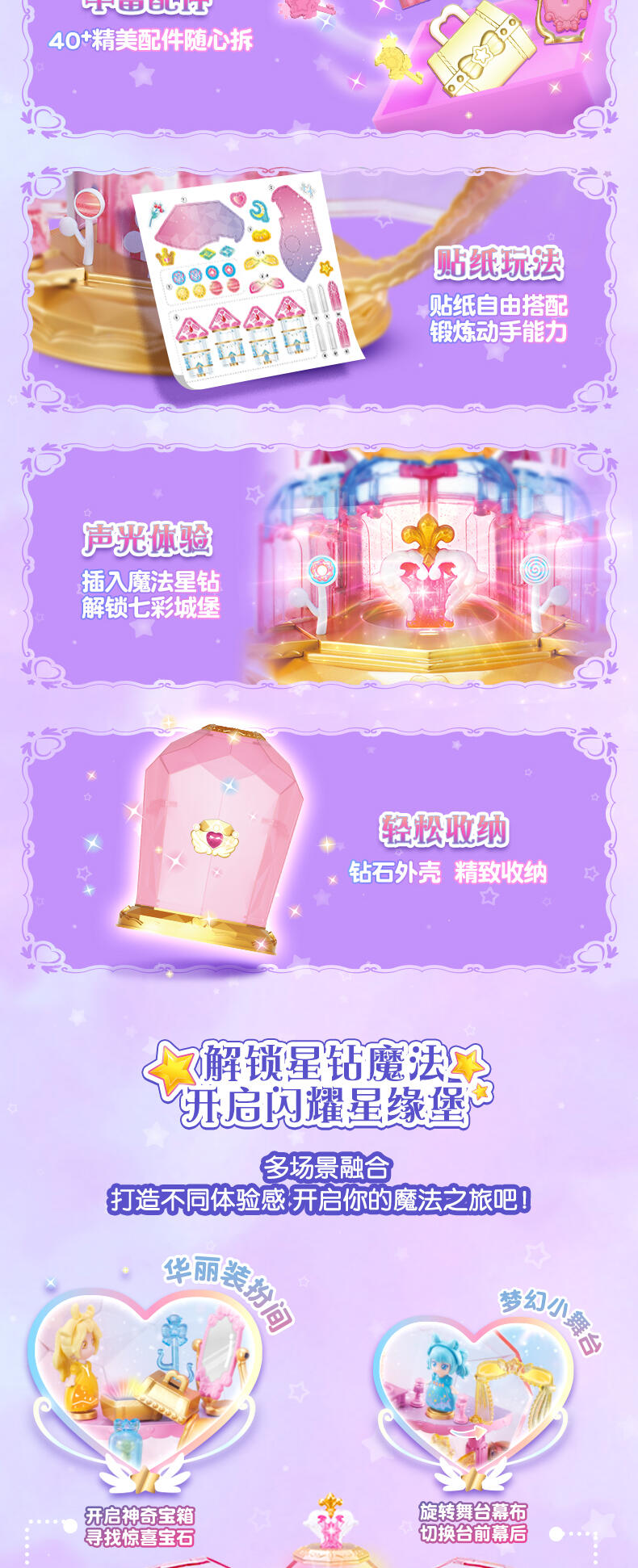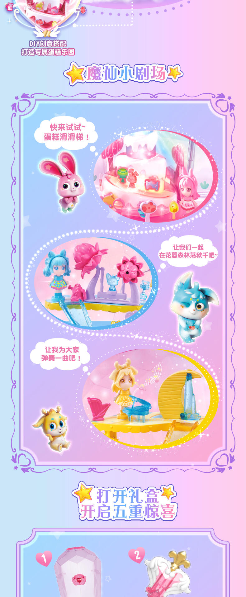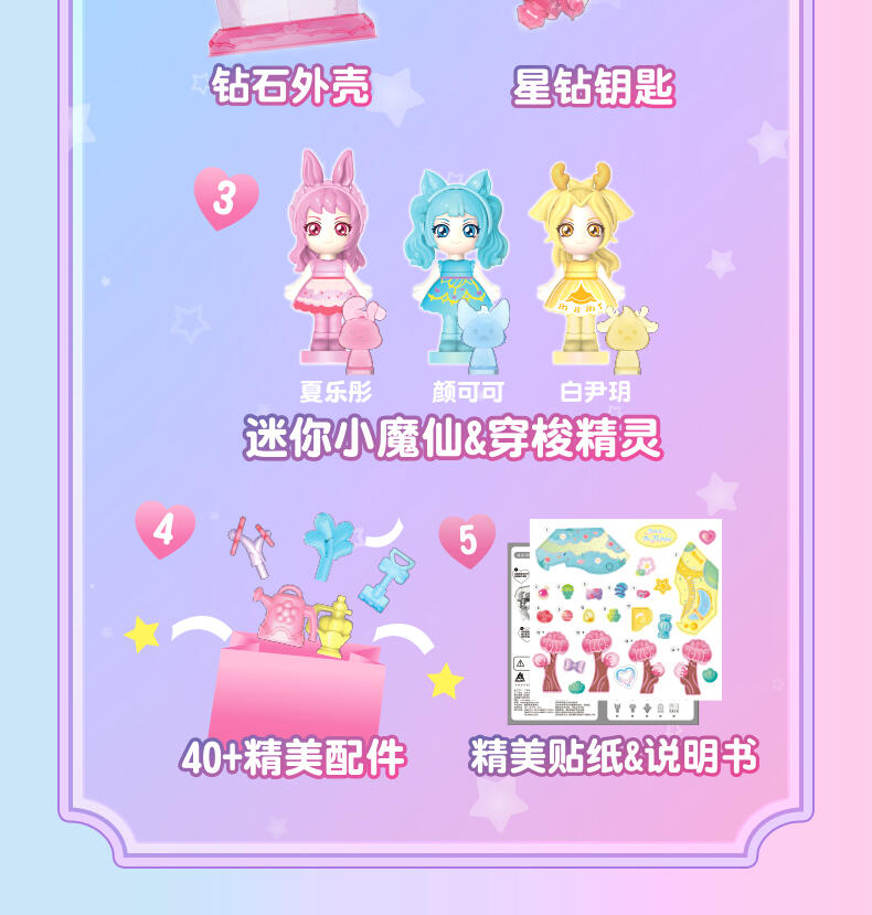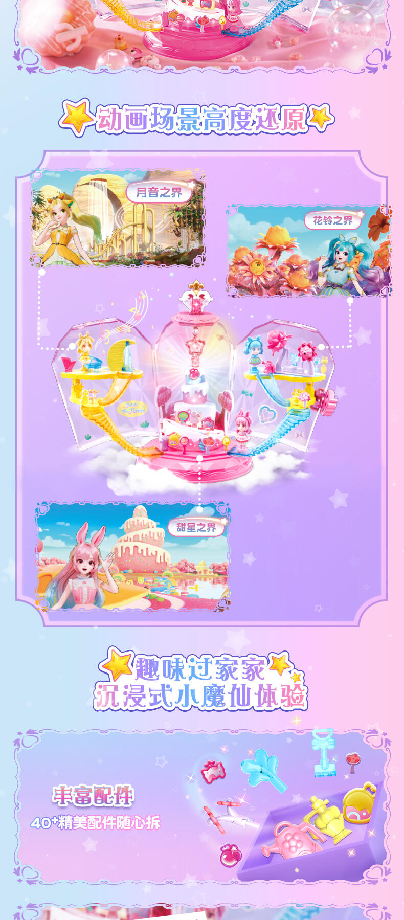 40+丰富配件,趣味过家家,配备多只人偶/宠物,可化身华丽小魔仙身临奇境