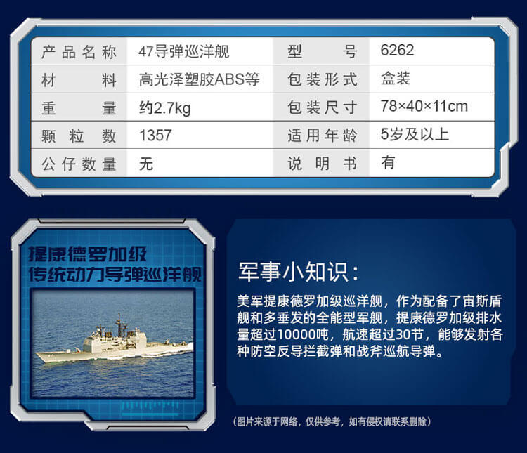 1.该产品紧贴军事热点主题,配备了宙斯盾舰和多垂发的全能型军舰,提康德罗加级排水量超过10000吨,航速超过30节,能够发射各种防空反导拦截弹和战斧巡航导弹。