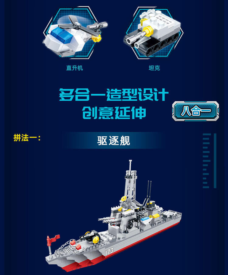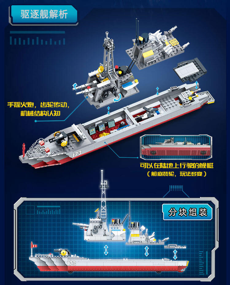 该产品紧贴军事热点主题,模拟垂发装置及驾驶舱场景,舰载导弹发射仓、直升机停机坪、两栖坦克装载仓