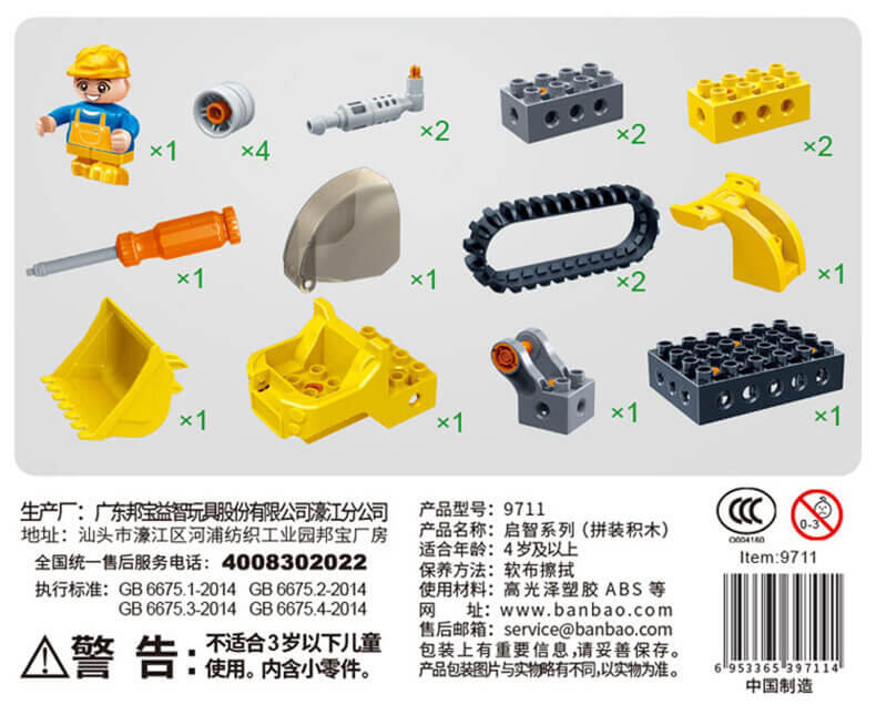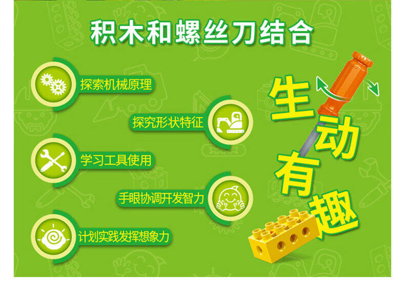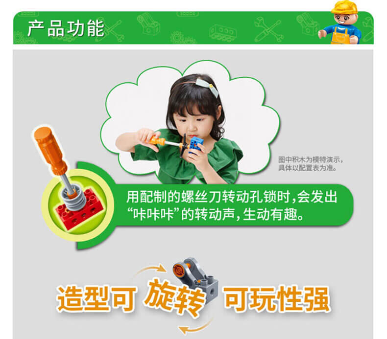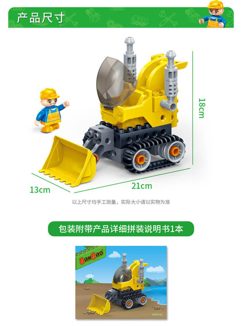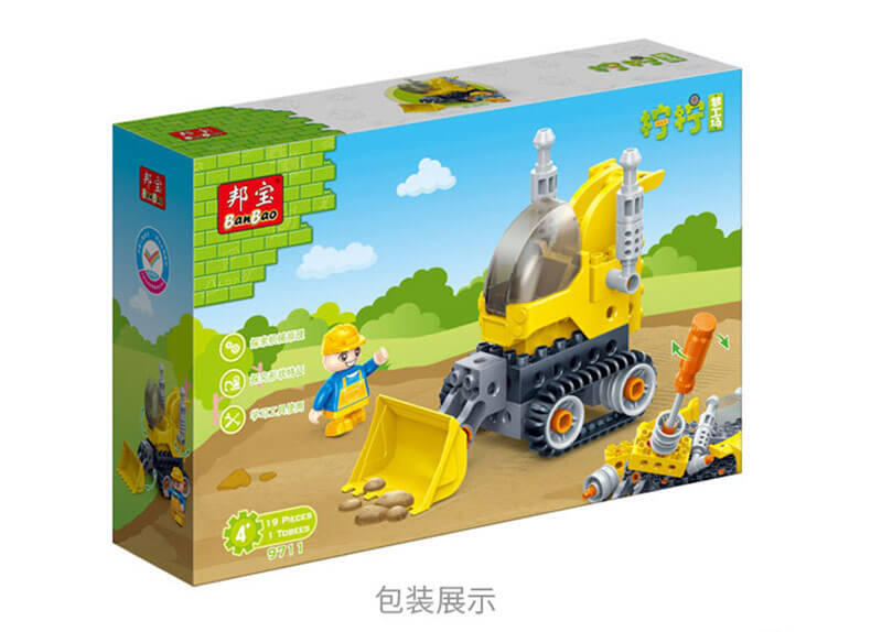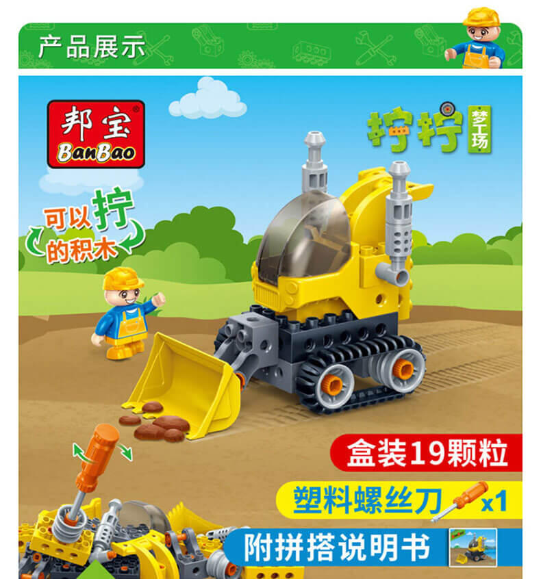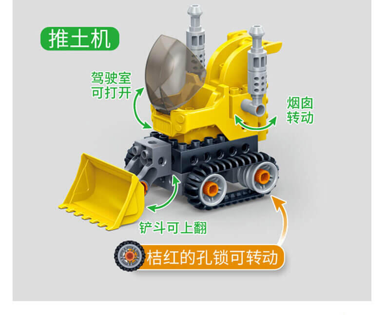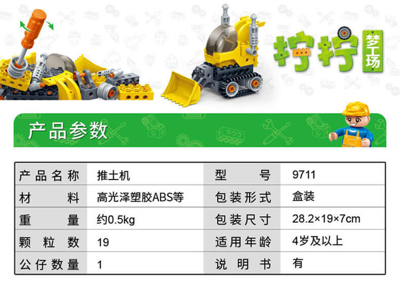 该商品采用高光泽的塑料ABS等材质制作,积木和螺丝刀相结合,非常的生动有趣。可以帮助宝宝探索机械原理,探究形状特征,学习工具如何使用,也可以帮助孩子进行手眼协调开发智力计划实践,发挥想象力。该商品是一款可以拧的积木,包含19个颗粒。附送塑料螺丝刀一个以及拼搭说明书,用配置的螺丝刀转动锁孔时会发出咔咔的转动声,生动有趣,可玩性强,推土机的驾驶室是可以打开的,烟囱也是可以转动的,翻斗可以往上翻。