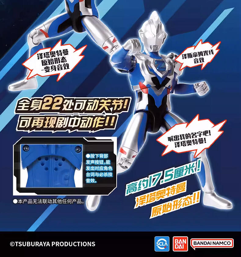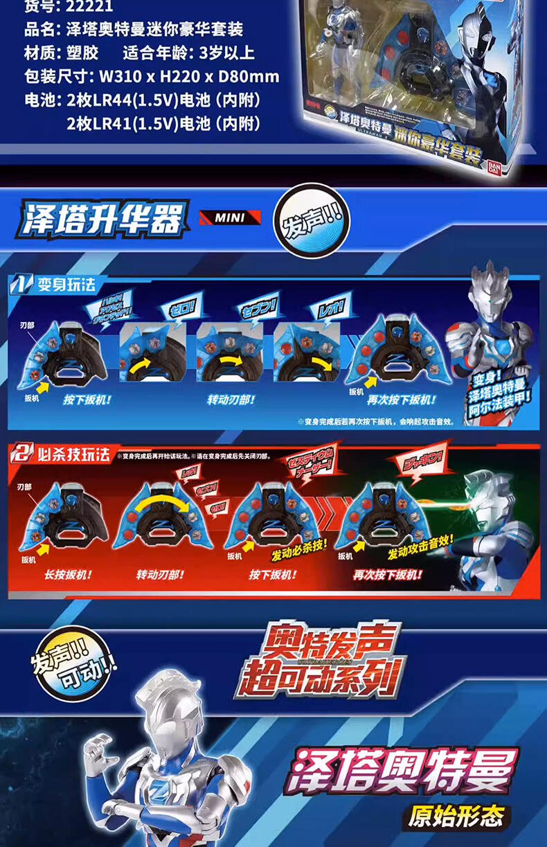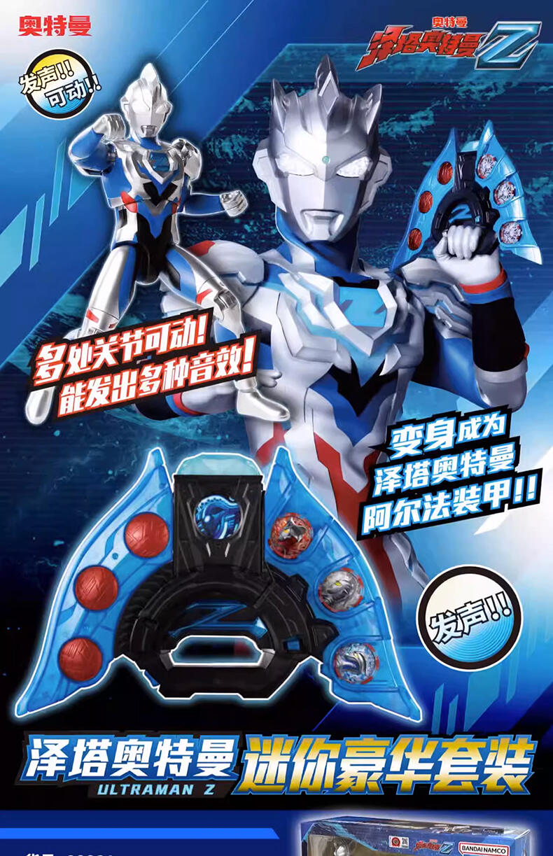 泽塔奥特曼迷你豪华套装,套装包含迷你泽塔升华器、发声超可动人偶 泽塔布奥特曼原始形态,迷你泽塔升华器可发声,按下扳机变身为泽塔布奥特曼 原始形态;发声超可动人偶 泽塔布奥特曼 原始形态全身多出可动,可以播放各种台词